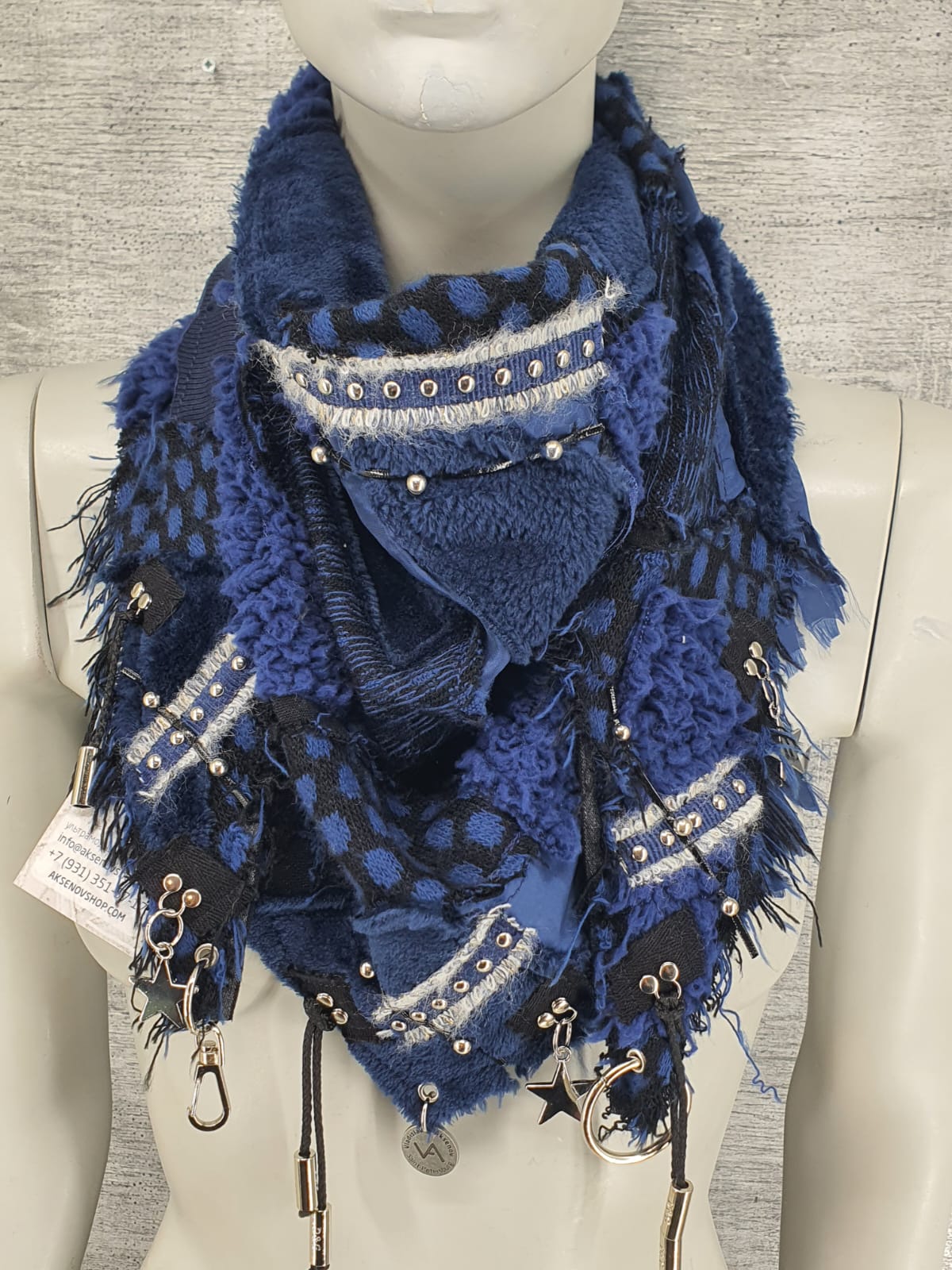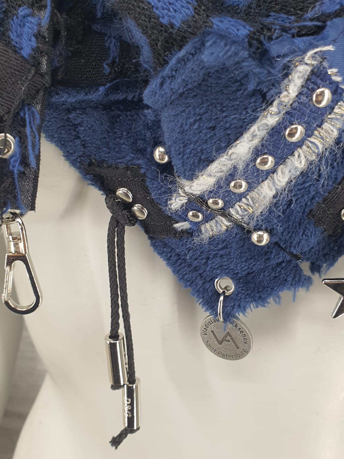 Шарф из разных тканей и меха, на основе из чёрного хлопка, декорирован различными лентами и подвесами.