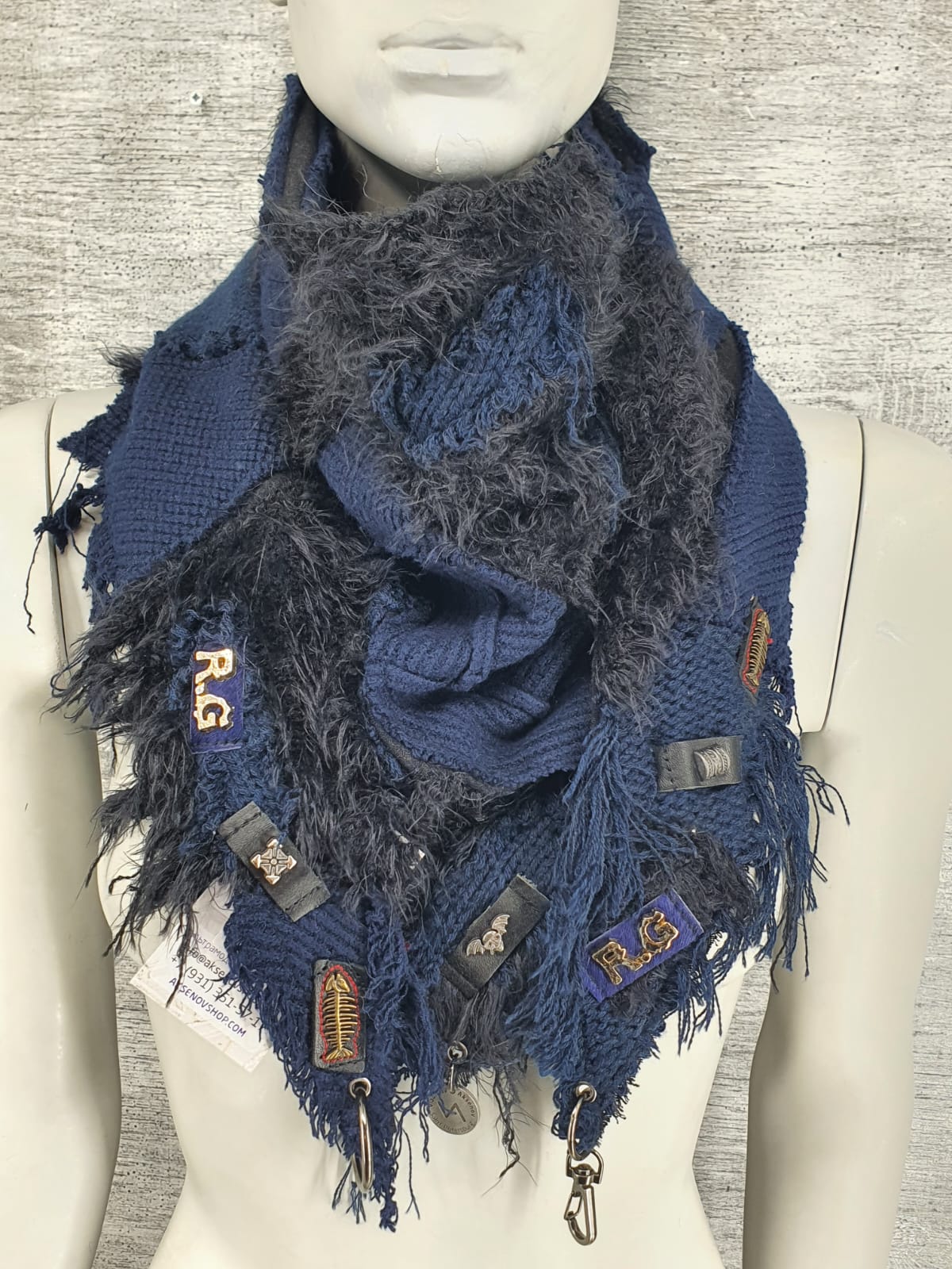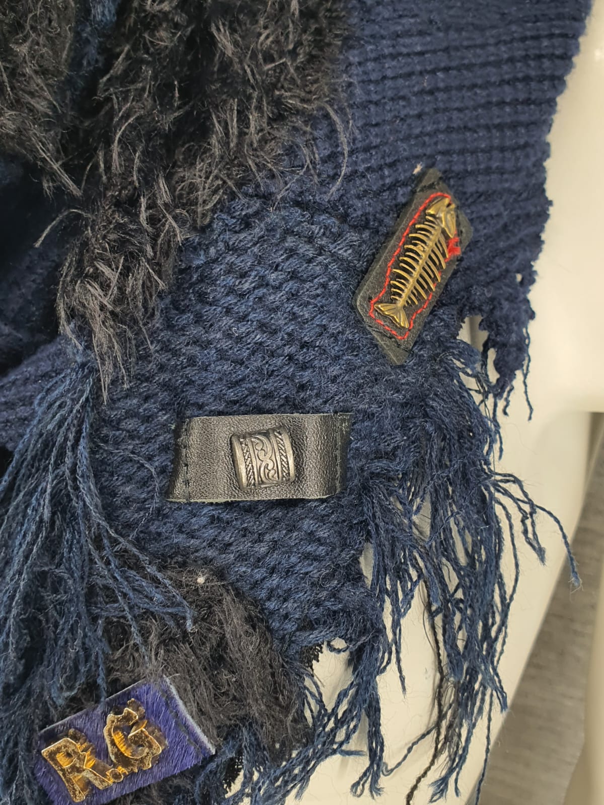 Шарф из синего джемпера и чёрного меха на хлопковой основе, декорирован разными нашивками.