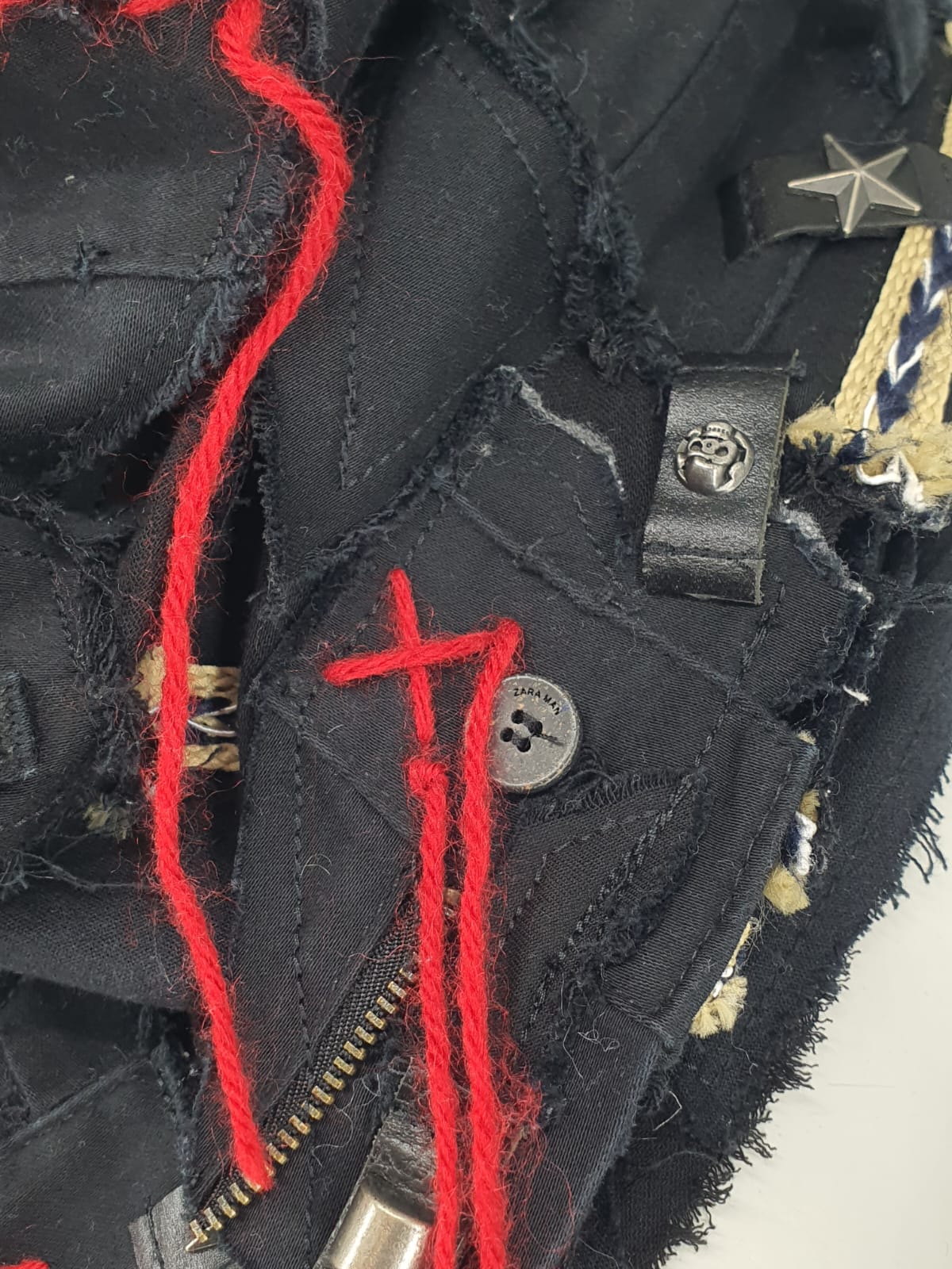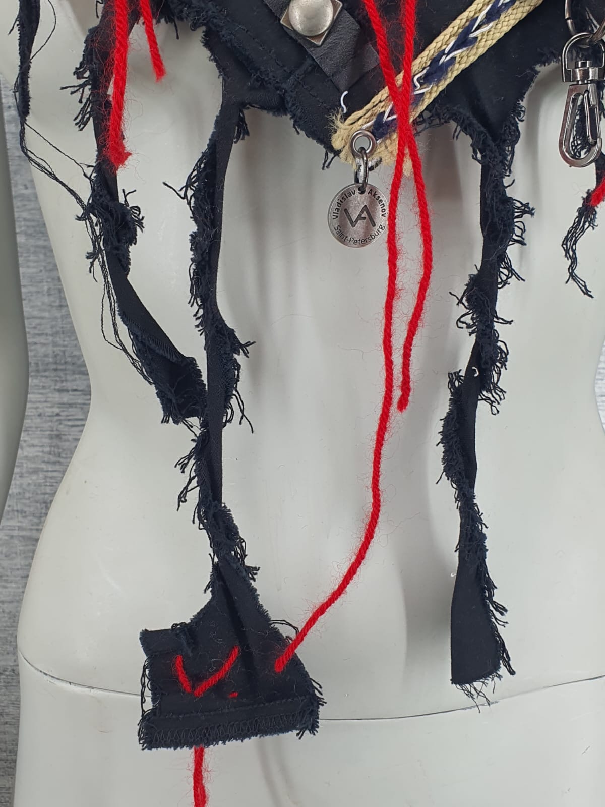 Шарф из лёгких хлопковых джинсов на чёрной основе, декорирован кожаными нашивками и красной пряжей. Такой шарф можно использовать ка имиджевый или в весенне-осенний период.