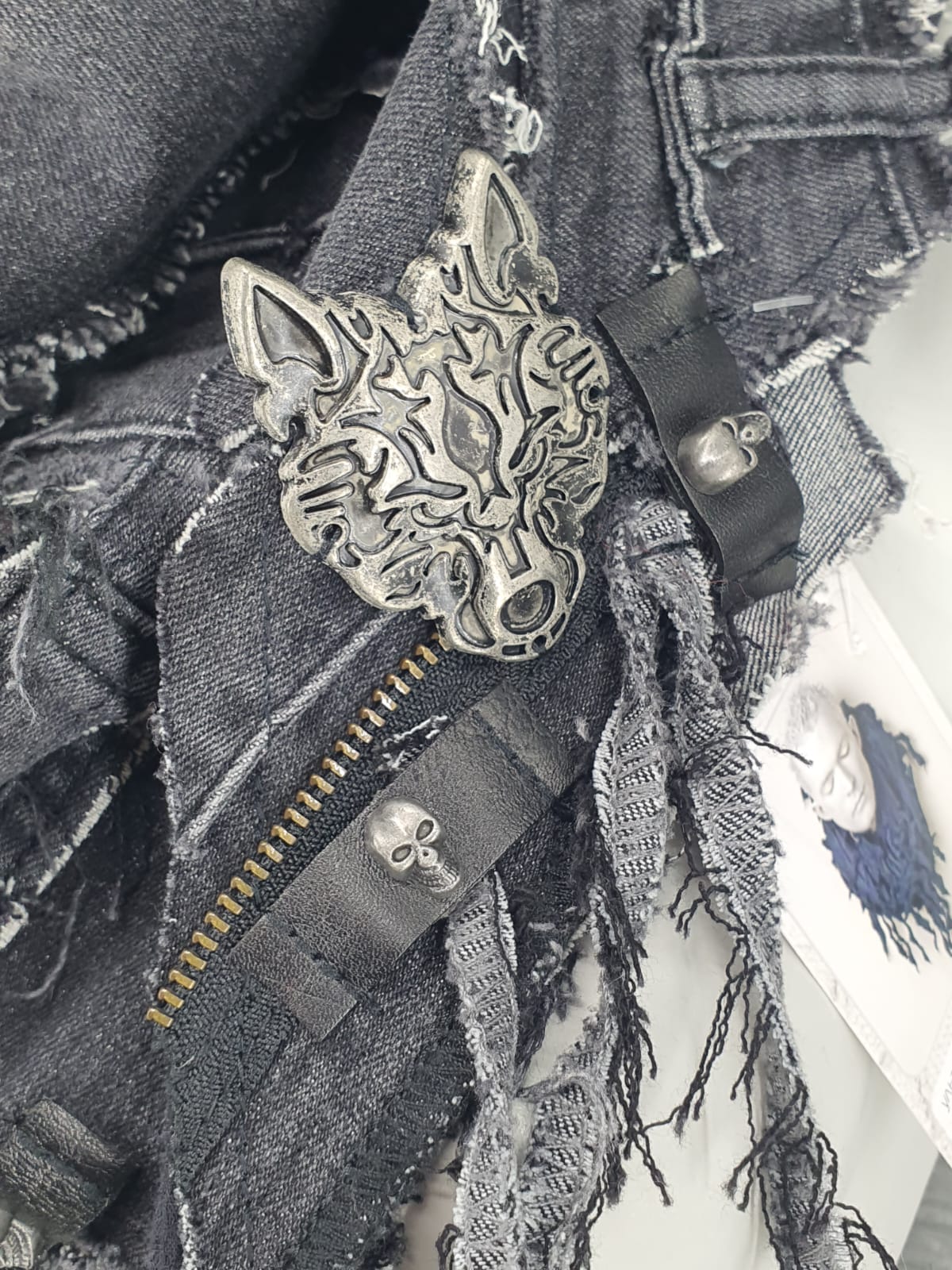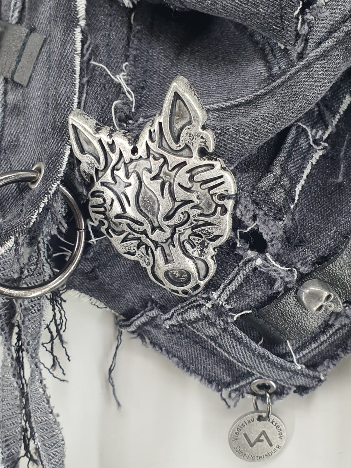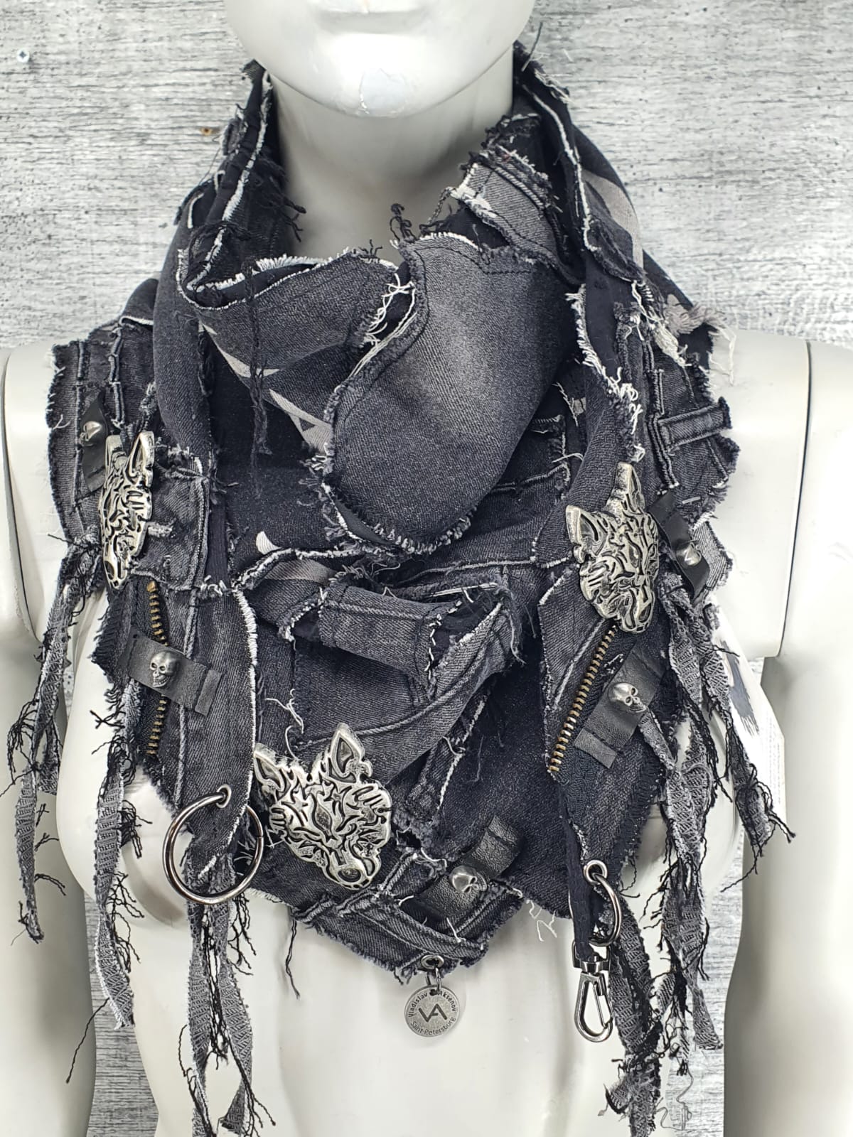 Шарф из джинсов на чёрной хлопковой основе, декорирован кожаными нашивками с черепами и металлическими волками. Для серьёзных парней!