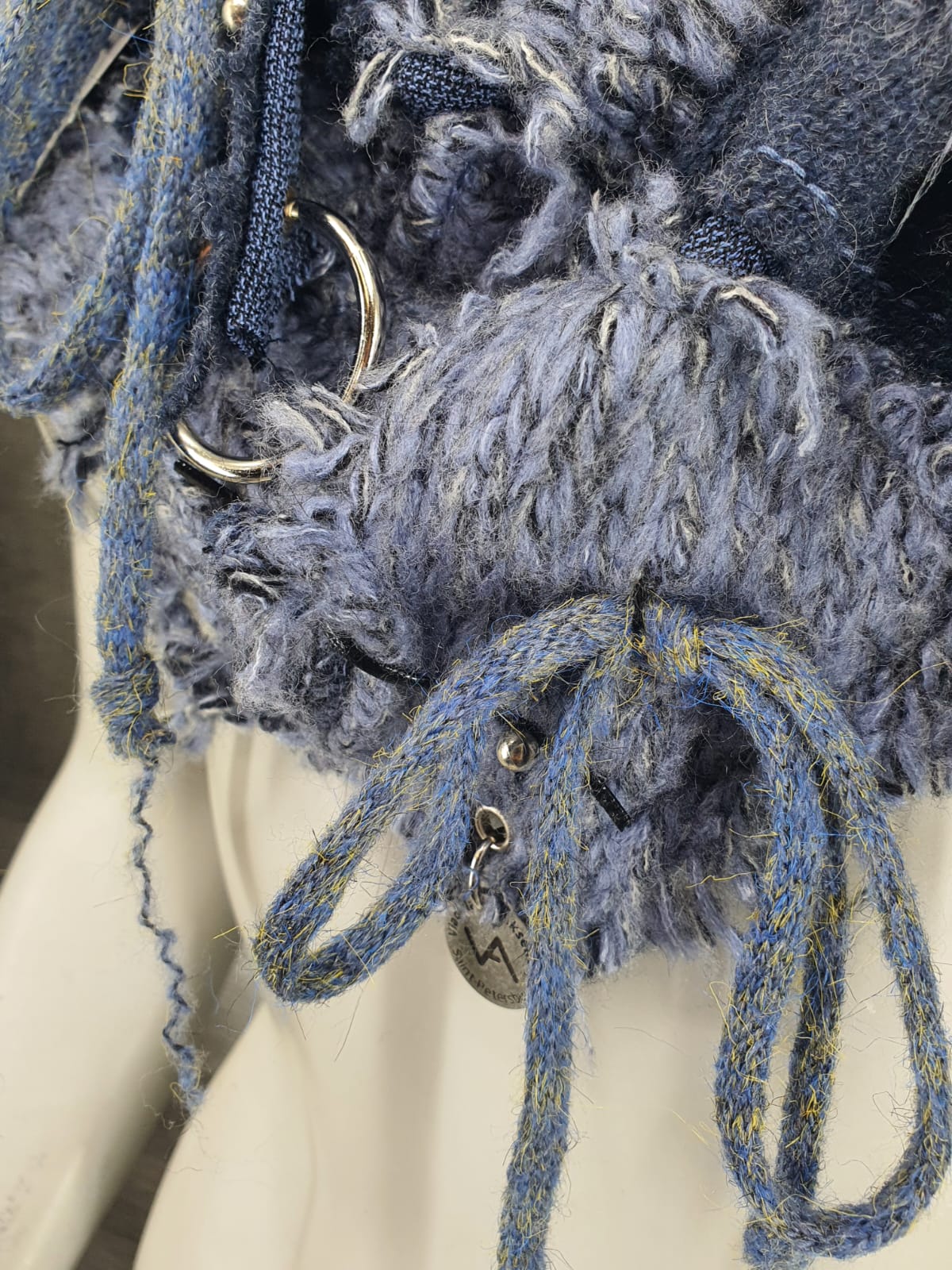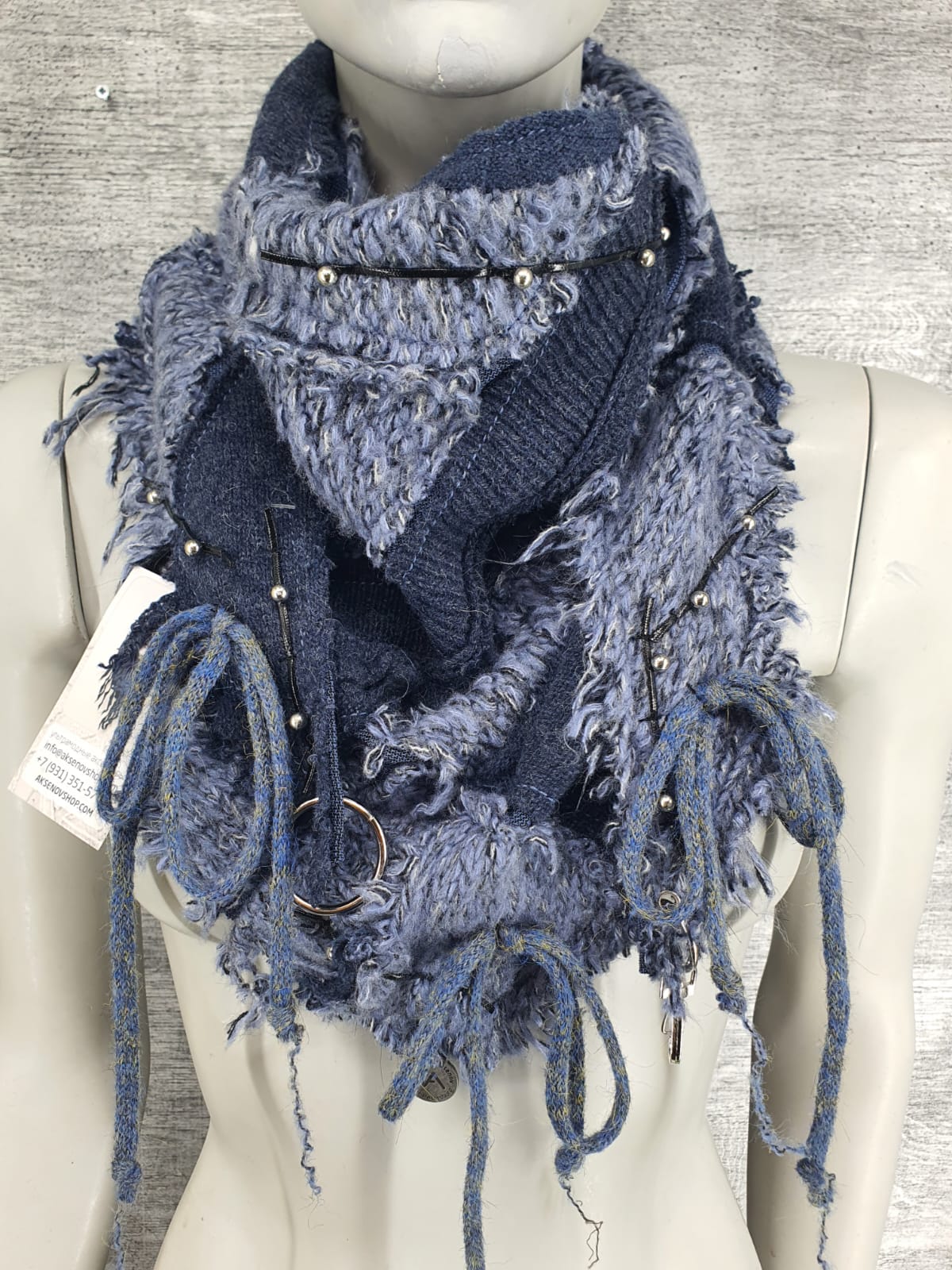 Шарф из синего и голубого свитеров на мягкой льняной основе, декорирован лентой с металлическими шариками и вязаным шнуром.