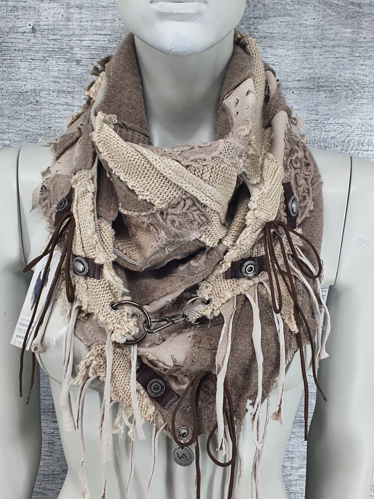 Шарф из джемперов в бежево-коричневых оттенках с кружевом, декорирован кожаными нашивками и шнурками.