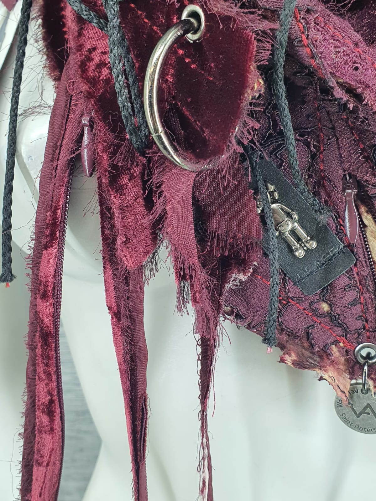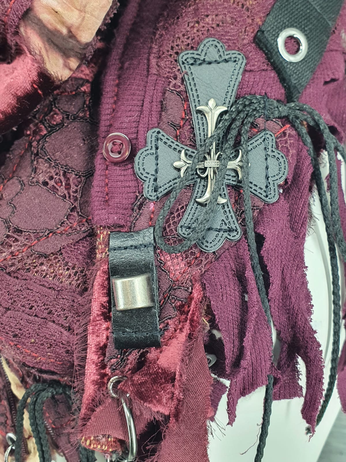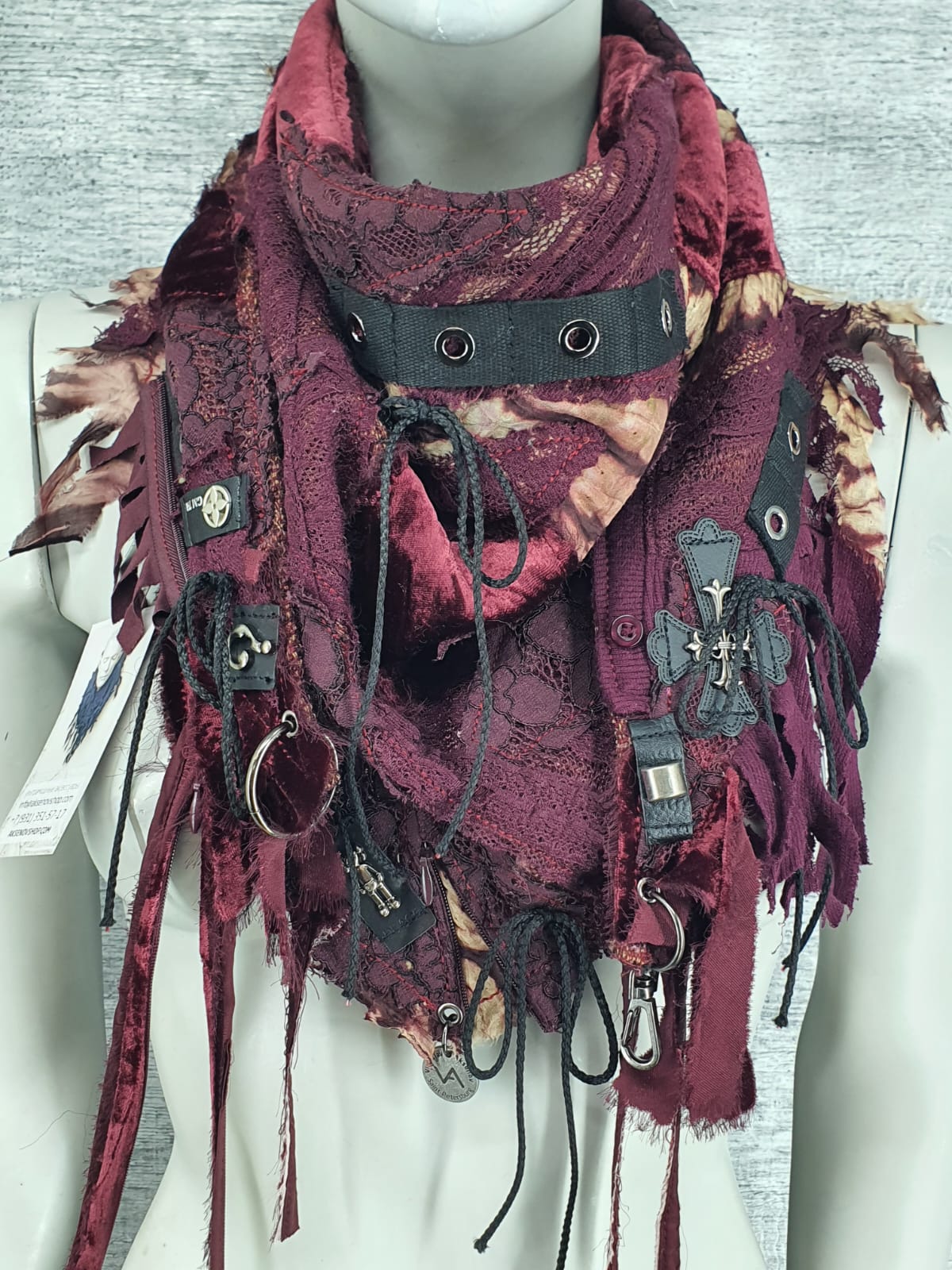 Шарф из различных вещей в бордовых оттенках на основе изкостюмной ткани, декорированлентой с люверсами, нашивками и шнурами.