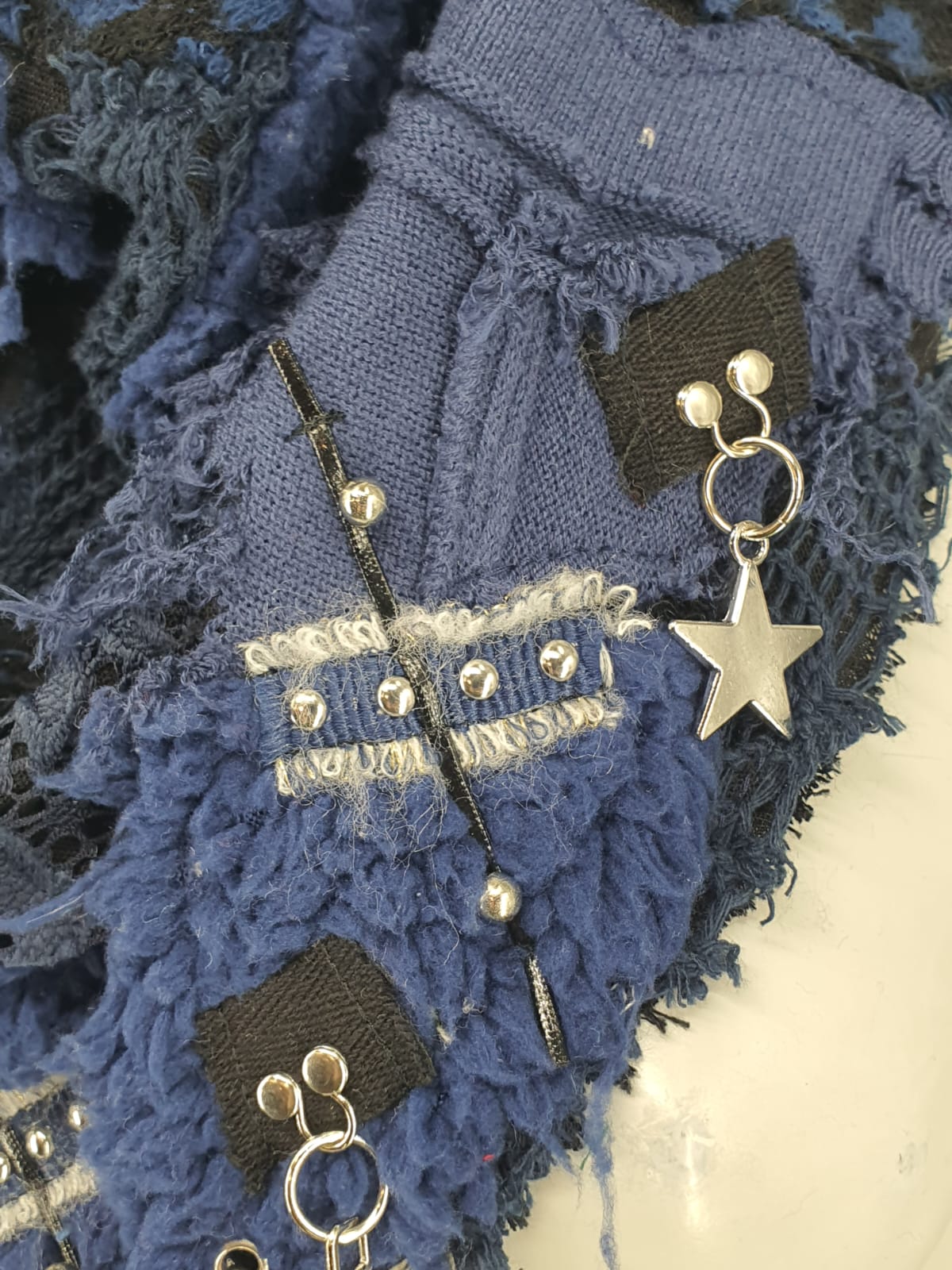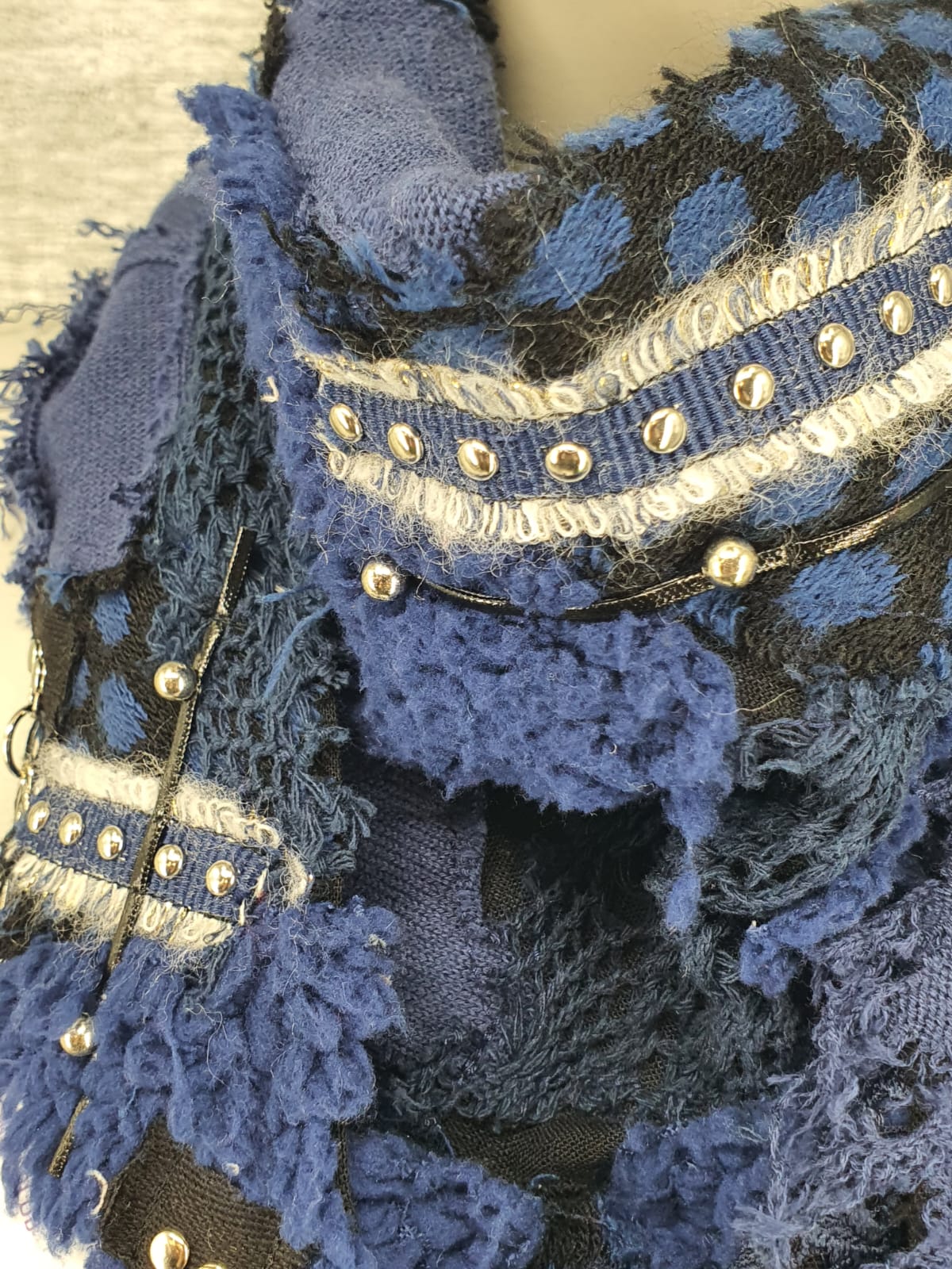 Шарф из вещей разной фактуры на чёрной хлопковой основе, декорирован лентами и подвесами.