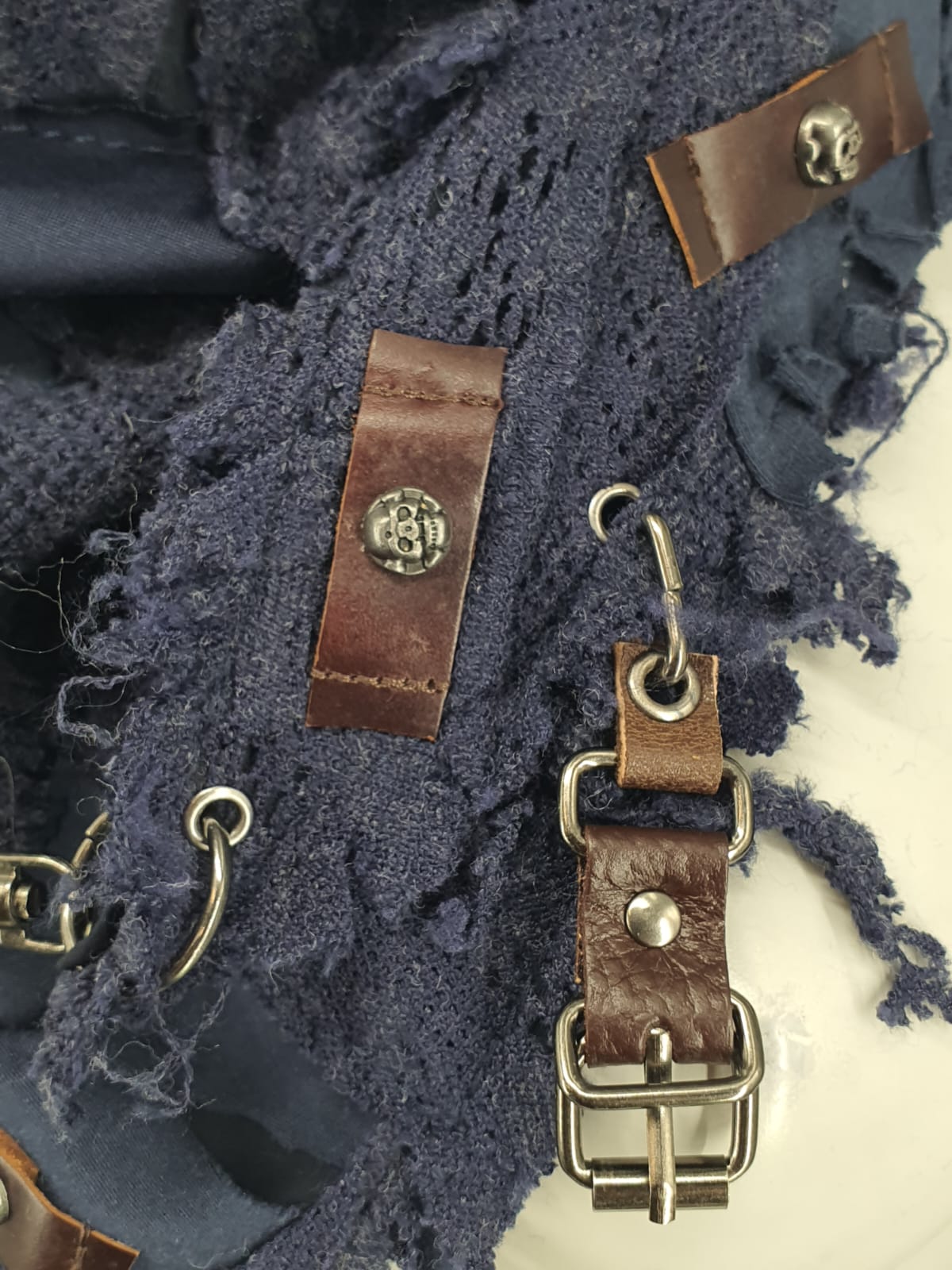 Шарф из джемпера и блузы в синих оттнках на чёрной основе, декорирован кожаными нашивками и браслетом.