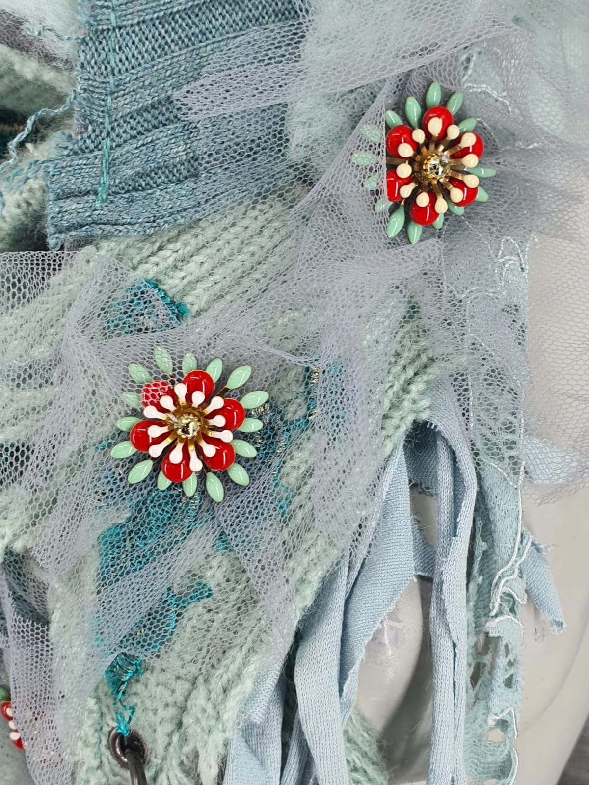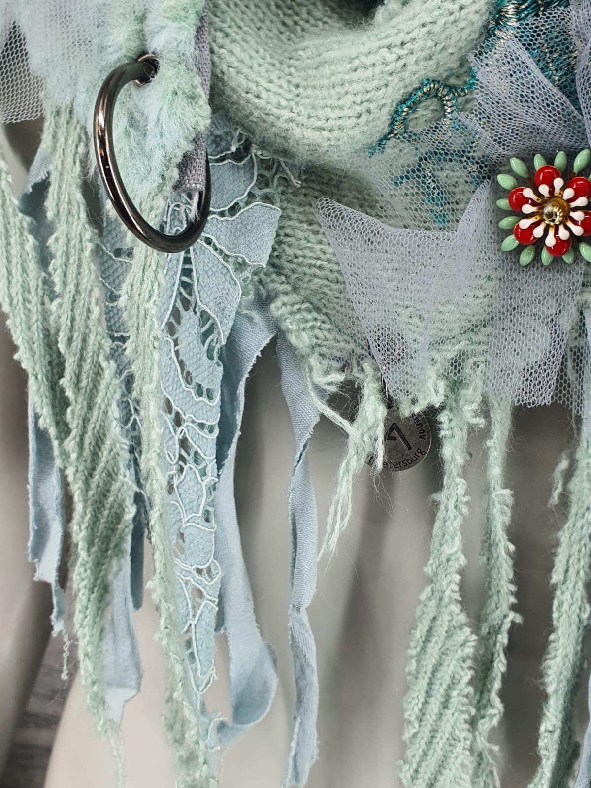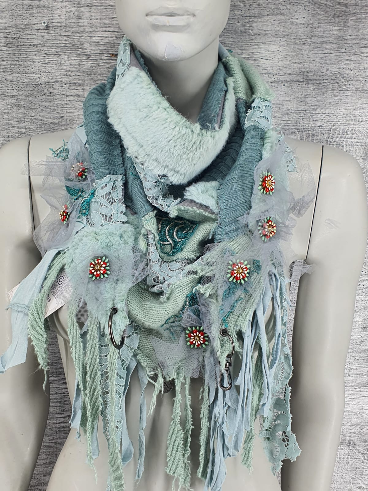 Бирюзовый шарф из разных составляющих, на серой хлопковой основе. Декорирован сеткой, и цветами.