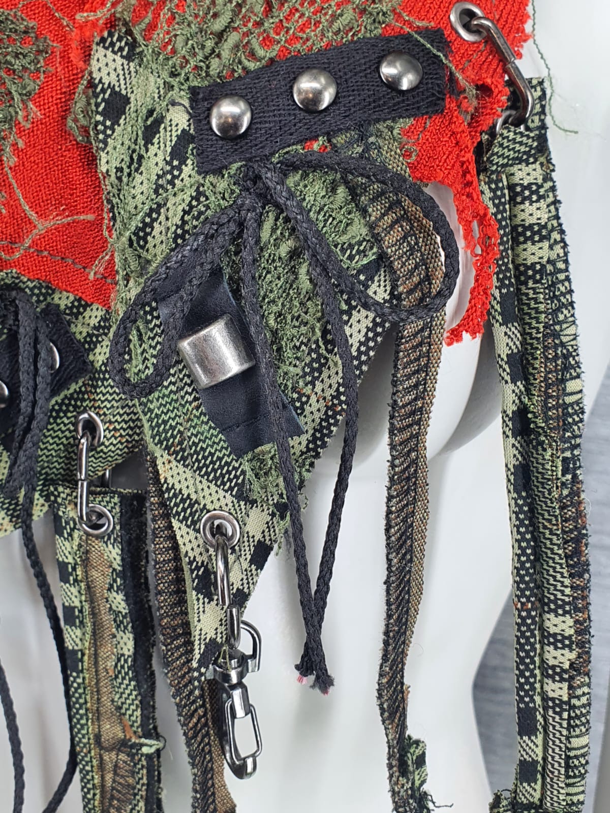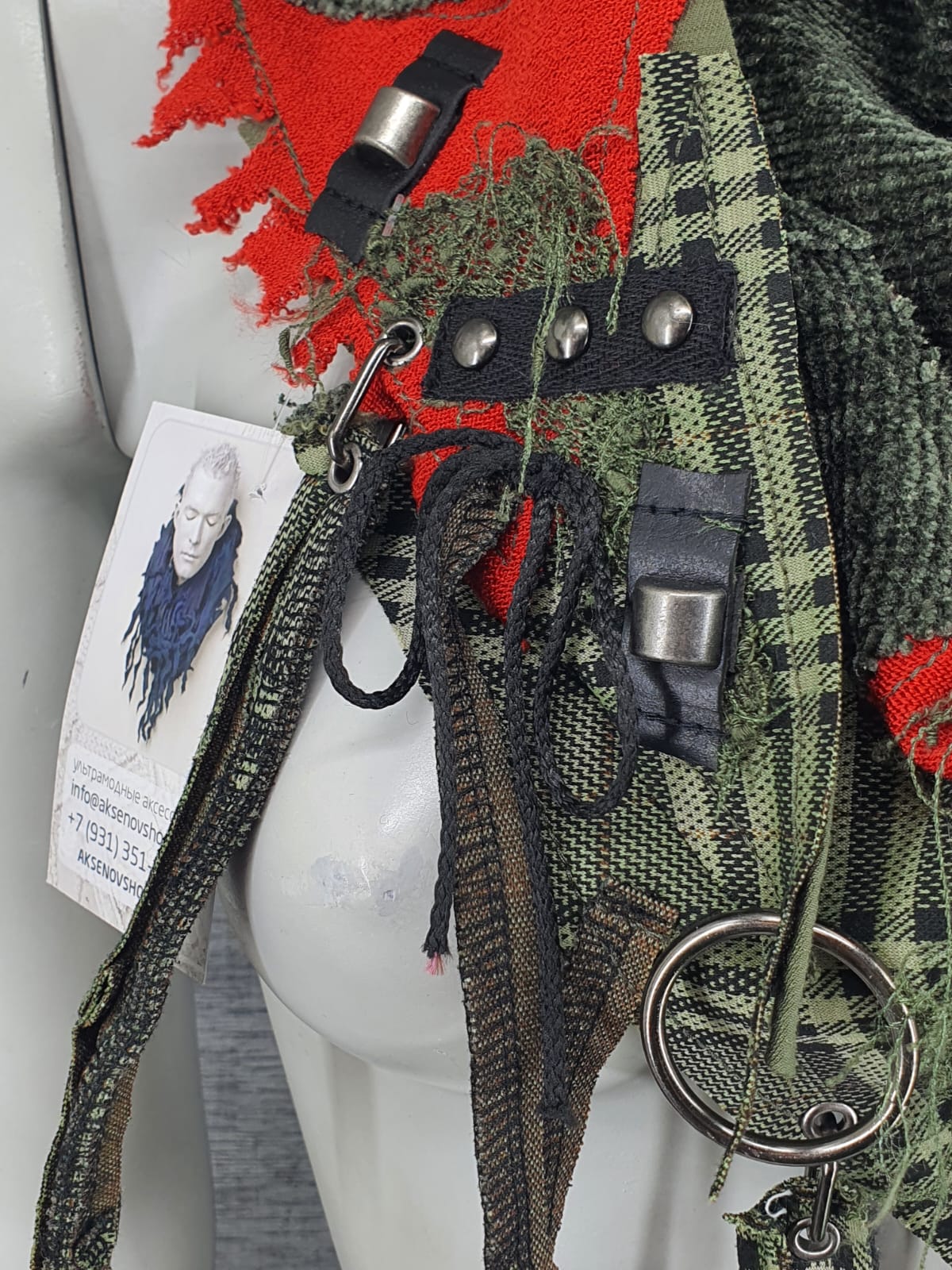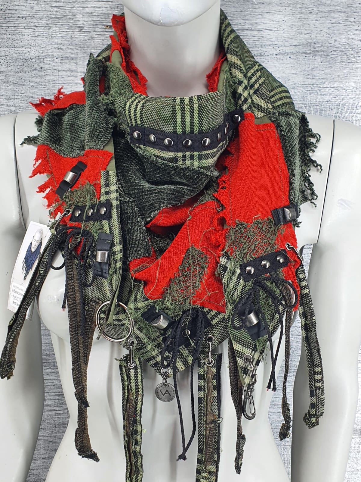 Зелёно-красный шарф из различных составляющих налёгкой зелёной основе, декорирован нашивками, подвесами и шнурками.