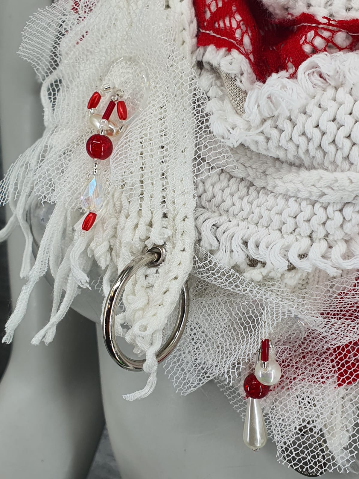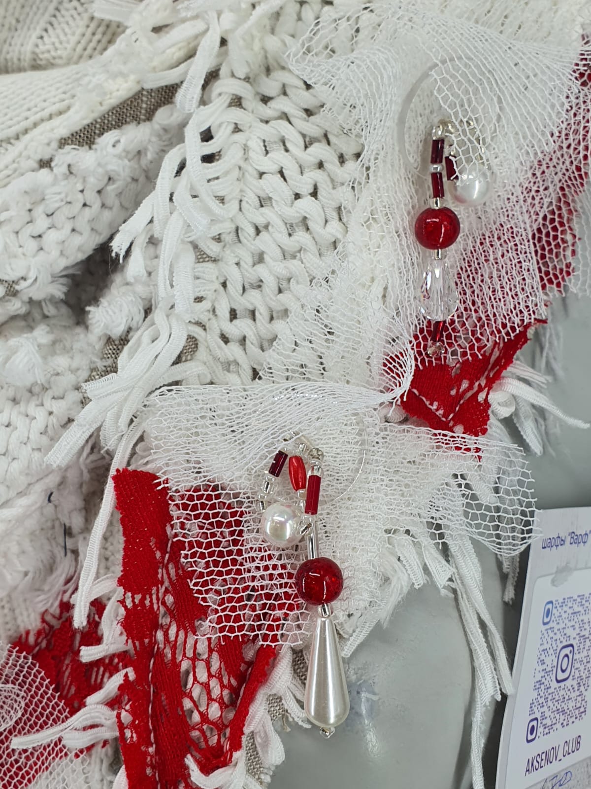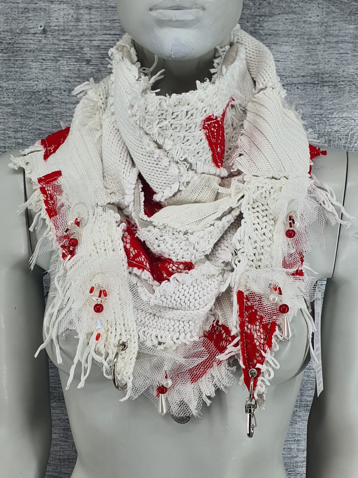Белый шарф из джемпнра на лёгкой льняной основе, декорирован красным кружевом, сеткой и пуговицами с бисером.