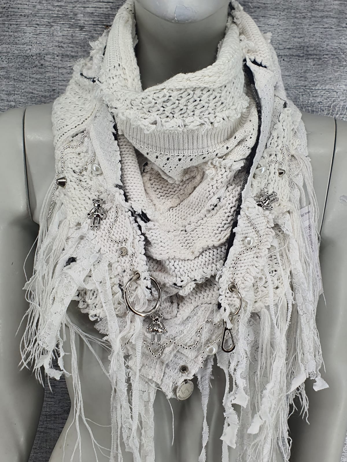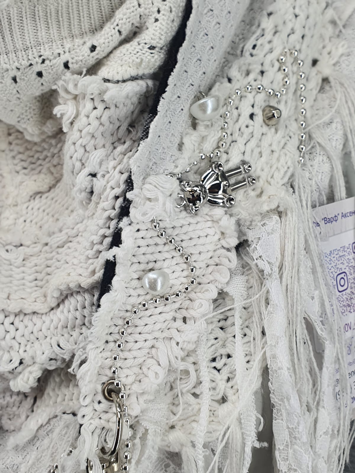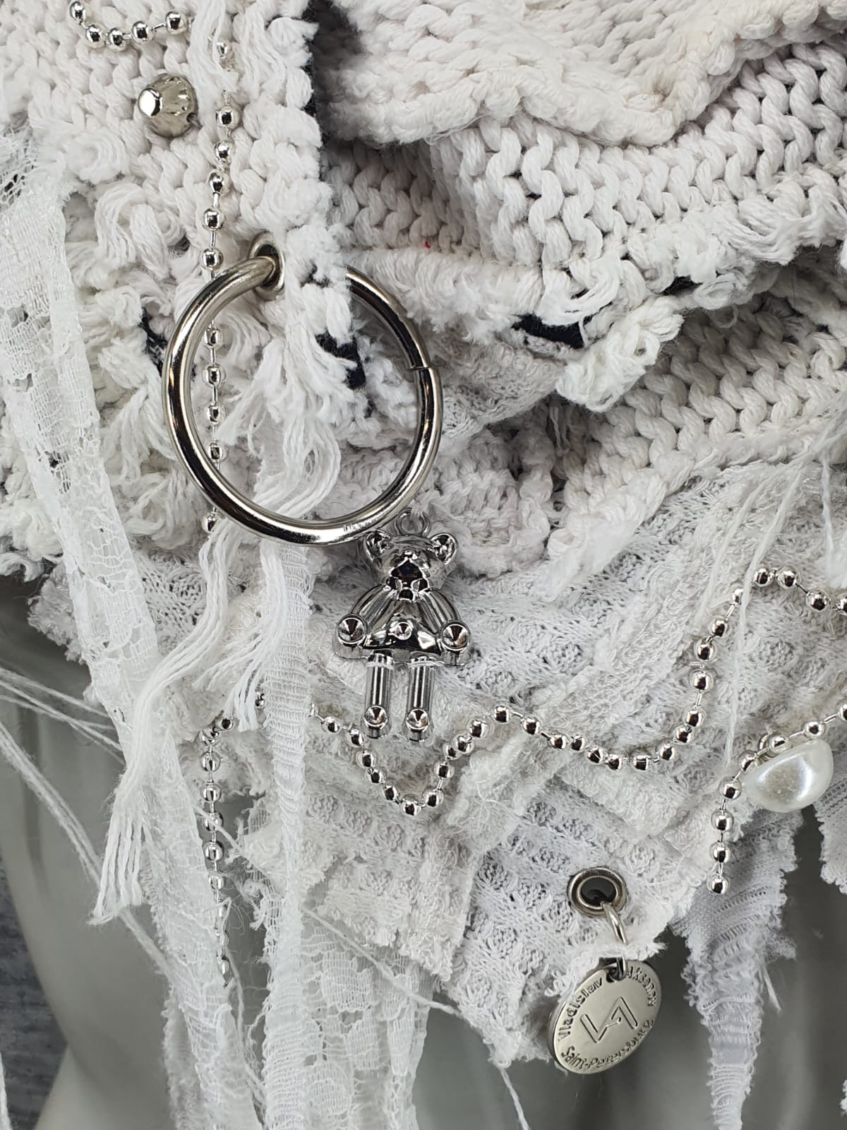 Шарф из белых джемперов на основе в клетку, декорирован цепочкой, мишками, перламутровыми бусинами и металлическими пирамидками.