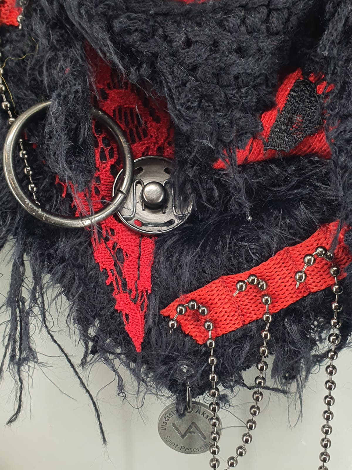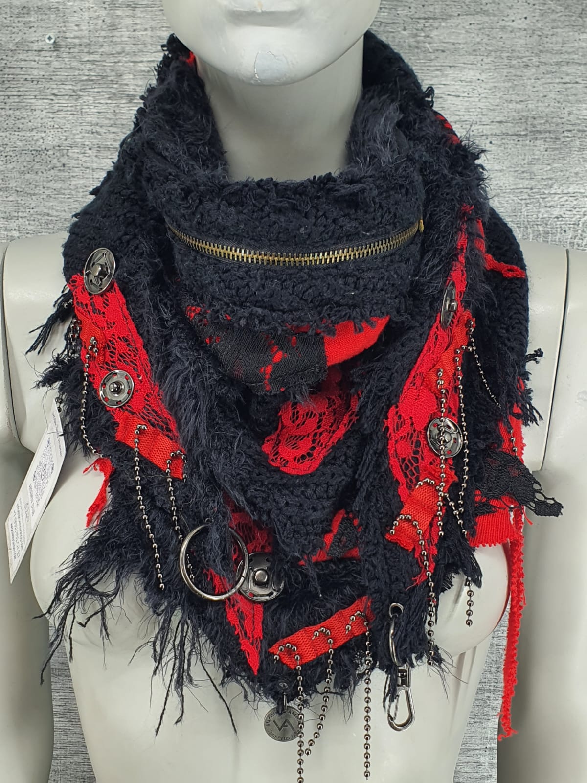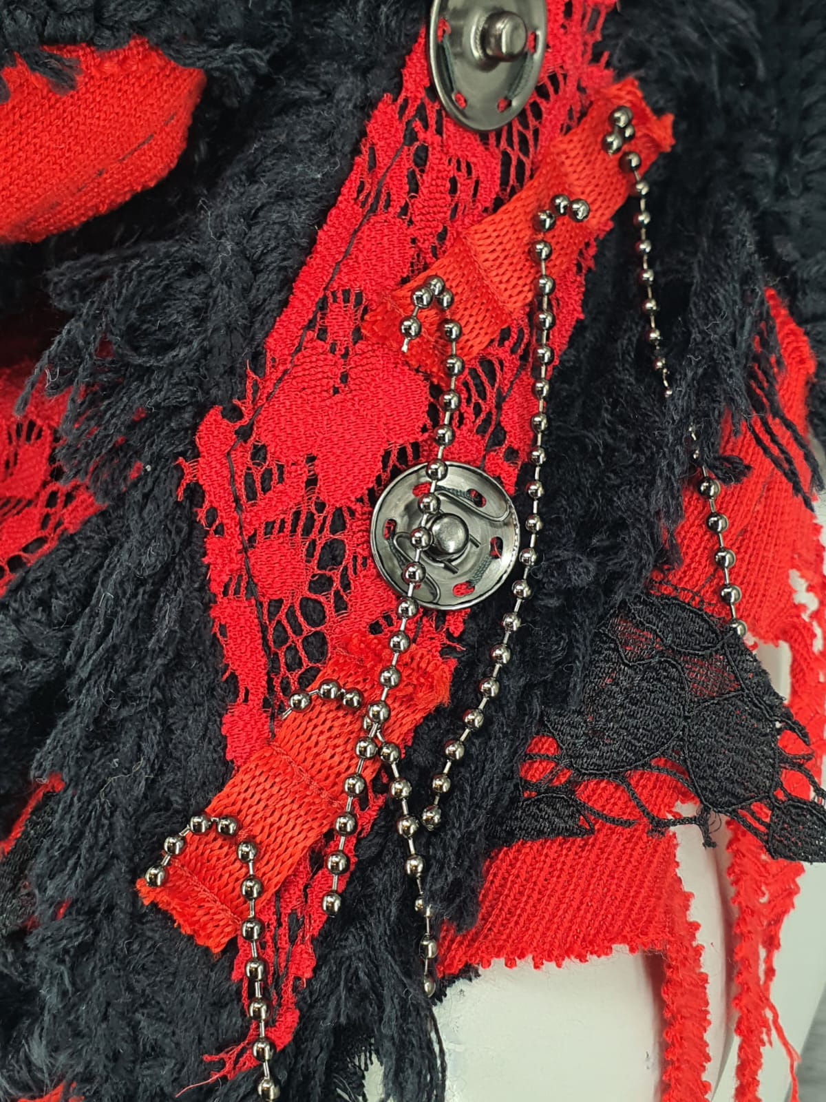 Шарф из чёрно-красных джемперов с добавлением кружева, декорирован кнопками и цепочками.