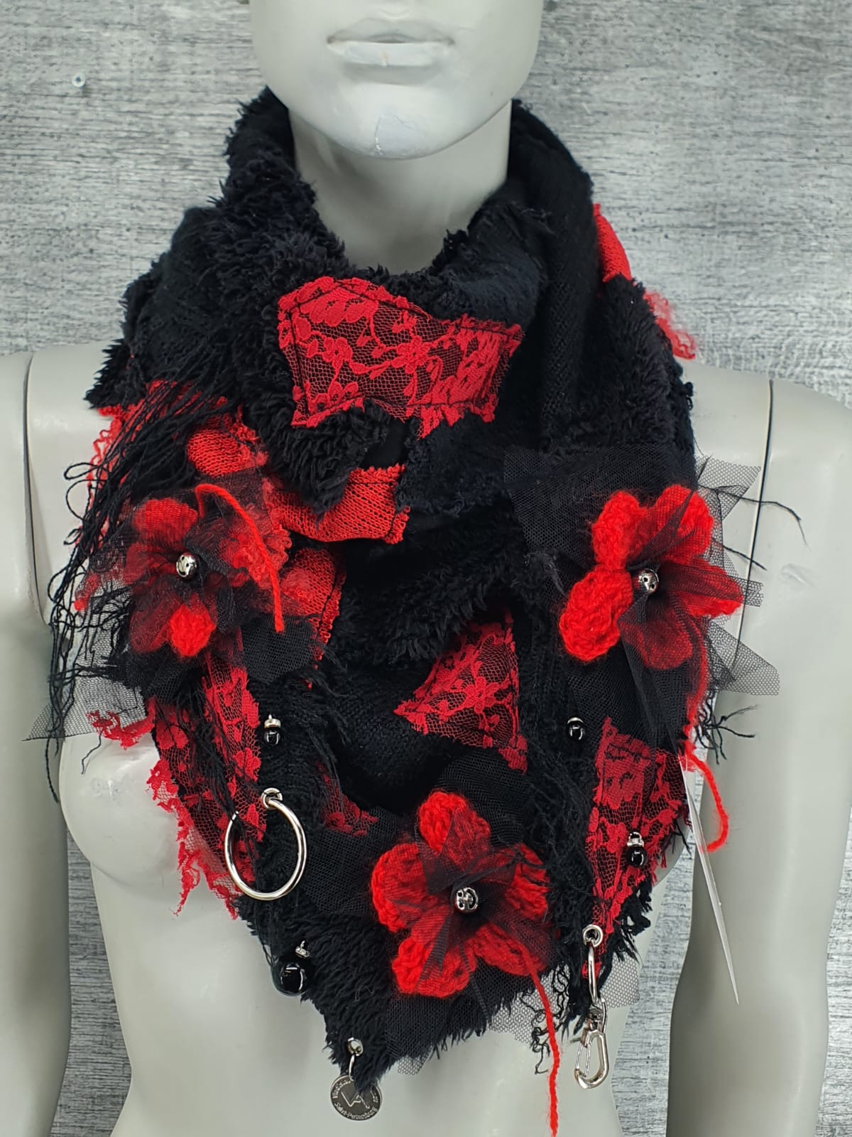 Шарф из чёрно-красных джемперов с добавлением кружева, декорирован вязаными цветами с сеткой и бусинами.