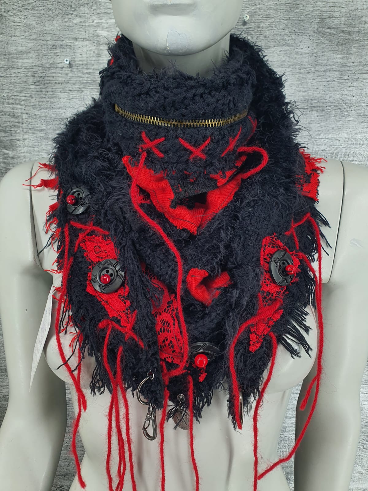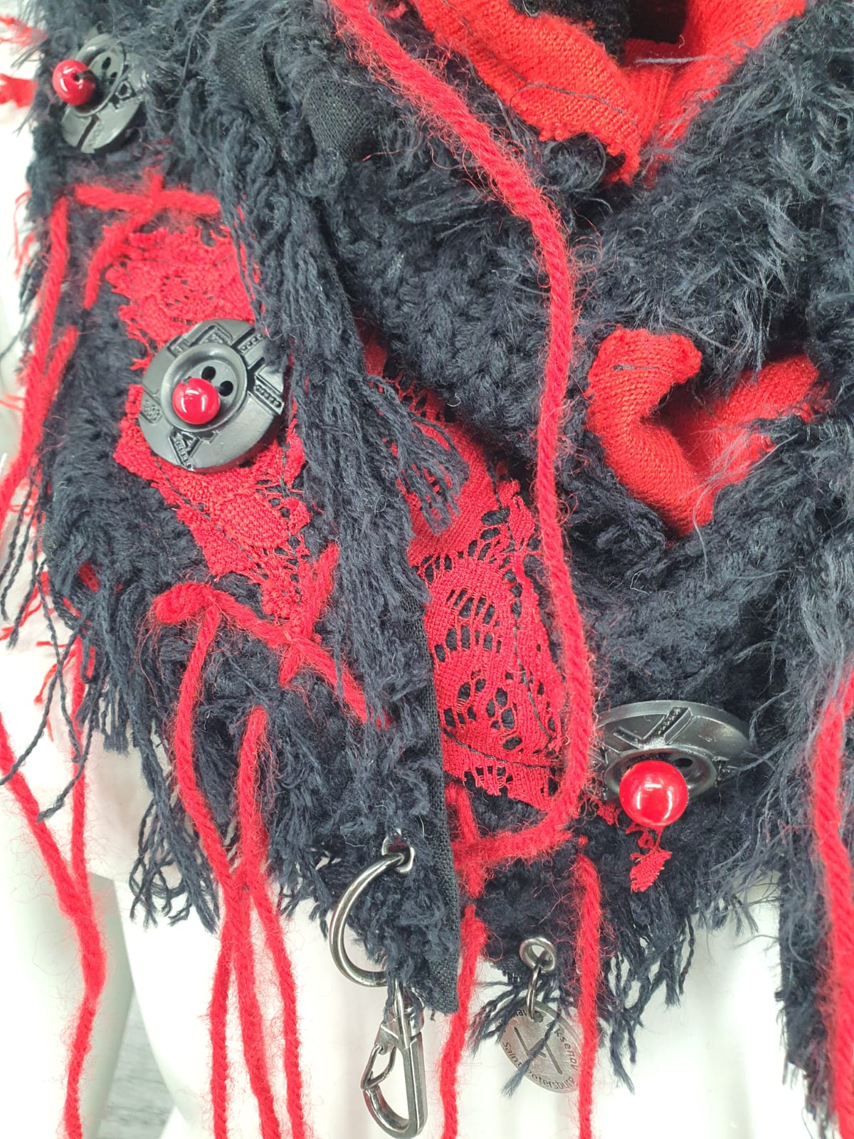 Шарф из чёрно-красных джемперов с добавлением кружева, декорирован пуговицами с красными бусинами и красной ниткой.
