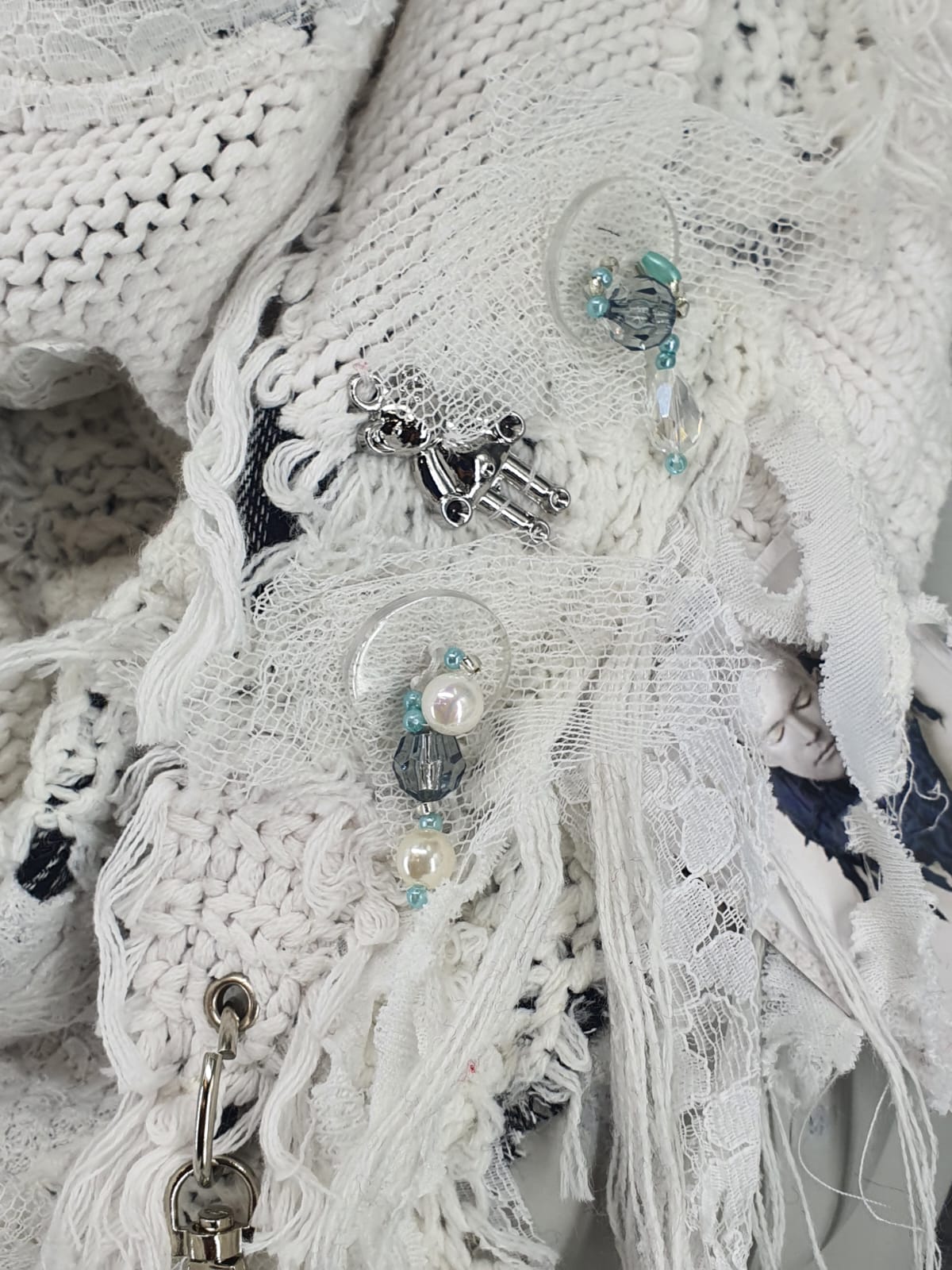 Шарф из белых джемперов на основе в клетку, декорирован мишками и пуговицами с сеткой и бусами.