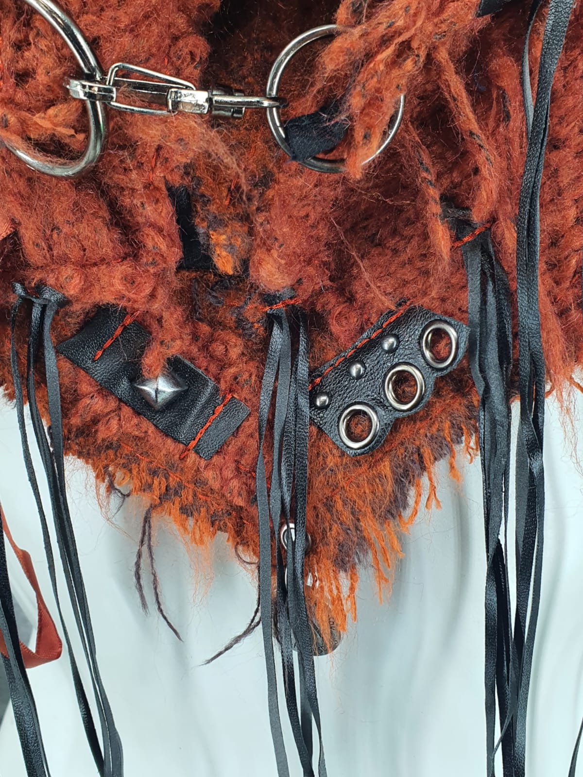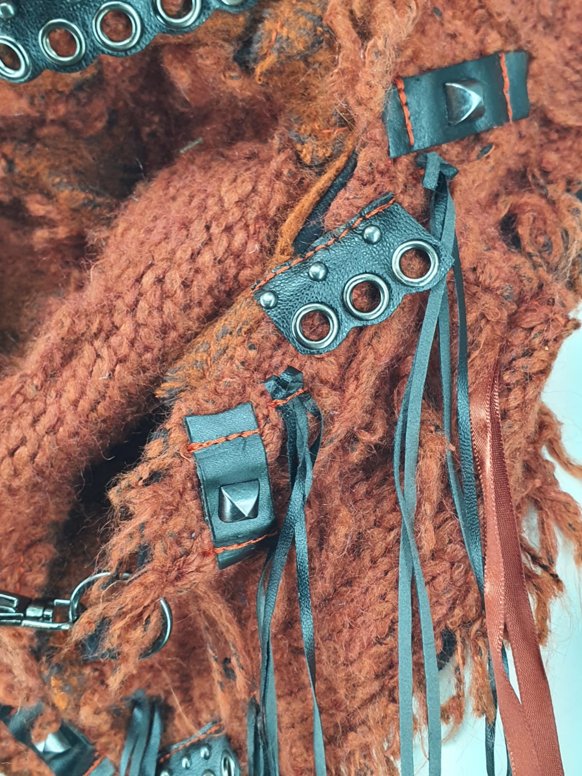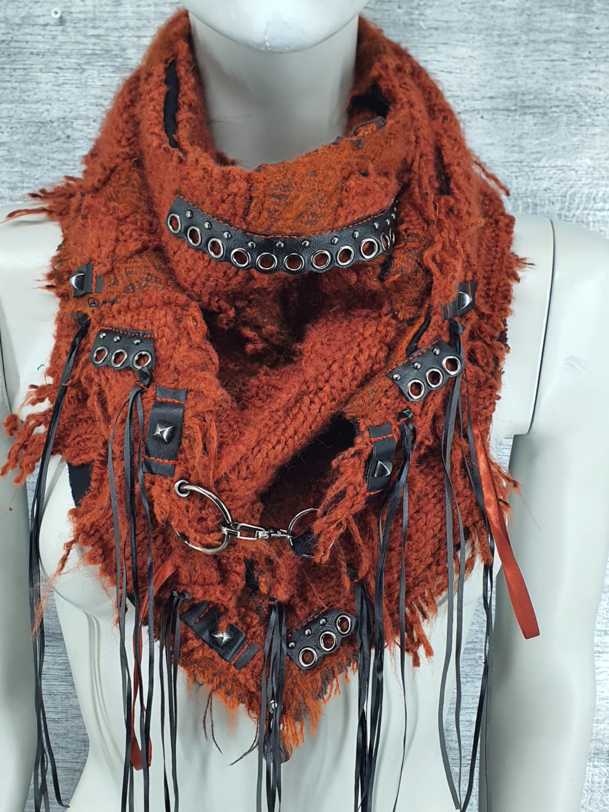 Шарф из рыжего свитера на чёрной хлопковой основе, декорирован кожаными нашивками и бахромой.