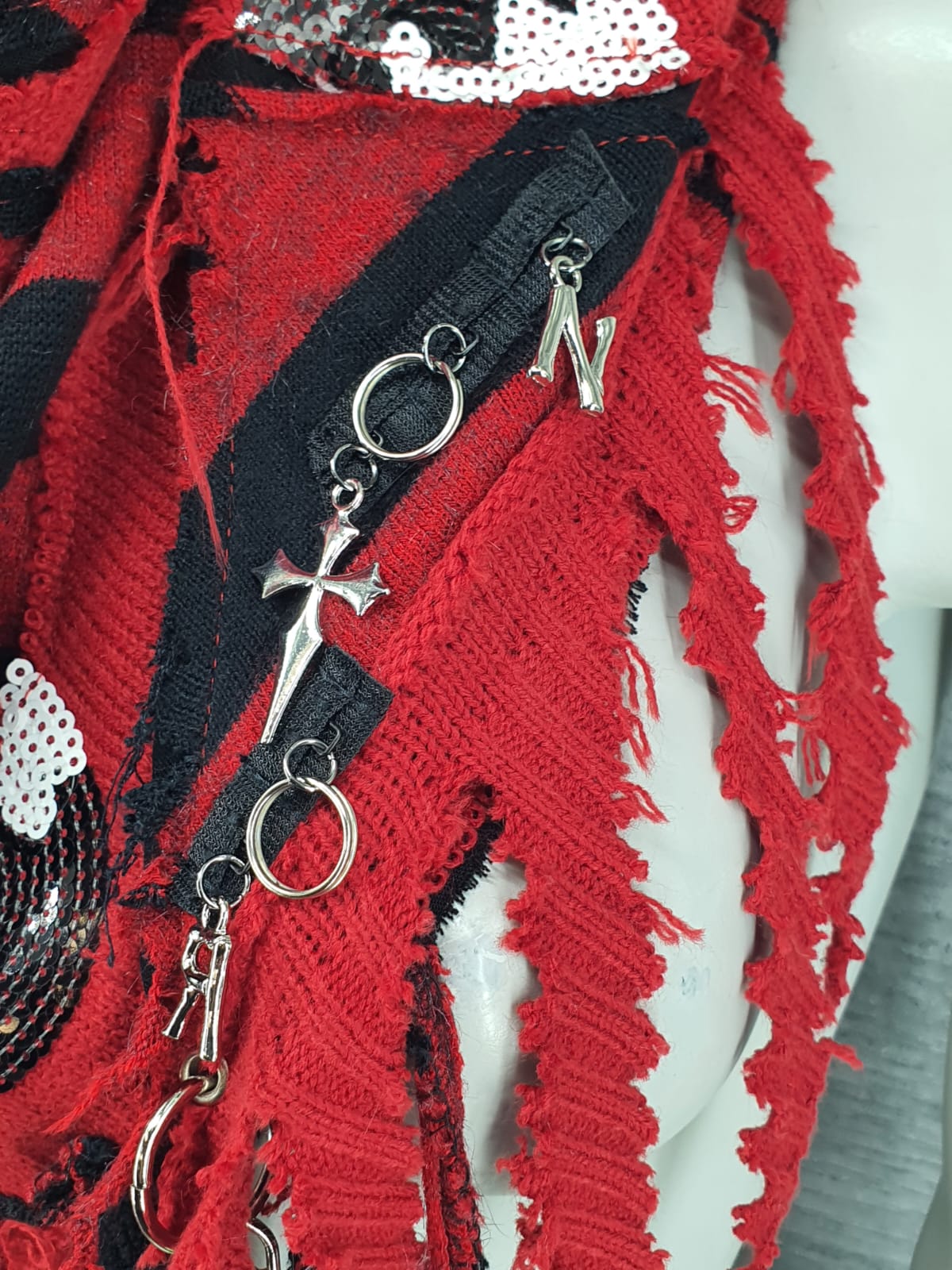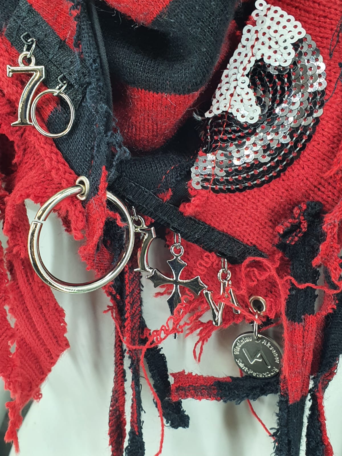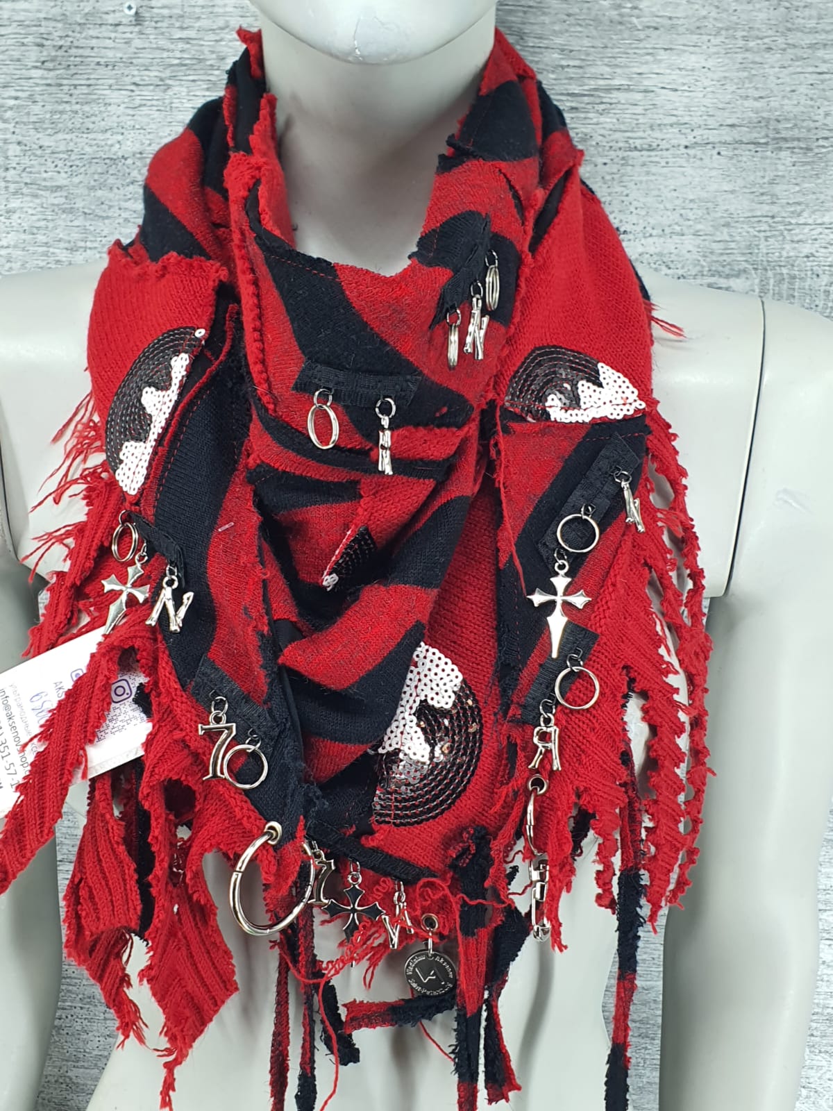 Шарф из красно-чёрного джемпера на чёрной хлопковой основе, декорирован корсетной лентой и подвесами.