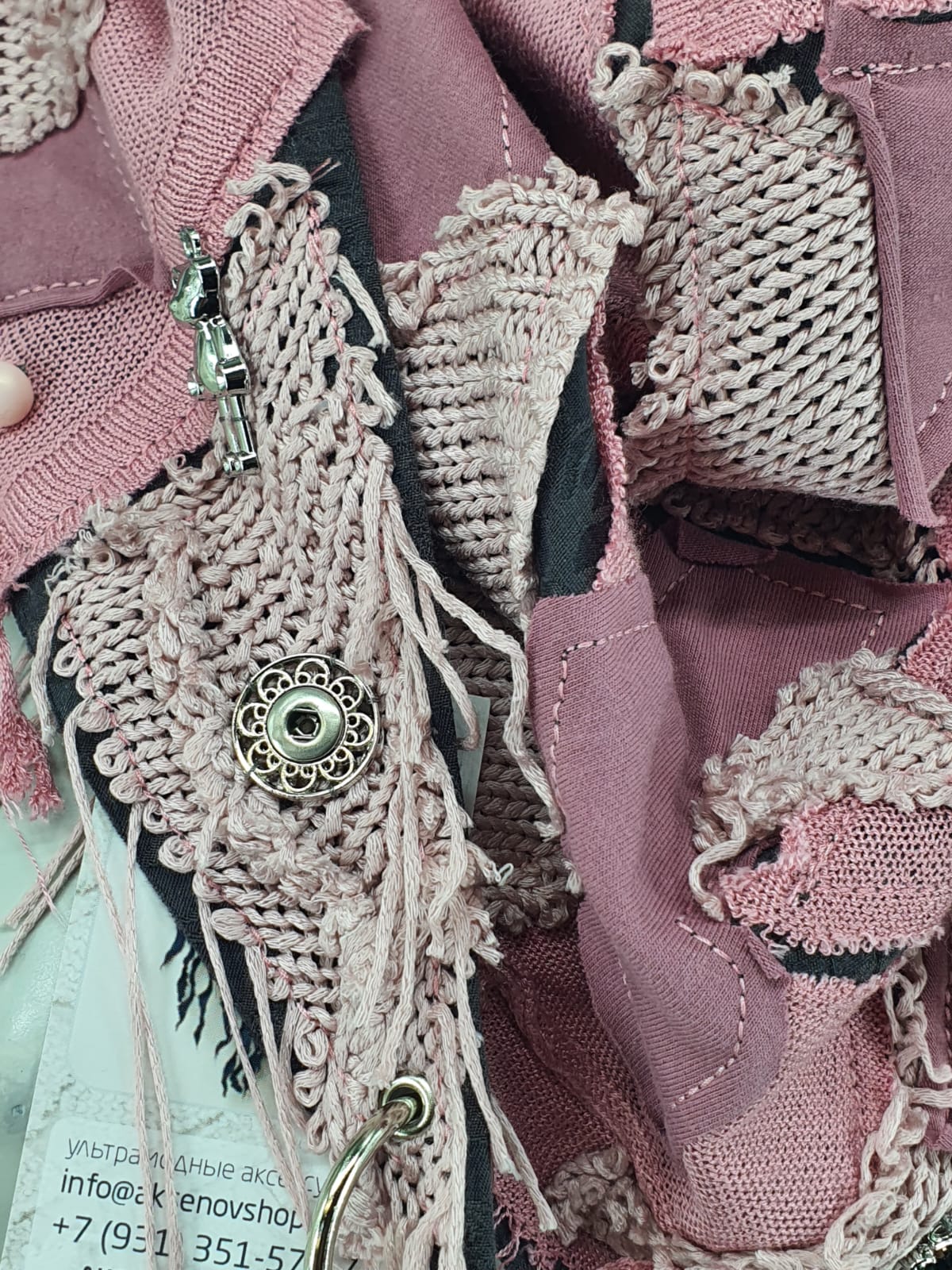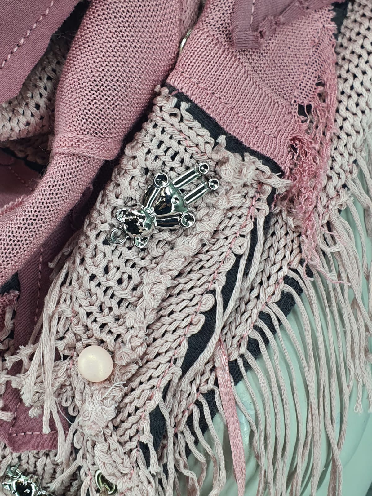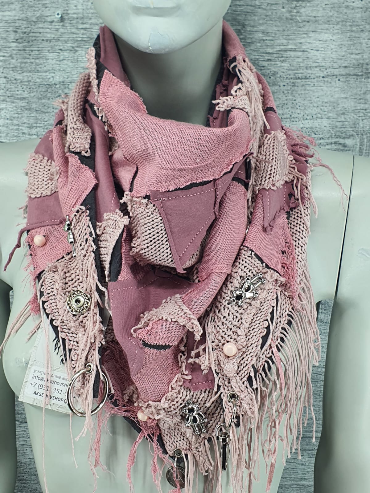 Розовый шарф из разных джемперов на серой жаккардовой основе, декорирован мишками, бусинами и кнопками. Чудесный подарок!