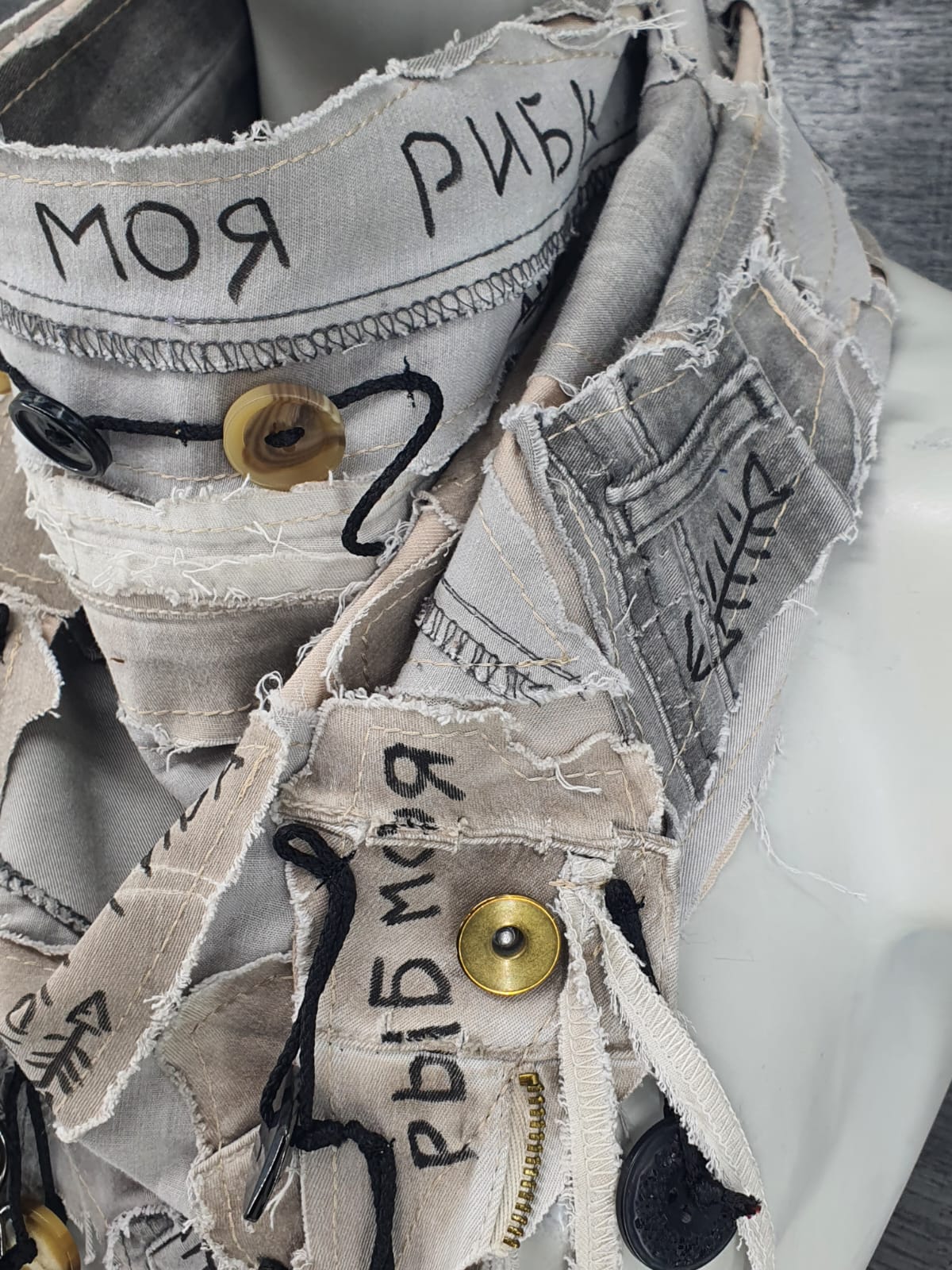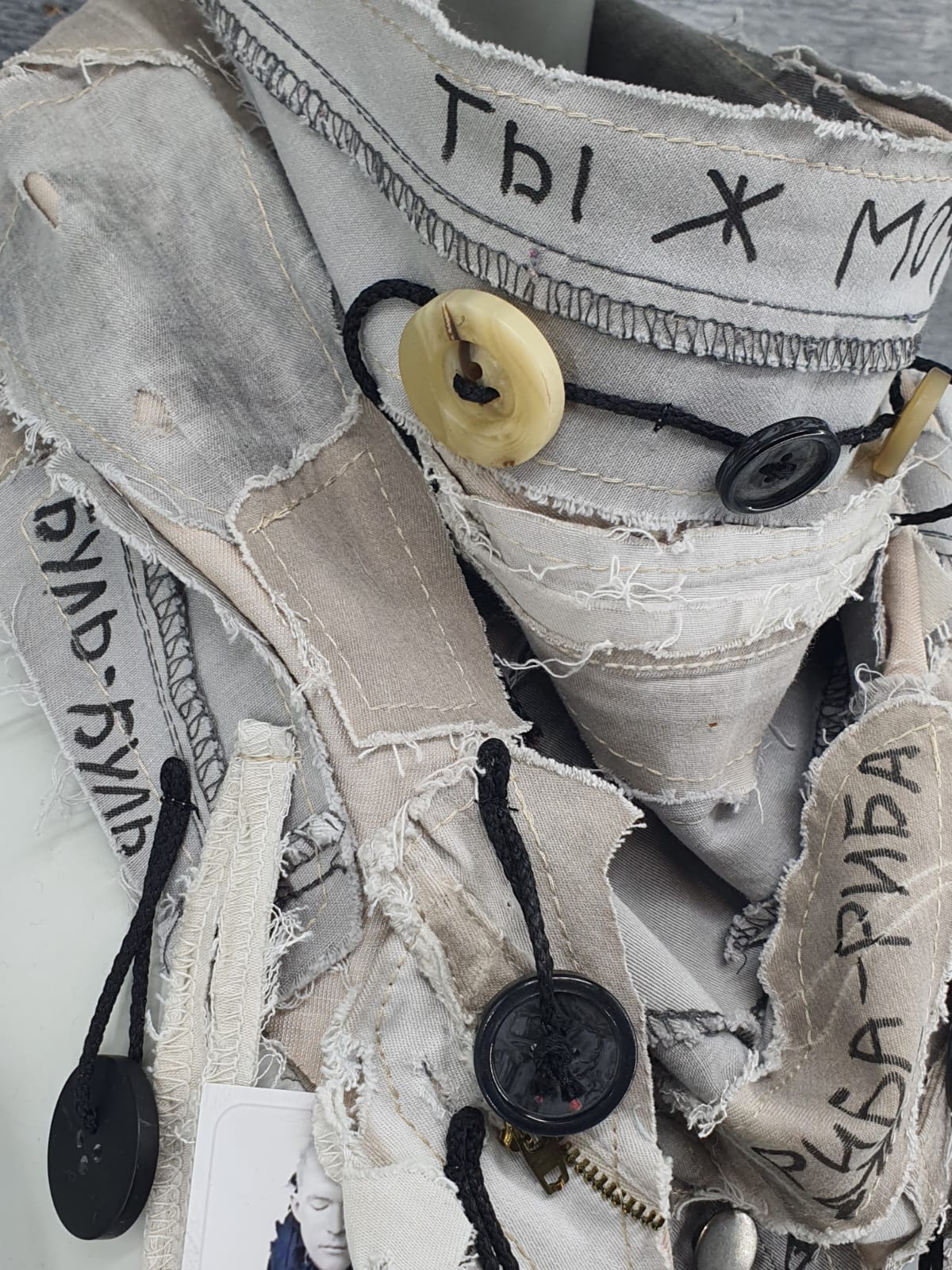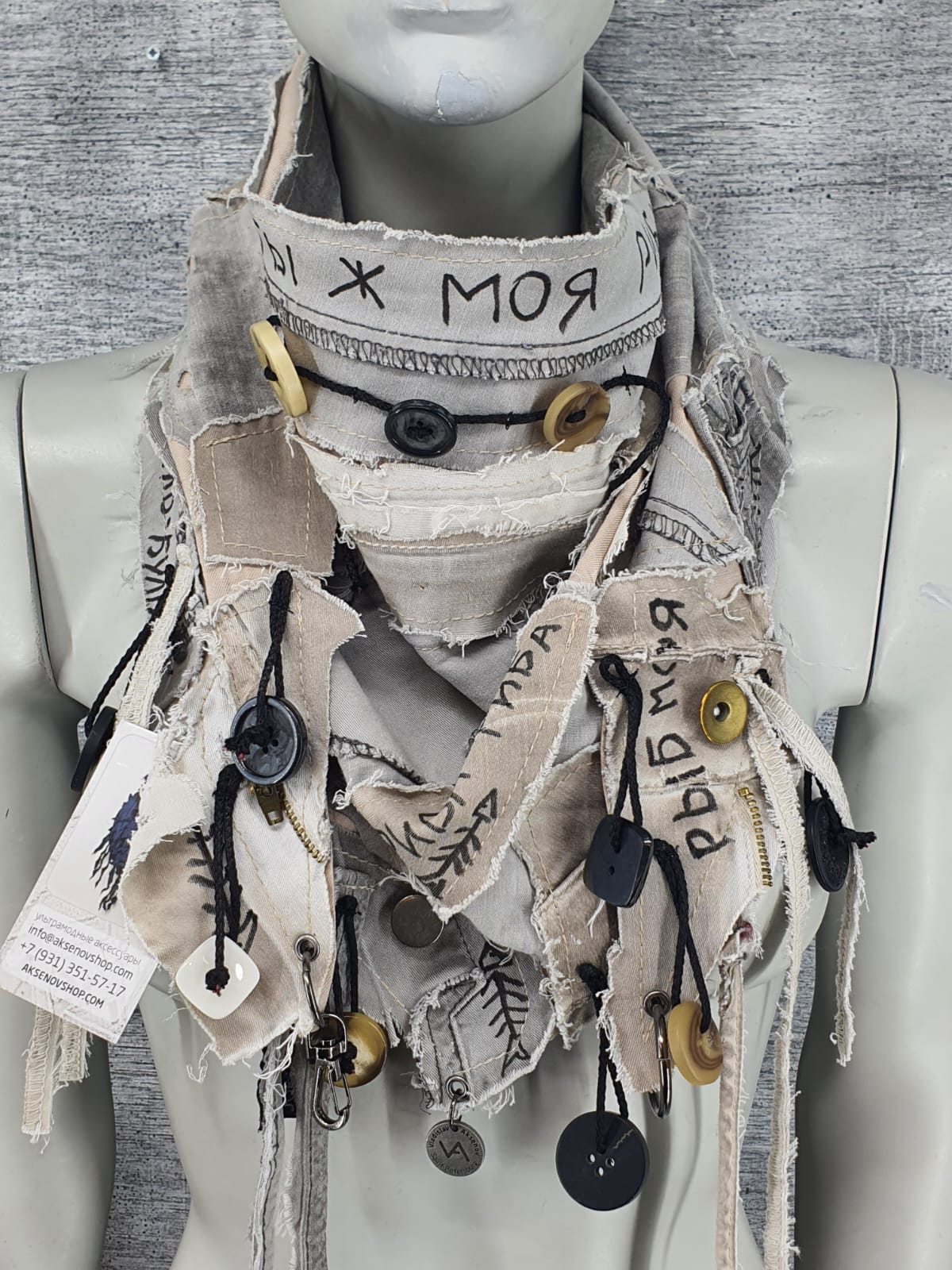Шарф из бежево-серых джинсов на хлопковой основе, декорирован пуговицами на шнурках и надписями. Шарф-настроение!