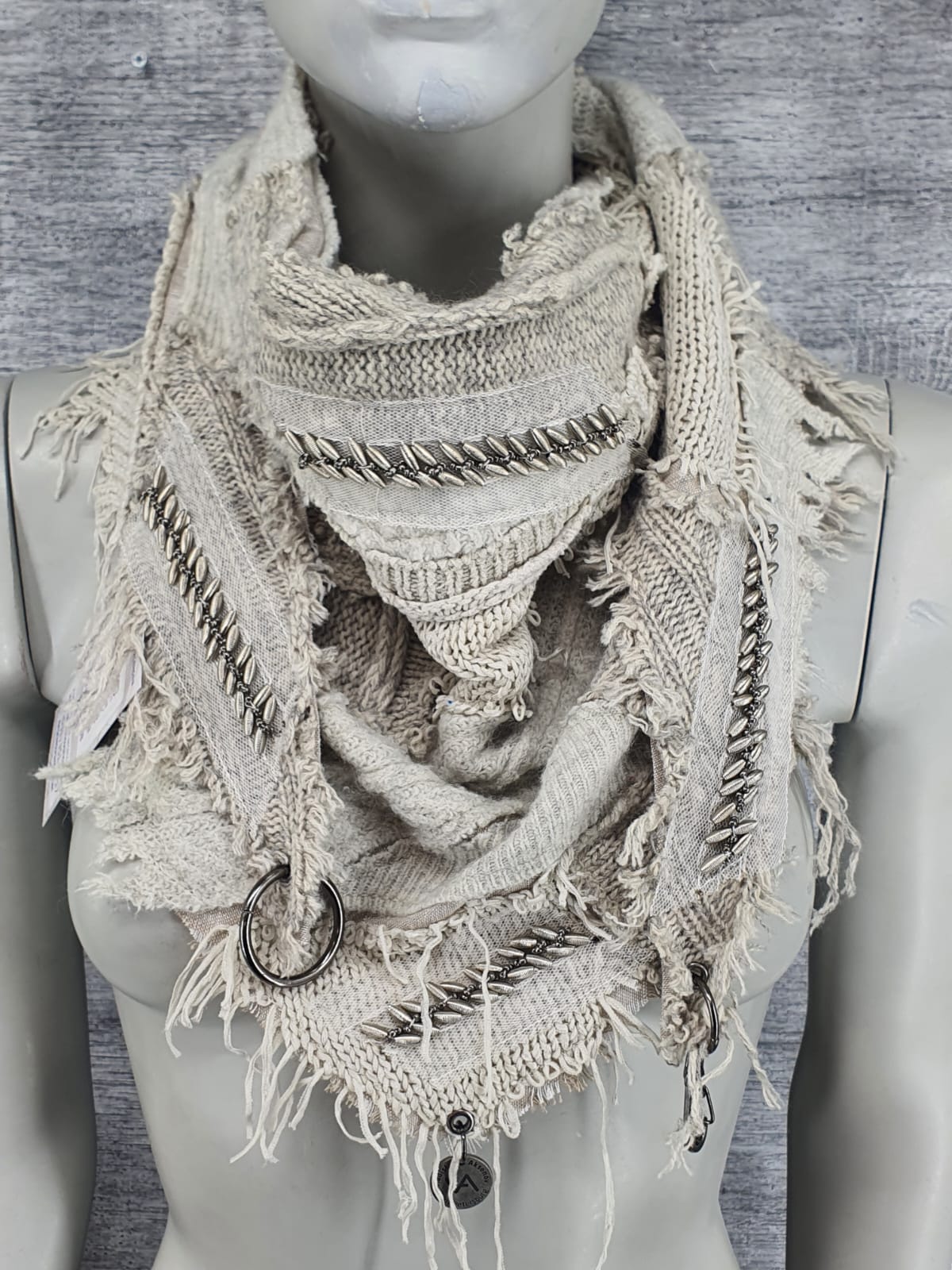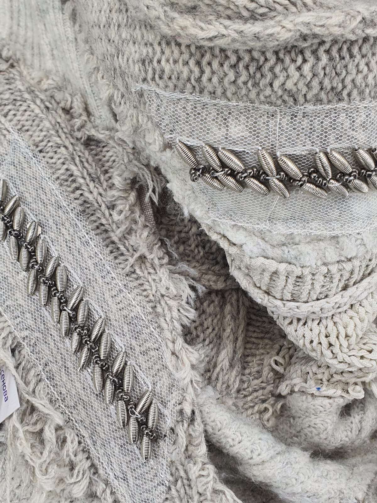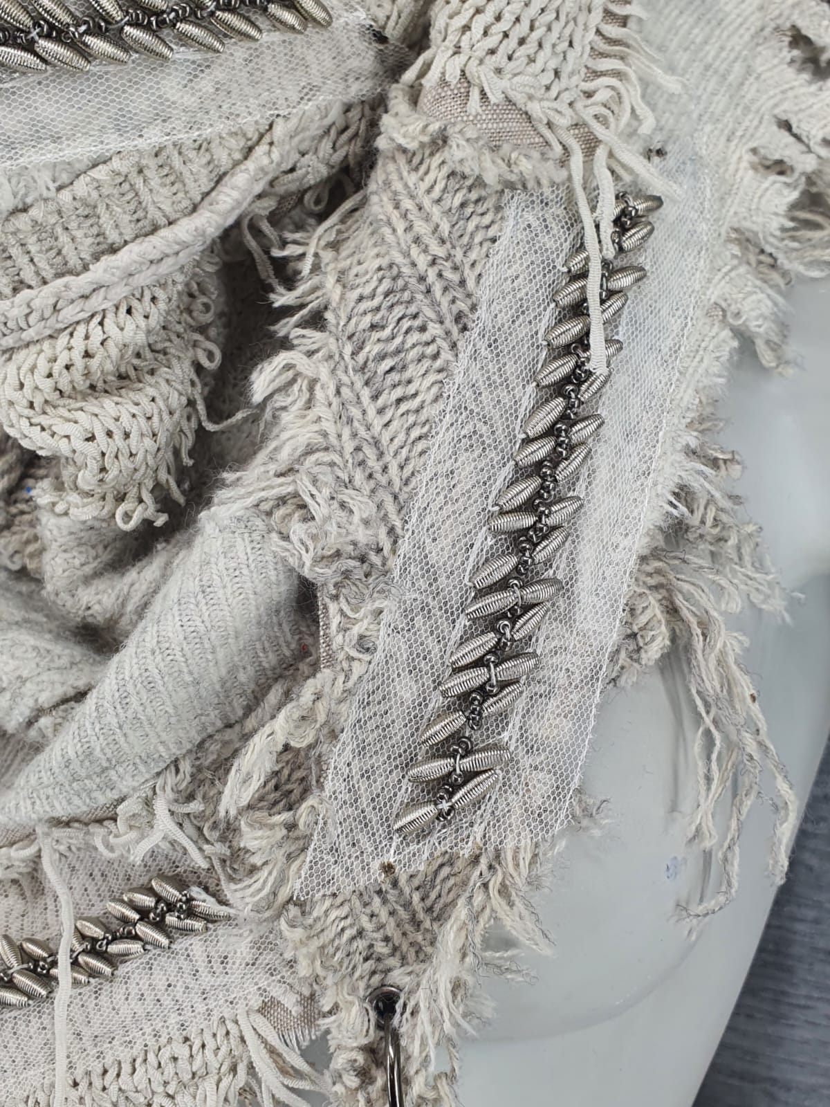 Шарф из светло серых джемперов на льняной основе, декорирован лентой с бусами. Элегантно, без излишеств.