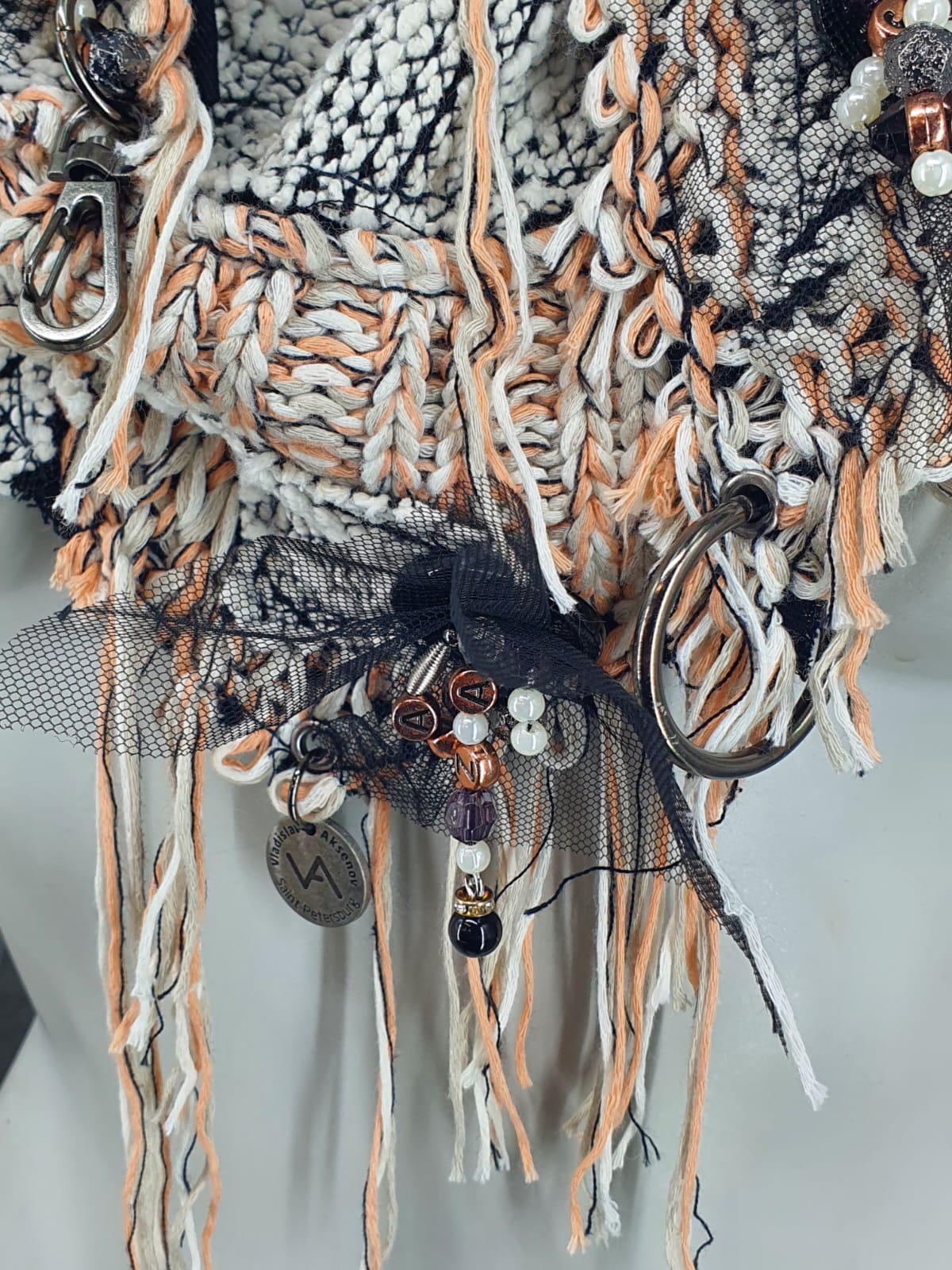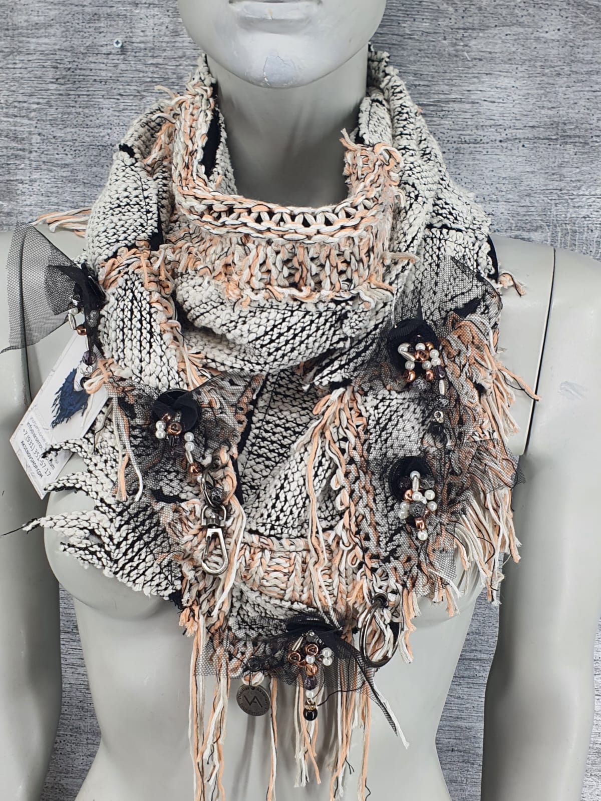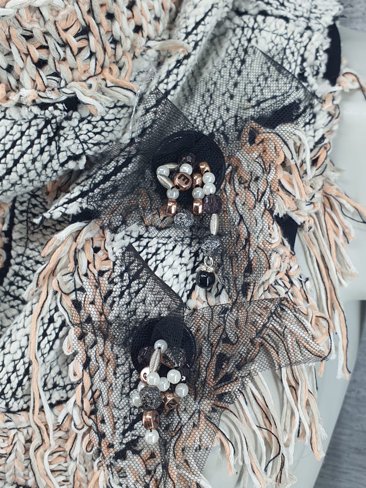 Шарф из джемперов на чёрной снове, декорирован пуговицами с сеткой и бусами. Такой шарф пригодиться и на каждый день, и украсит ваш вечерний образ.