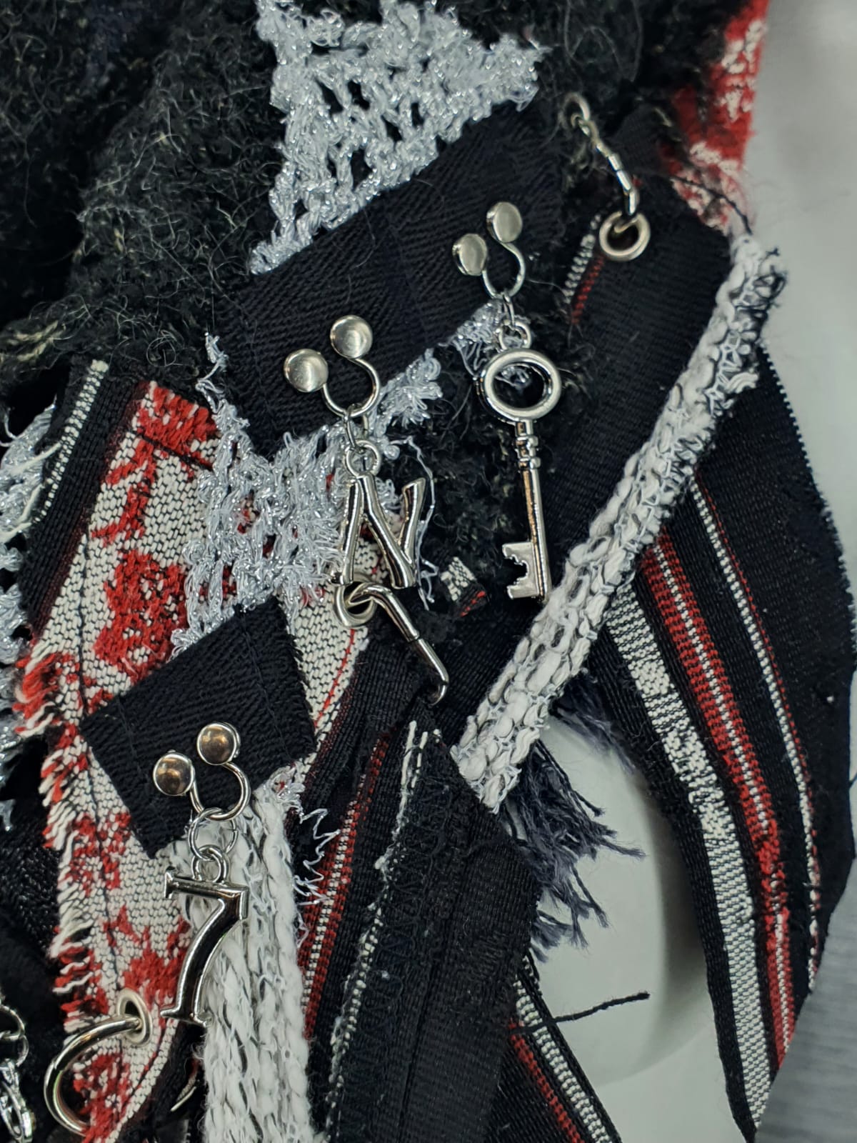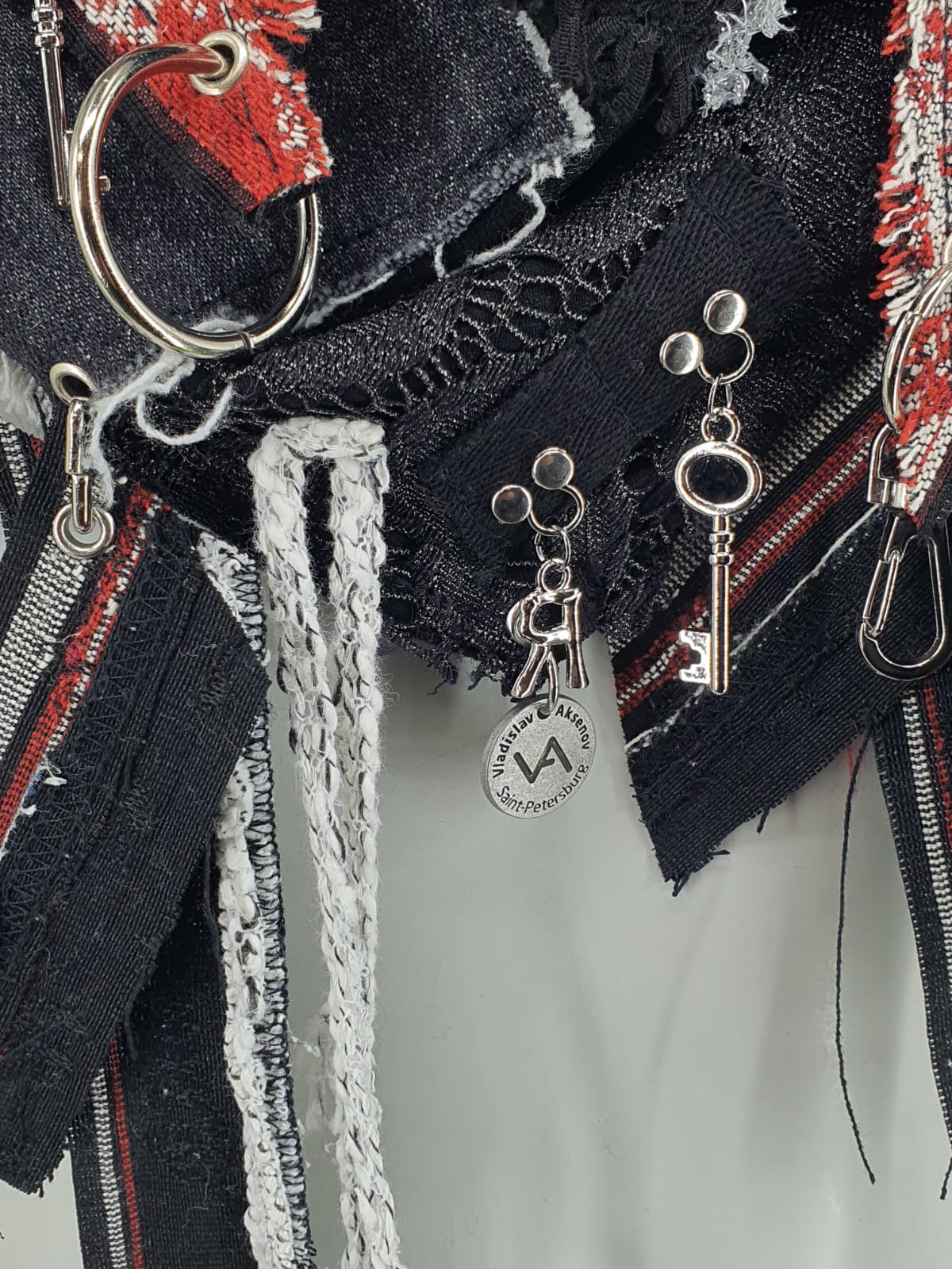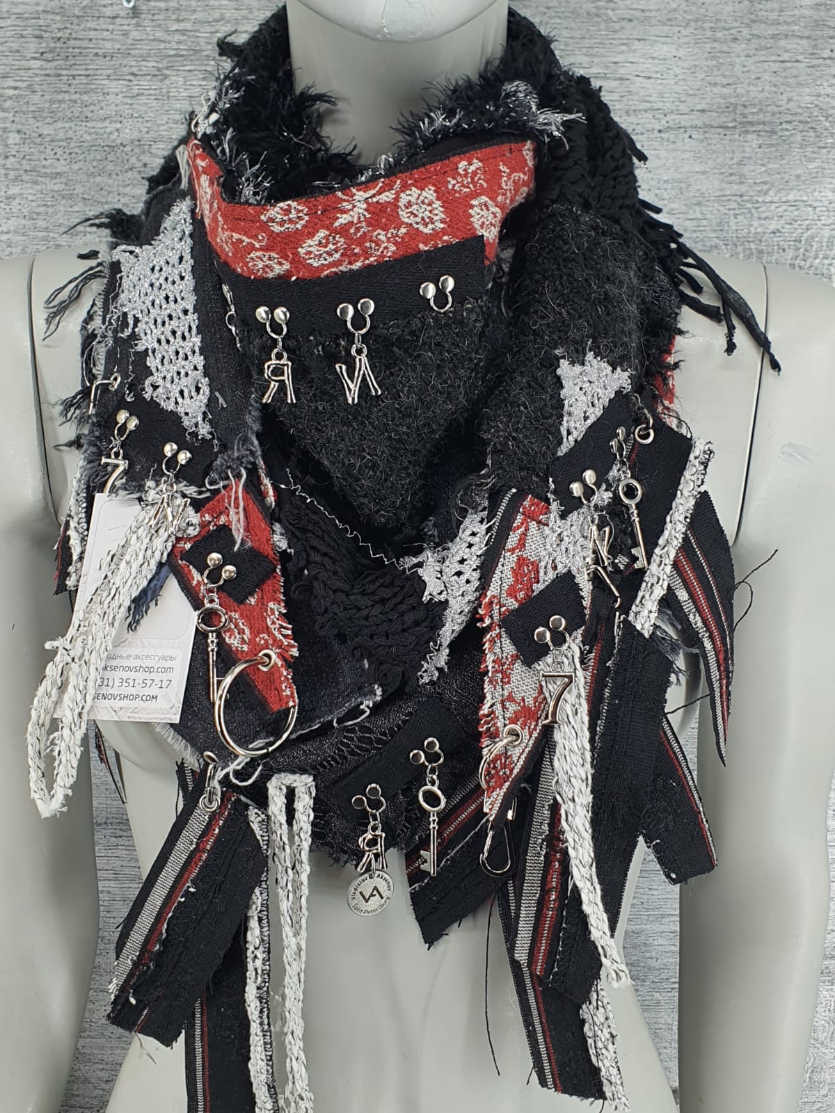 Шарф из различных джемперов, джинсов и кружева на чёрной хлопковой основе. Декорирован корсетной лентой с подвесами и шнурами.