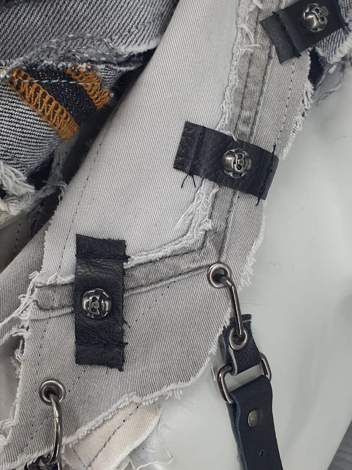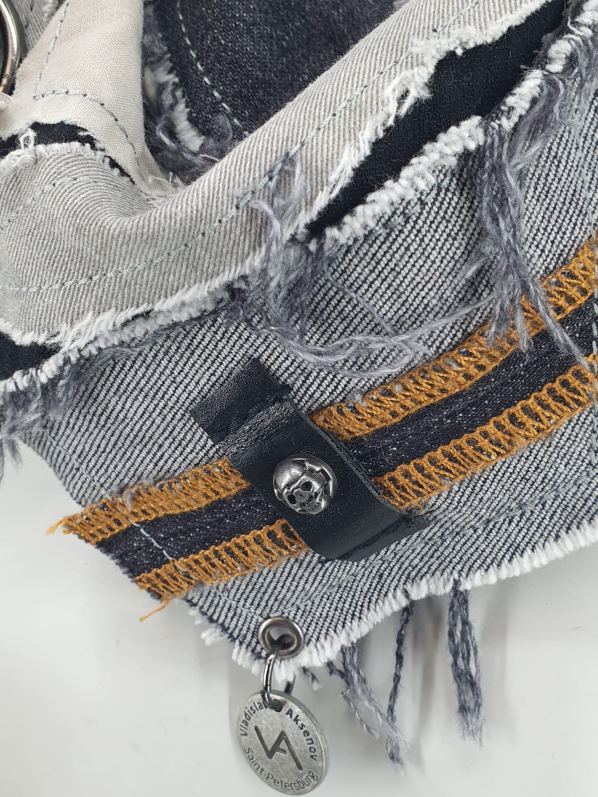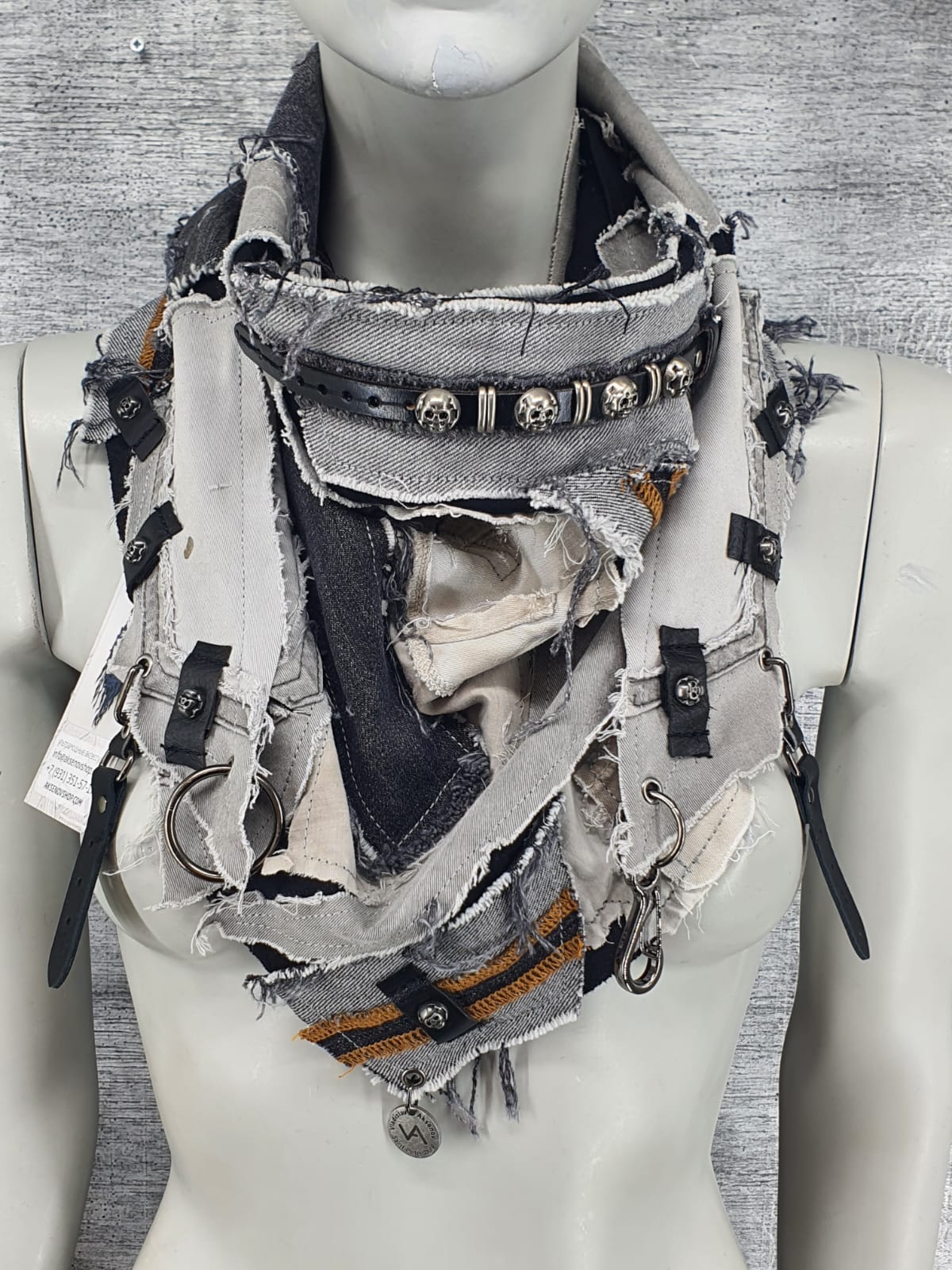 Джинсовый шарф с кожаным браслетом, нашивками и подвесами. Отличный подарок для смелых, любяших скорость и путешествия.