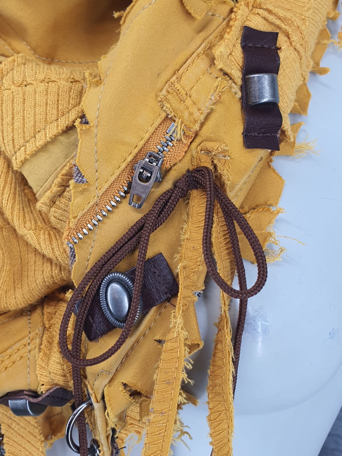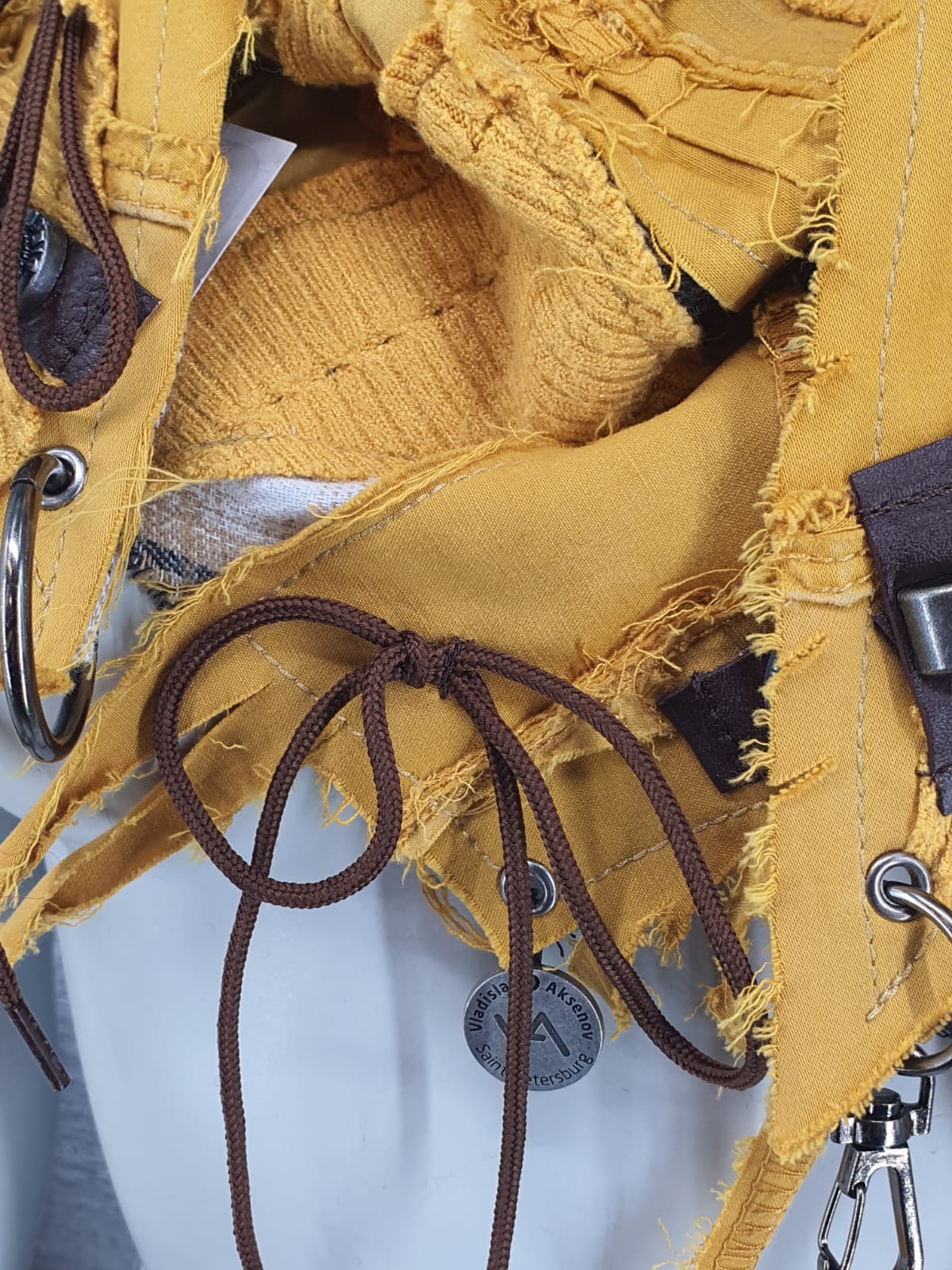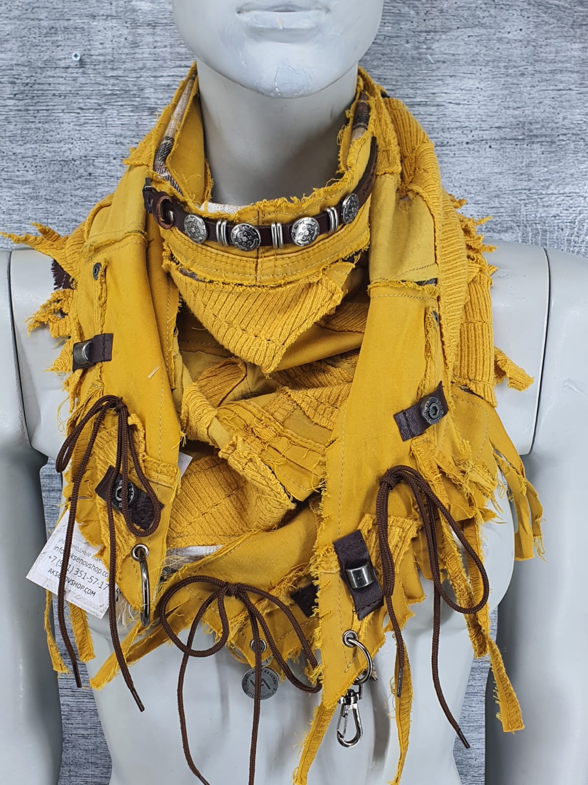 Шарф из желтых джинсов и джемпера на основе в клетку, декорирован коричневым кожаным браслетом, нашивками и шнурками.