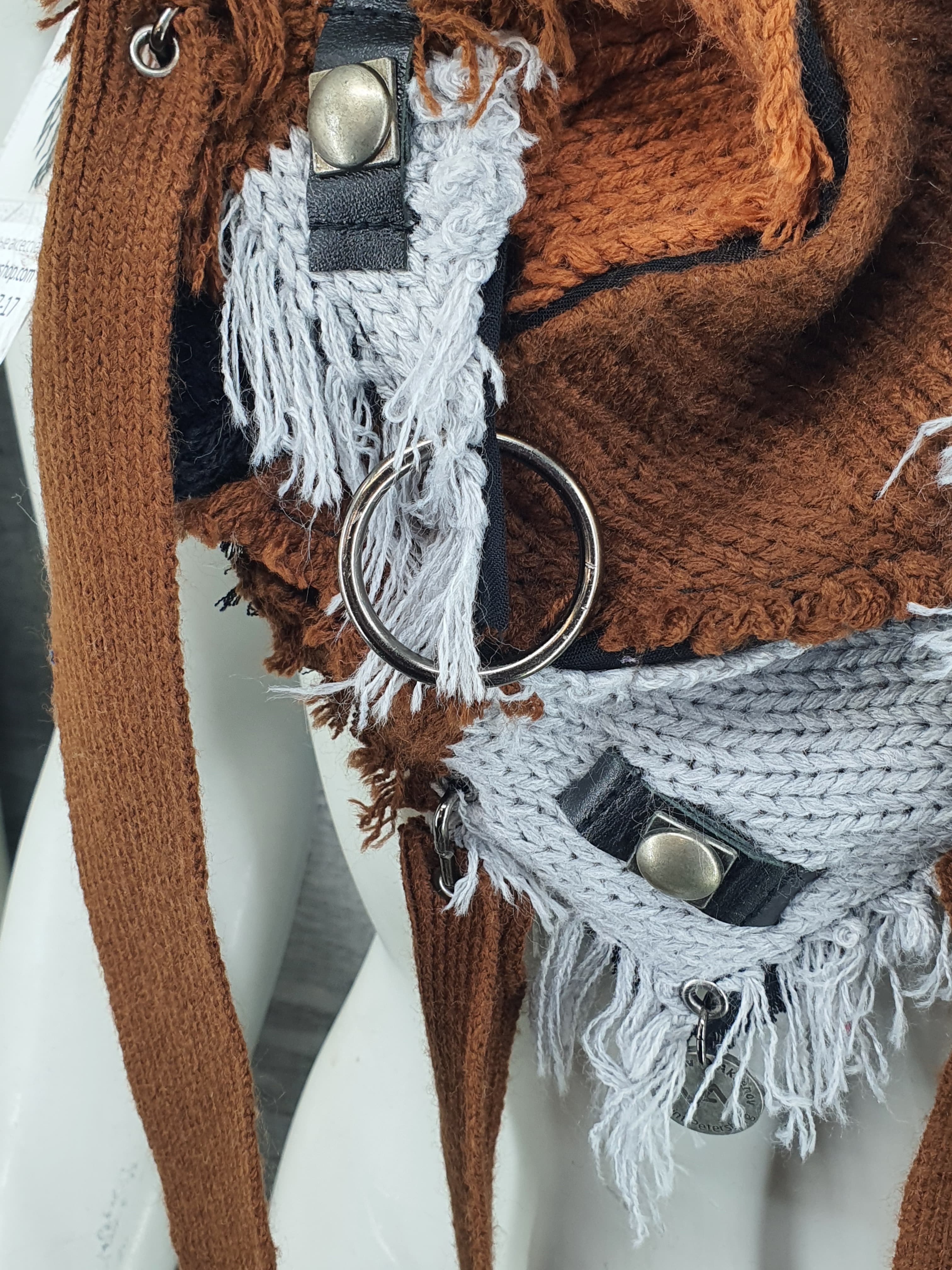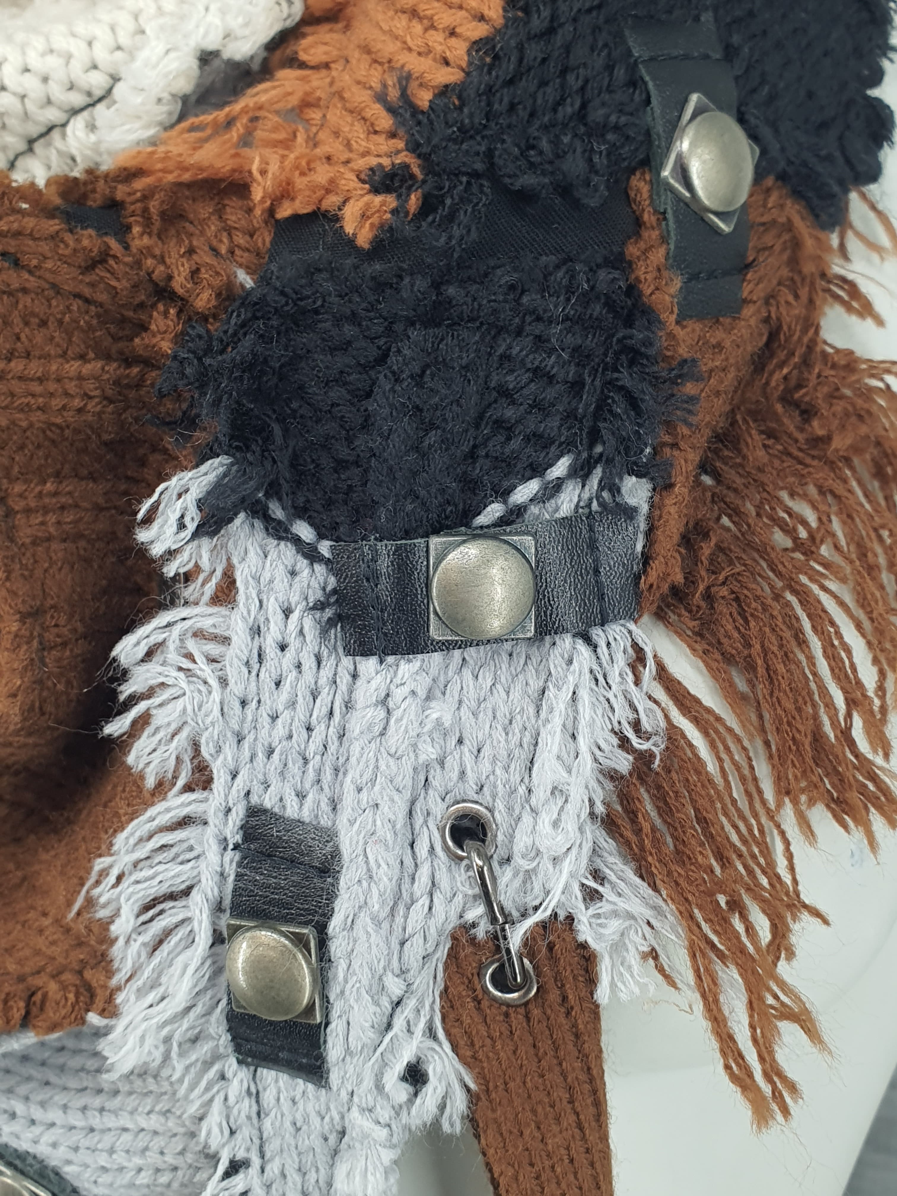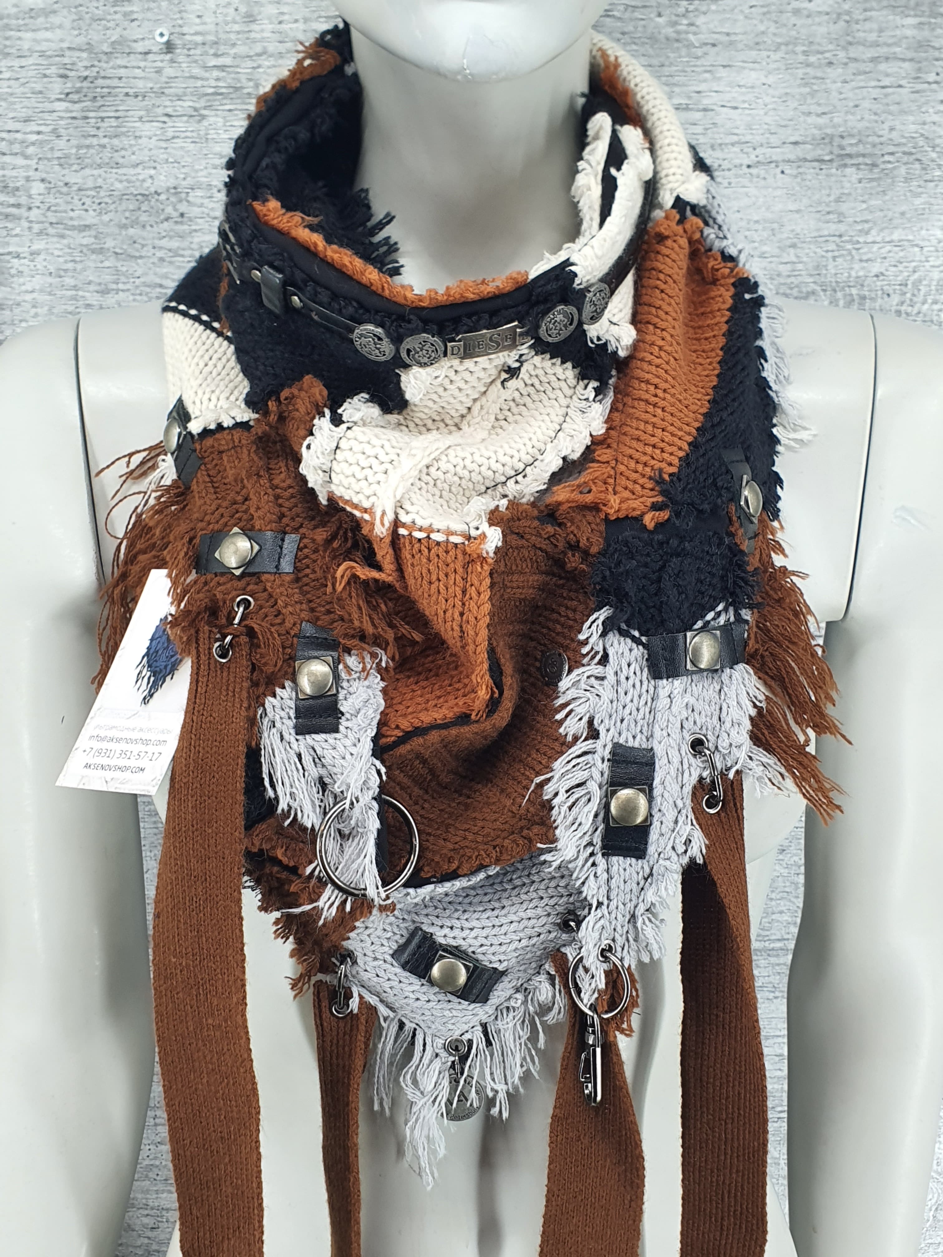 Шарф из джемперов разных цветов, декорирован кожаным браслетом, нашивками и подвесами. Мягкий и пластичный.