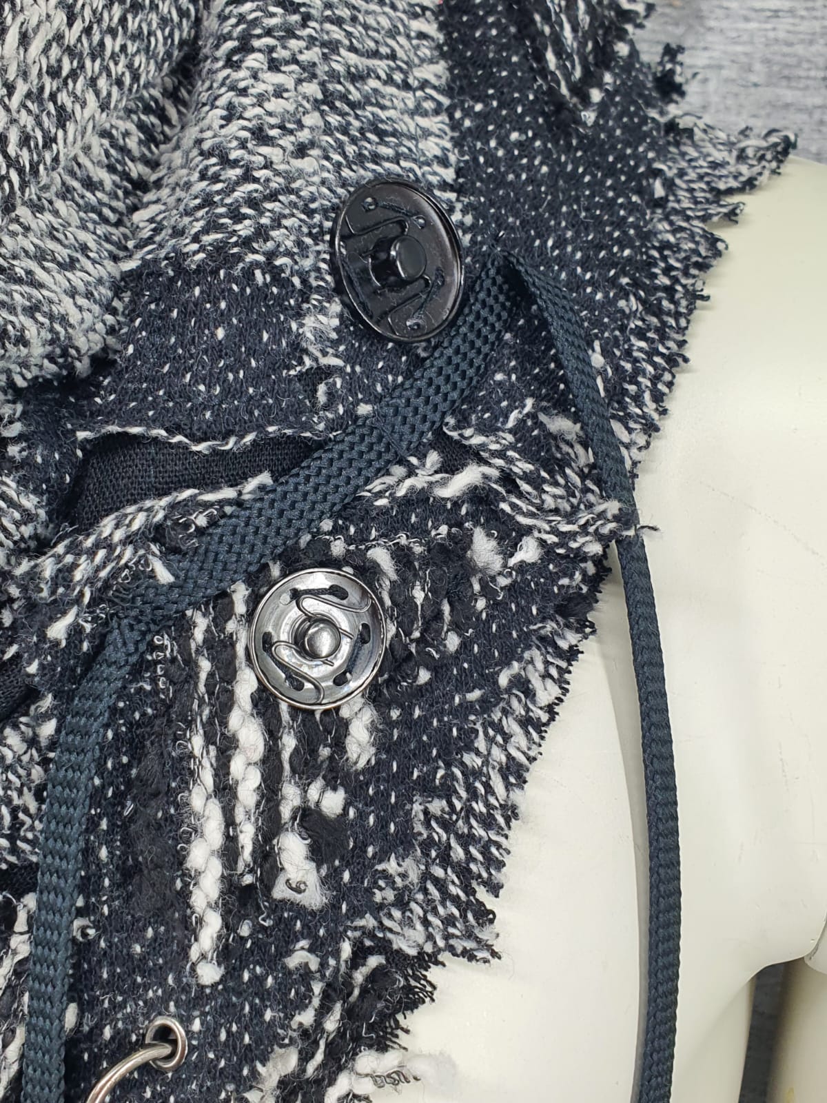 Шарф из серого жакета на чёрной хлопковой основе, декорирован корсетной лентой с подвесами и кнопками. Такой шарф сделает ваш образ выразительнее.