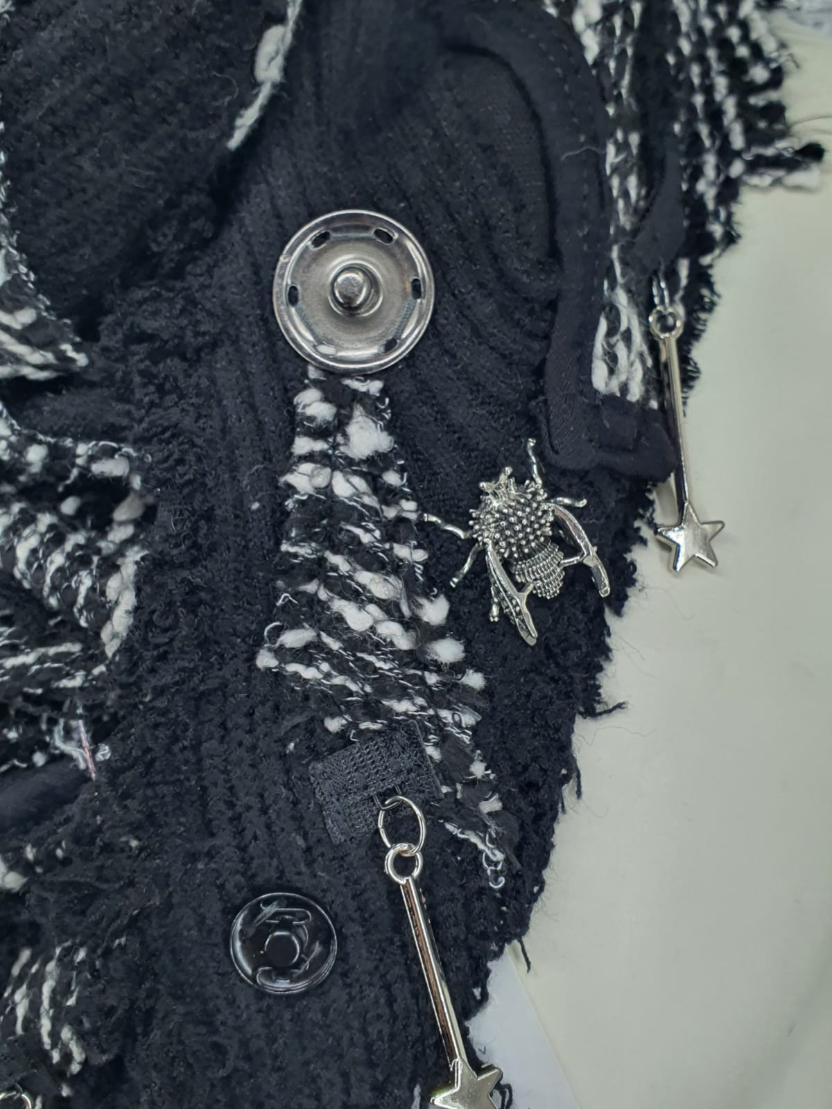 Шарф из вещей в чёрно-белом цвете на чёрной хлопковой основе, декорирован различными металлическими элементами.