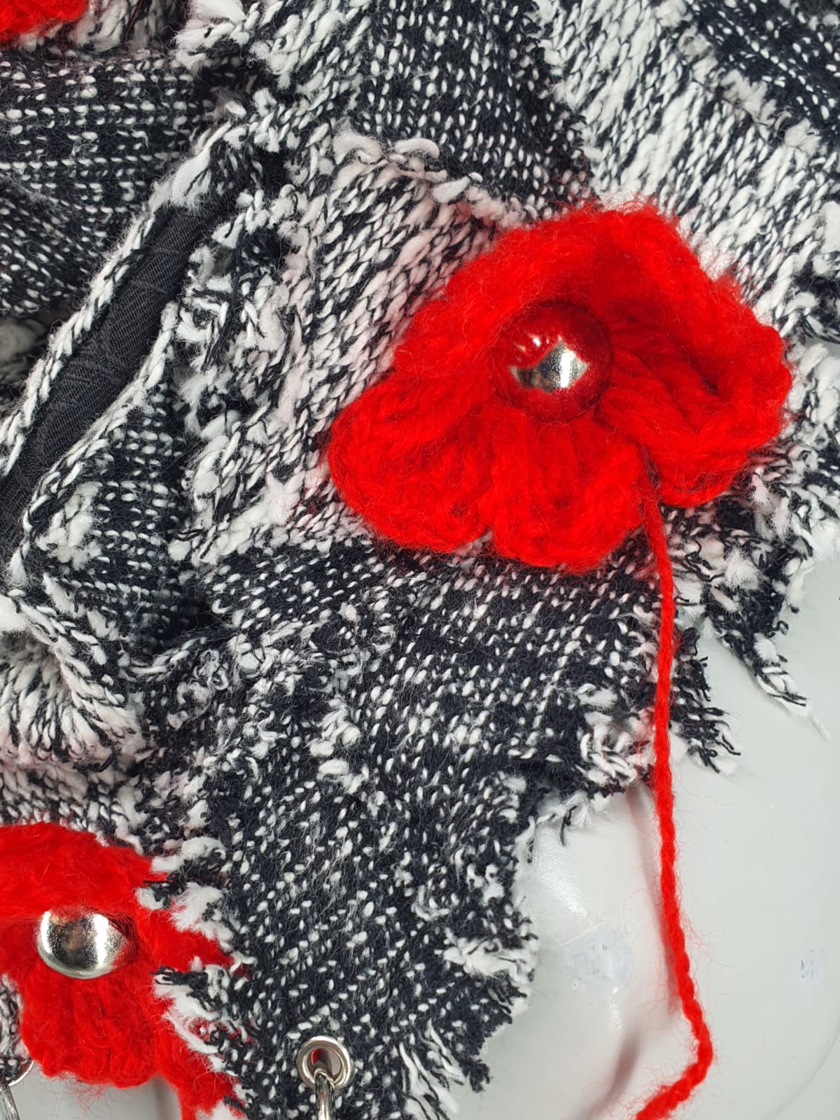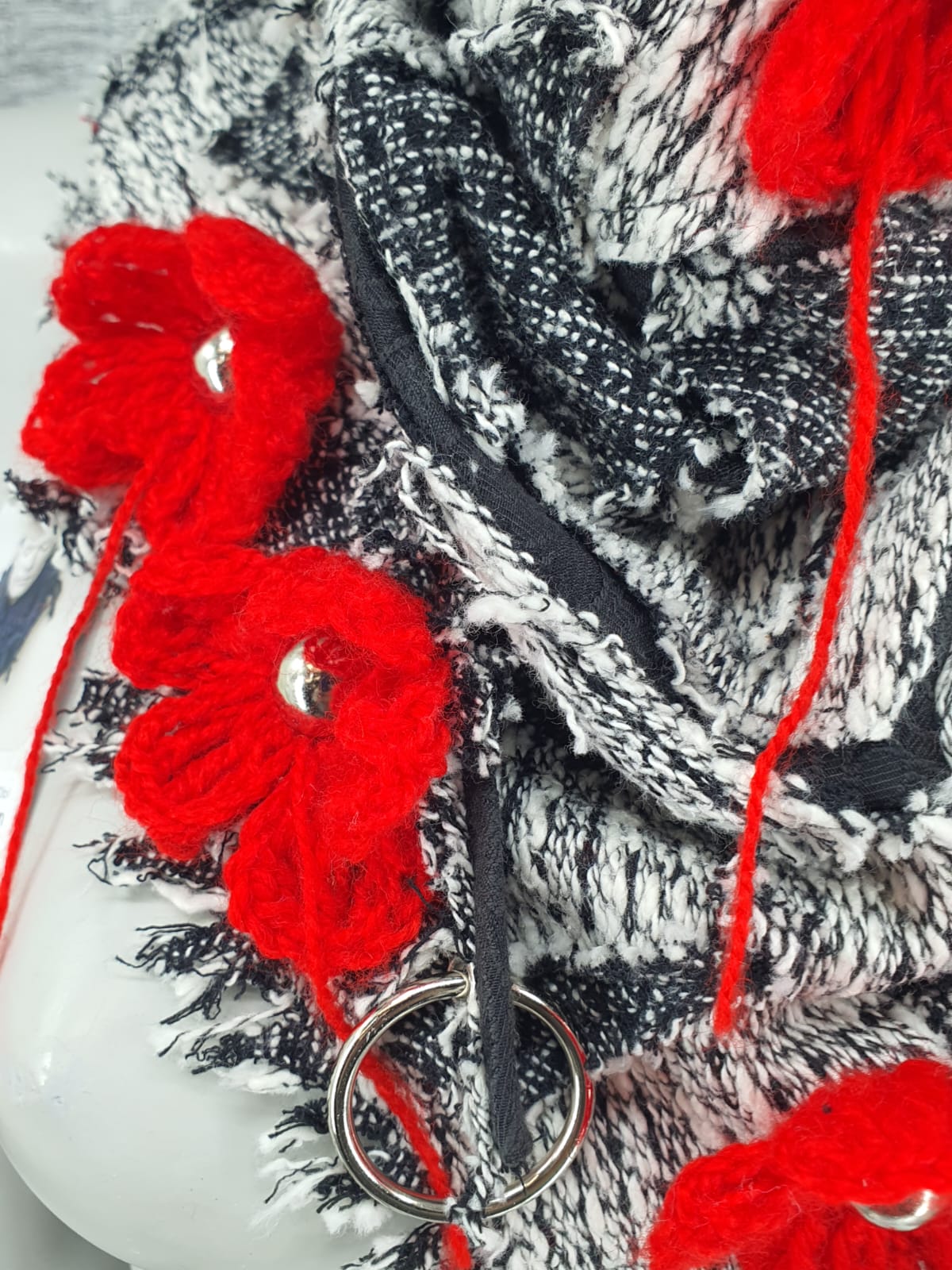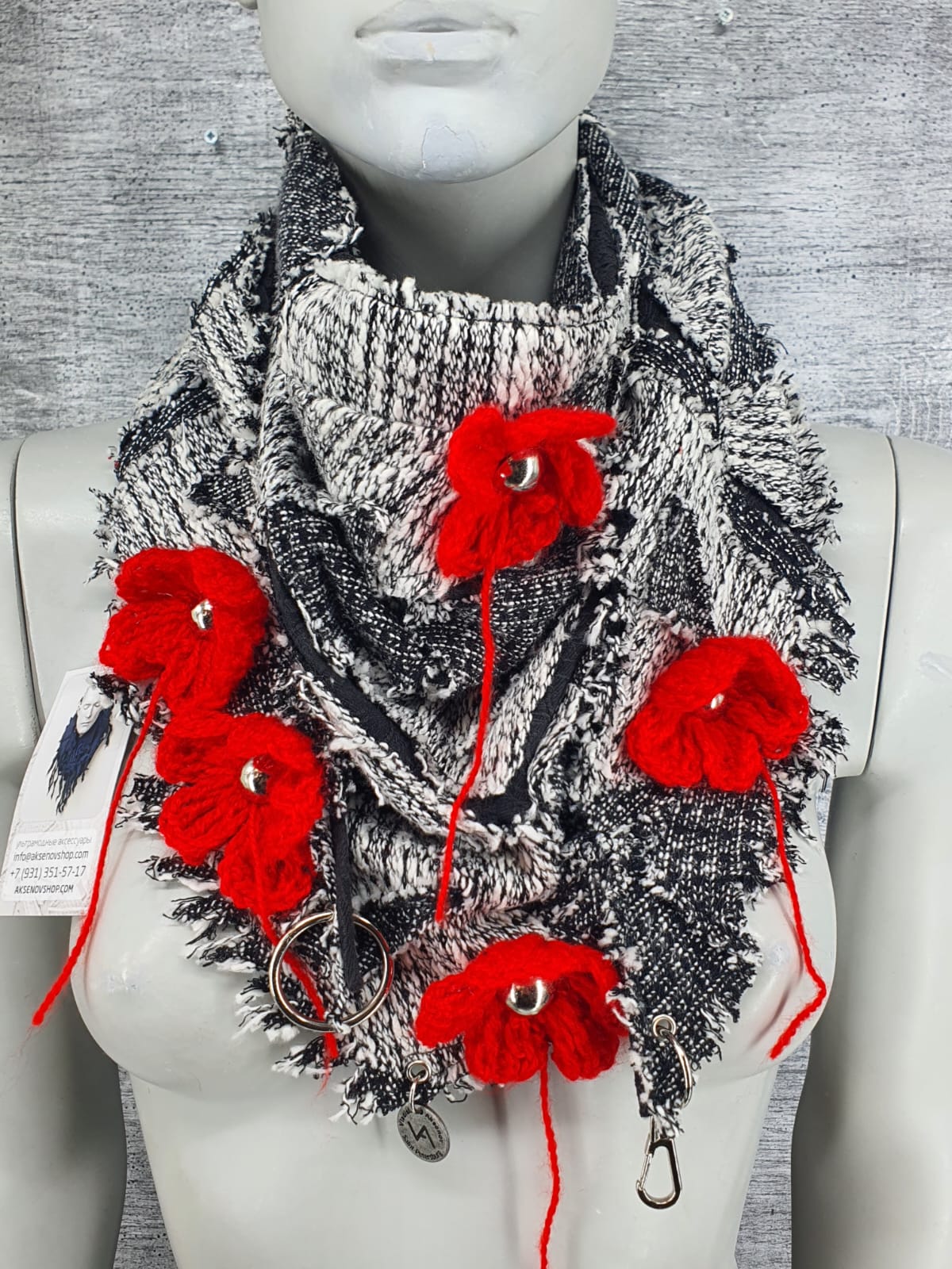Шарф из серого жакета на чёрной жаккардовой основе, декорирован красными вязаными цветами и металлическими пуговицами. Такой шарф сделает ваш образ ярче!