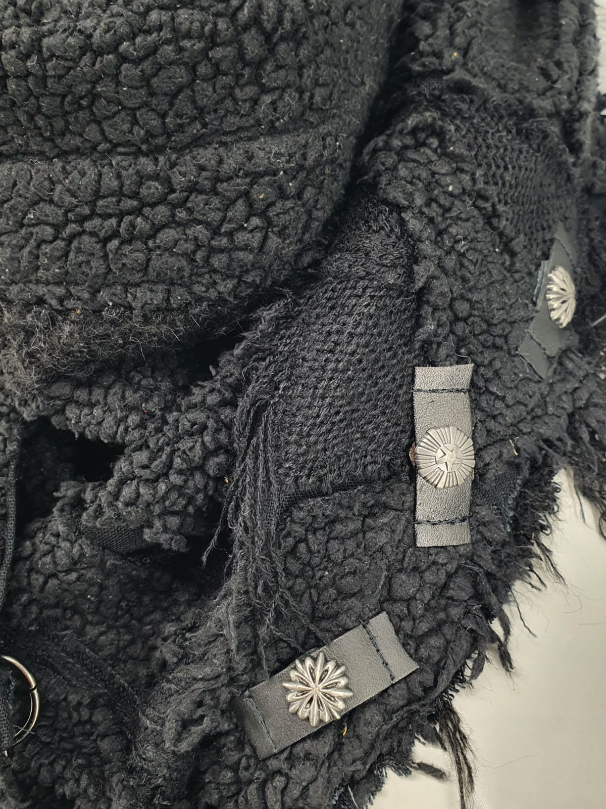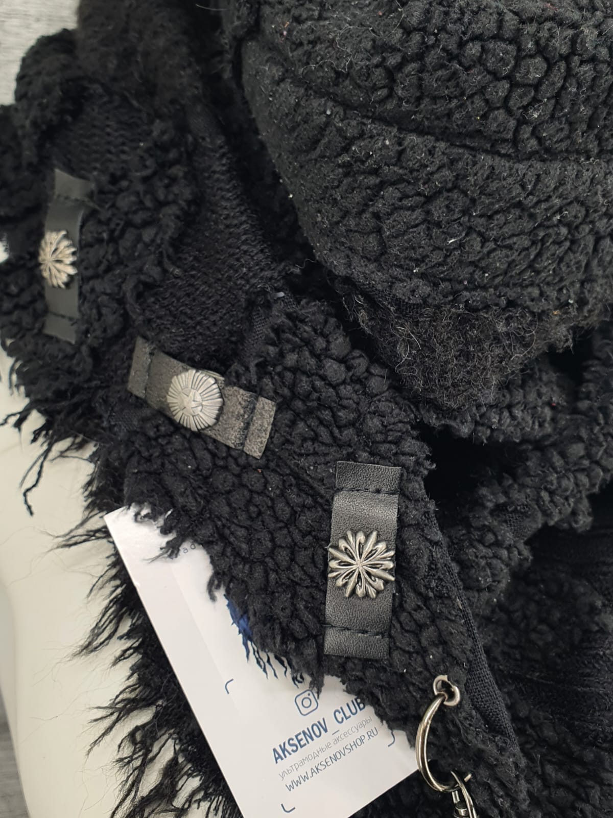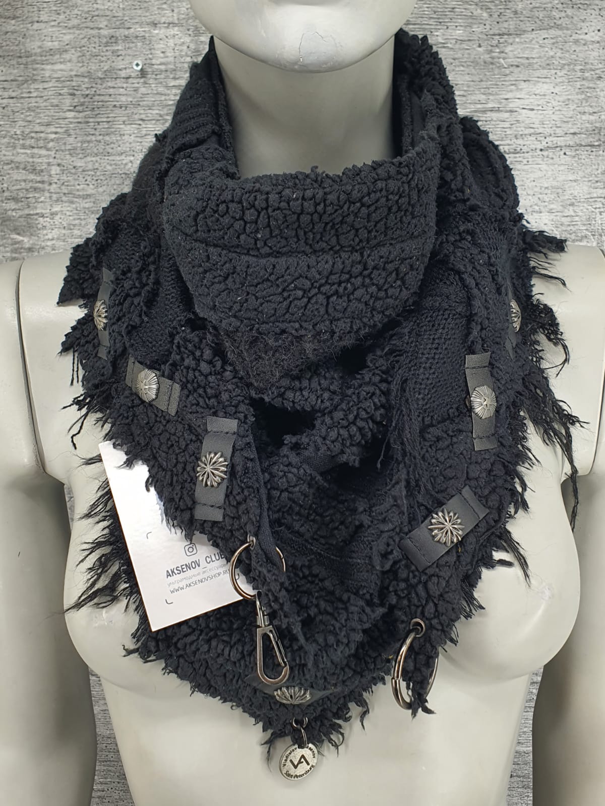 Чёрный шарф из джемперов н хлопковой основе, декорирован кожаными нашивками.