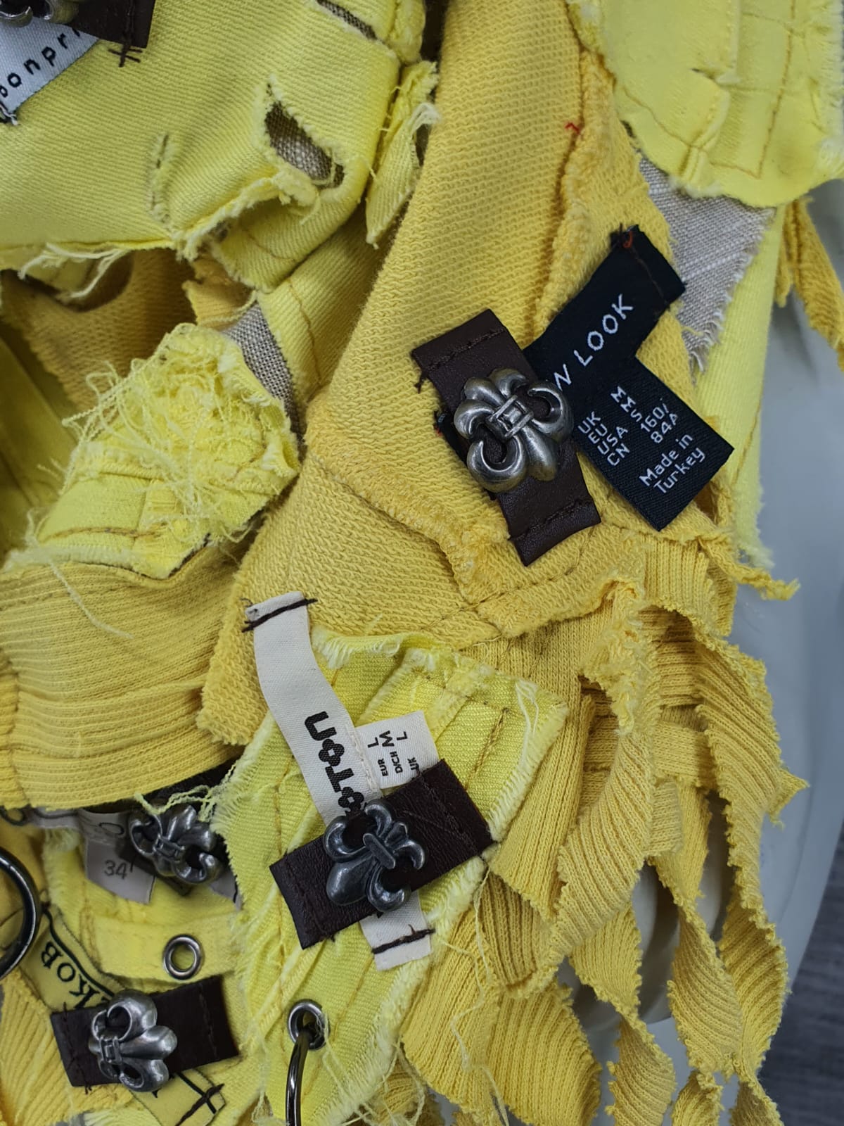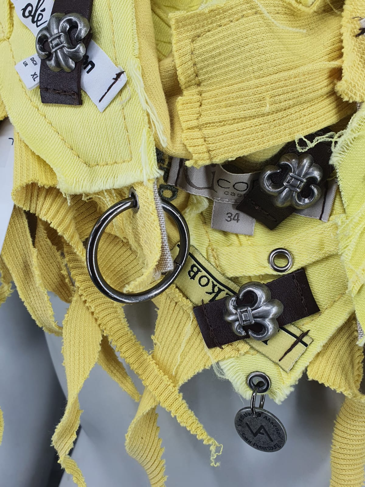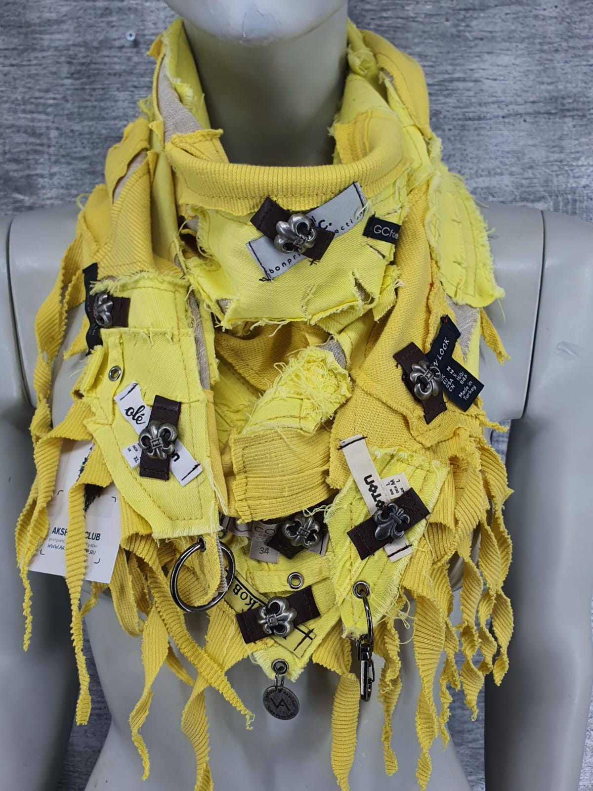 Шарф из лёгких хлопковых джинсов и футболки на льняной основе, декорирован различными нашивками. Желтый- это всегда тепло!