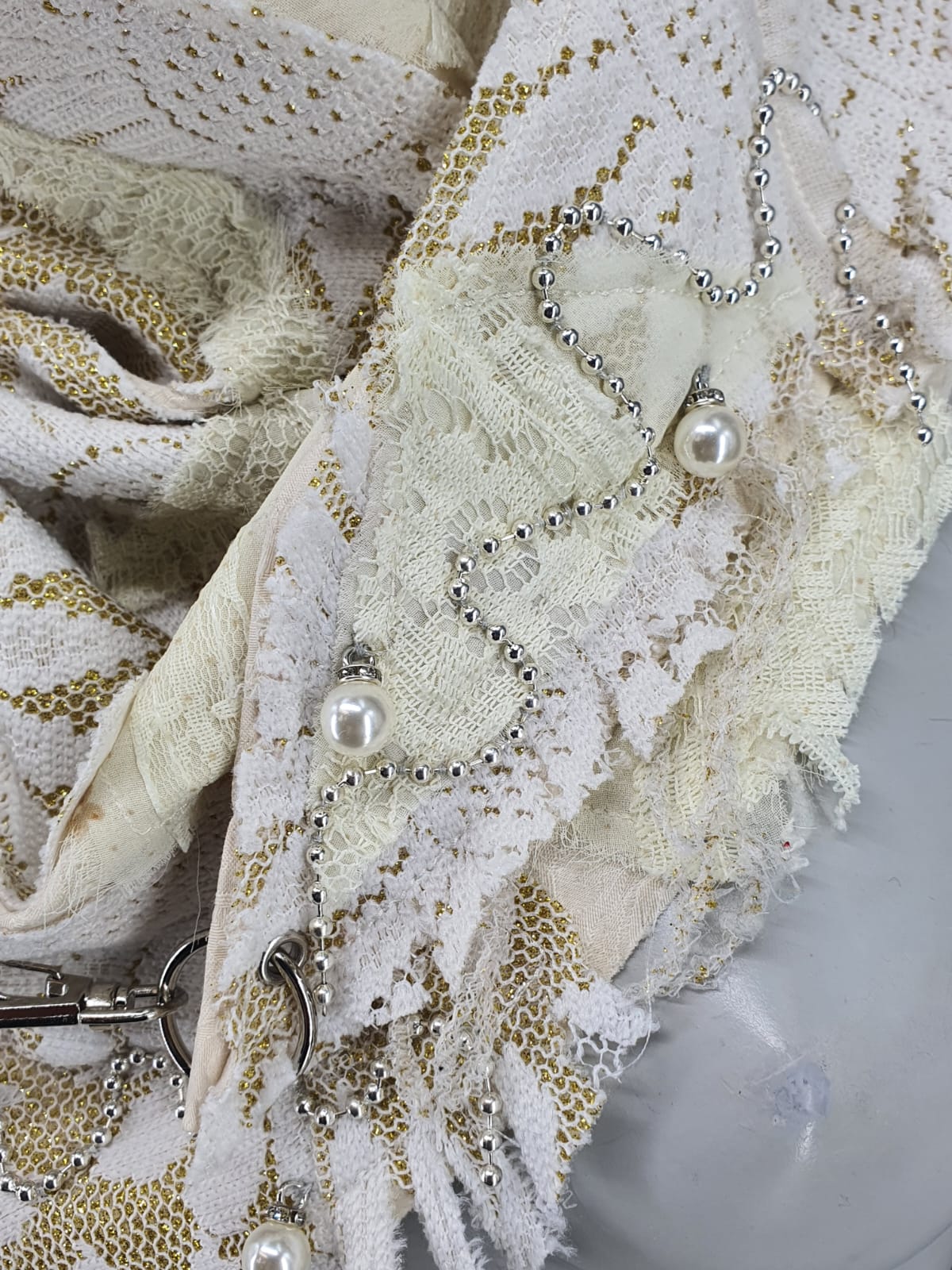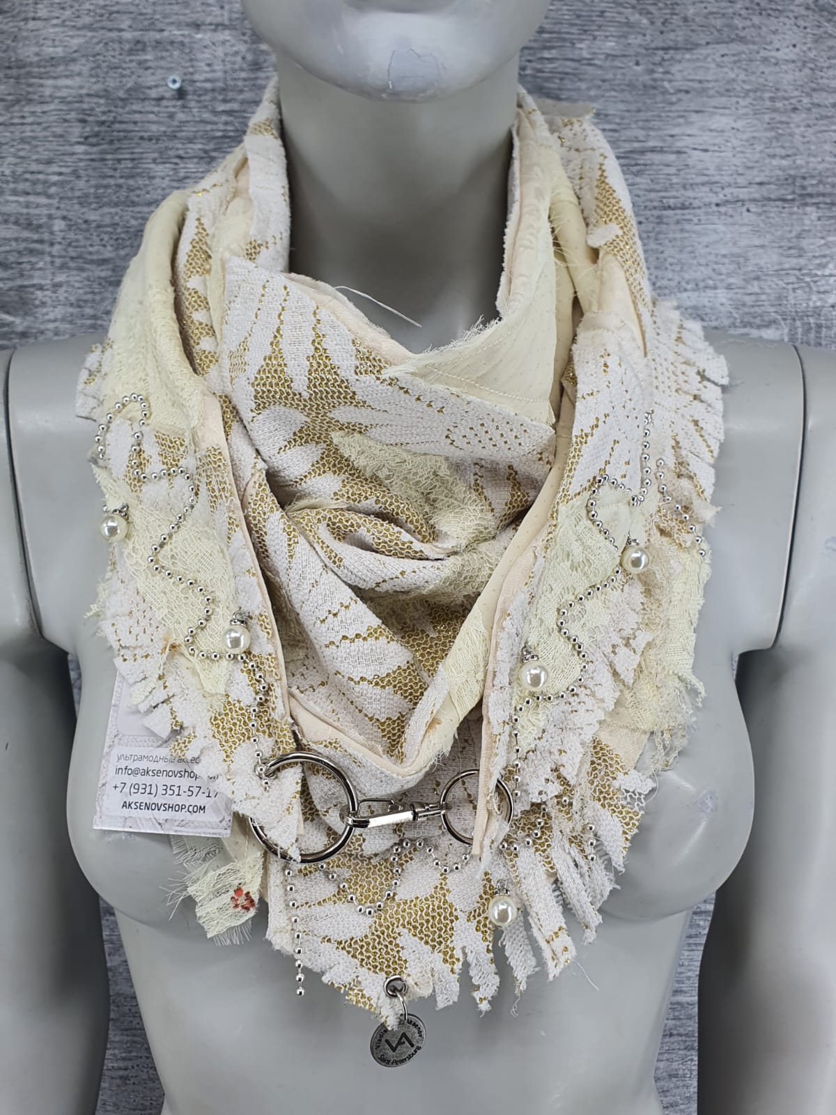 Нарядный шарф в бело-молочных оттенках с люрексом, на основе из жаккарда. Декорирован бусинами и цепочкой. Пусть в жизни будет праздник каждый день!