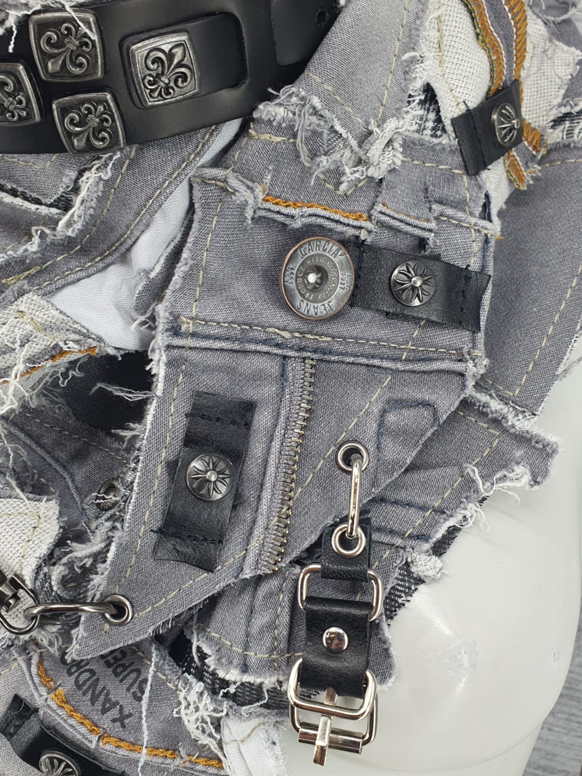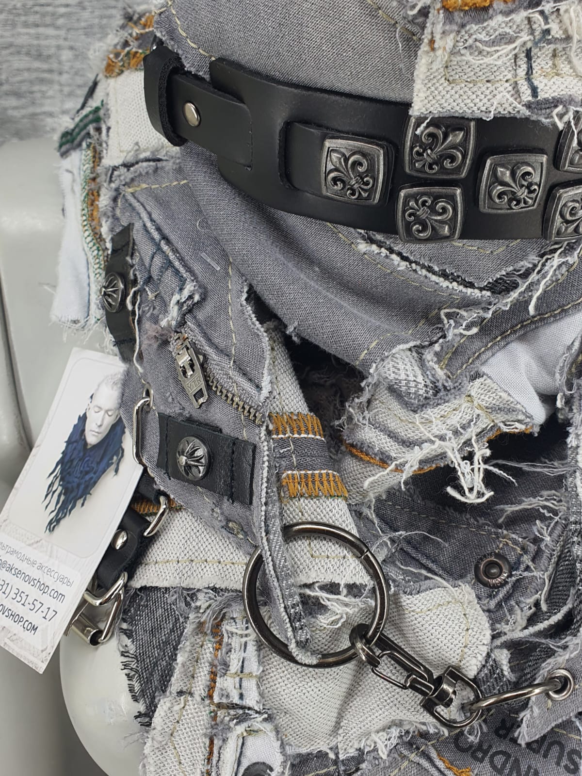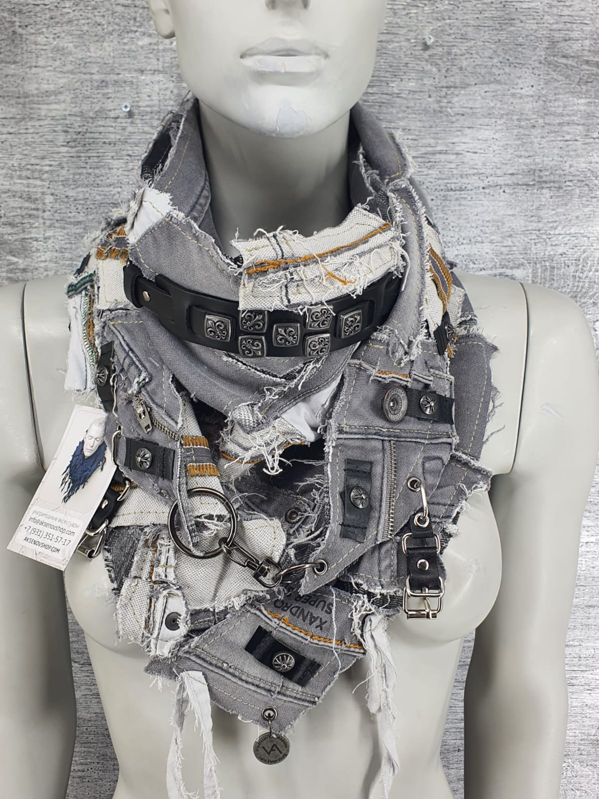 Шарф из серых джинсов на чёрной основе, декорирован чёрным кожаным браслетом , нашивками и подвесами. Всегда есть повод поменять всё!