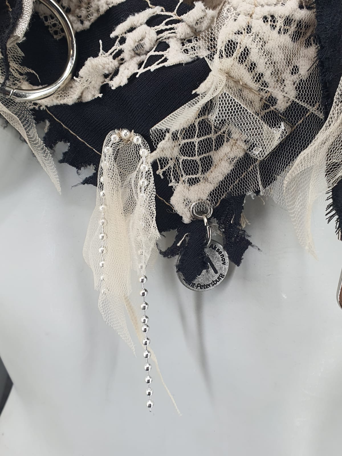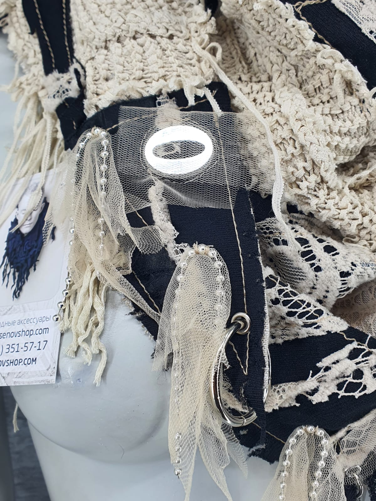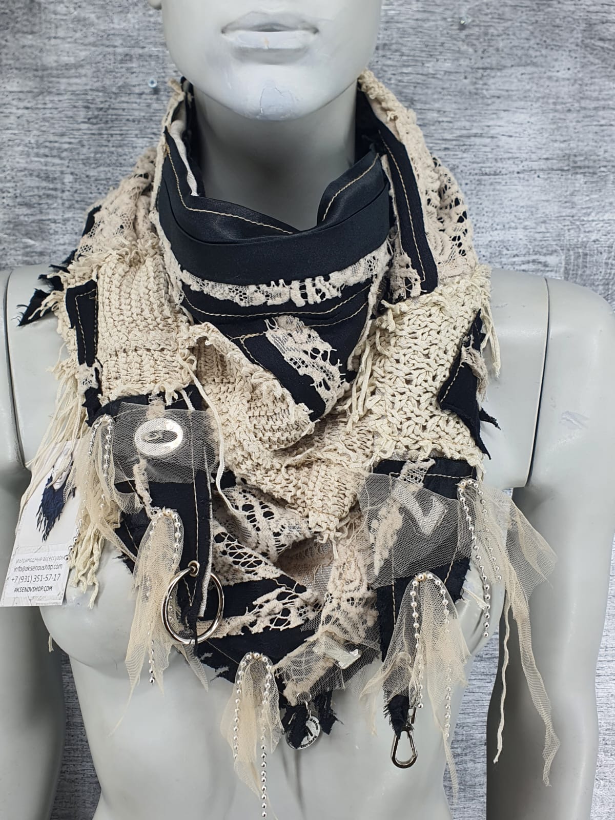 Шарф из джемпера и трикотажного кружева на чёрной основе, декорирован буквами и цепочками под сеткой. С таким шарфом не важно где вы окажетесь в конце дня, в театре или на свидании.