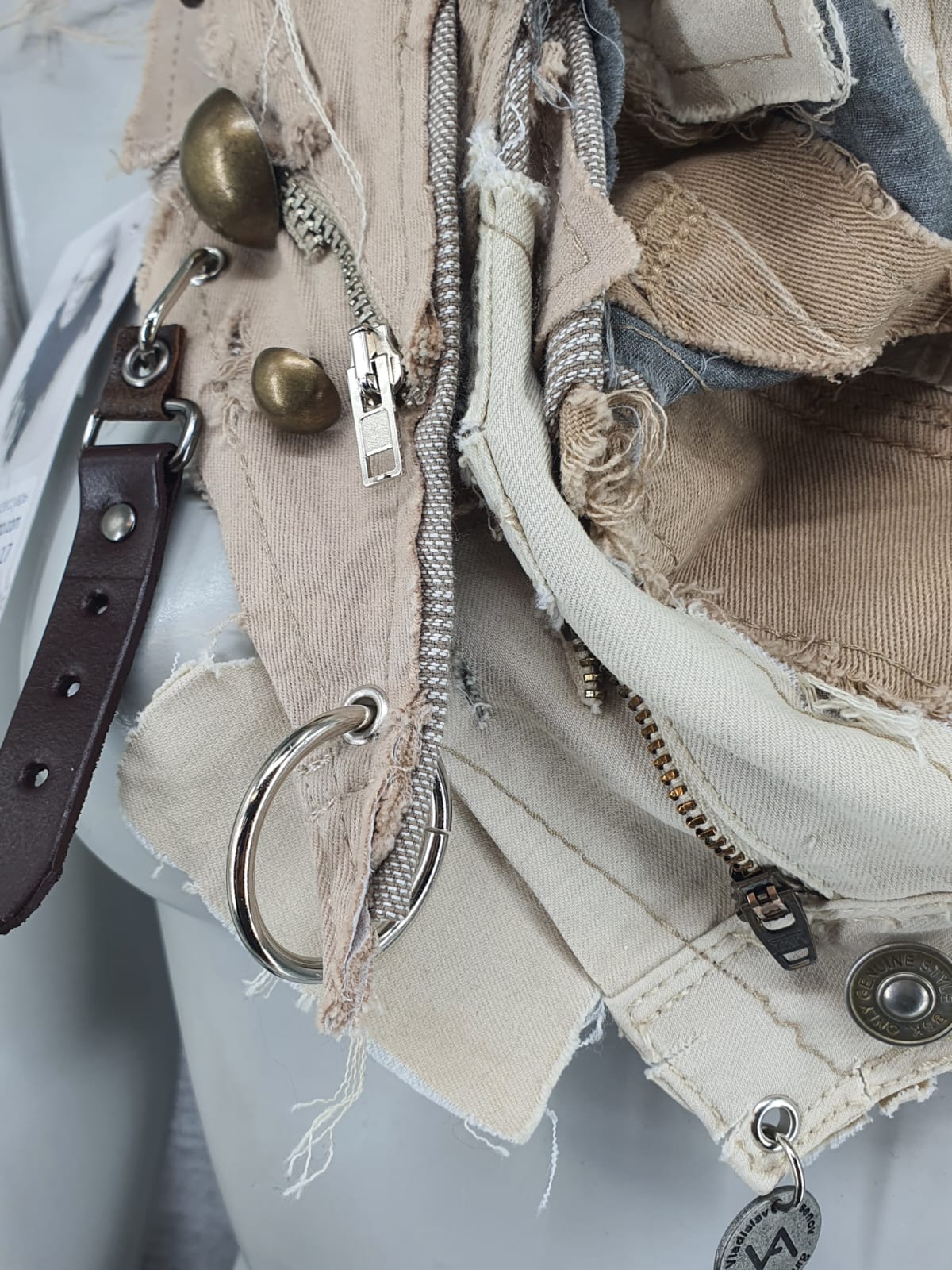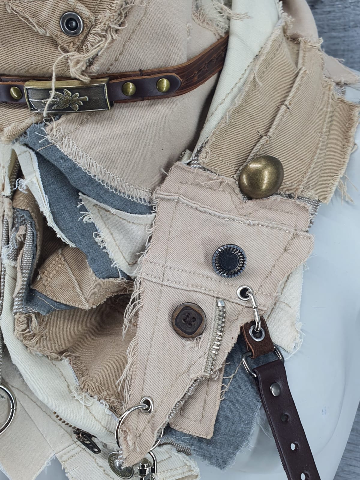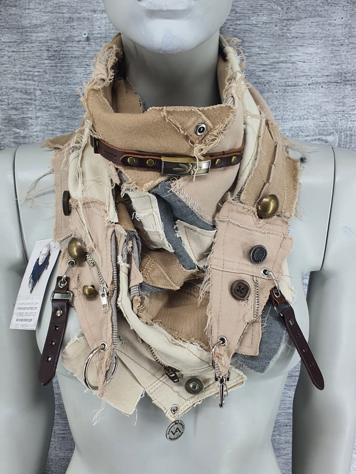 Шарф из бежевых джинсов разных оттенков на бежевой основе, декорирован кожаным браслетом, подвесами и различными пуговицами. Прекрасный повод поехать в отпуск с новым аксессуаром.