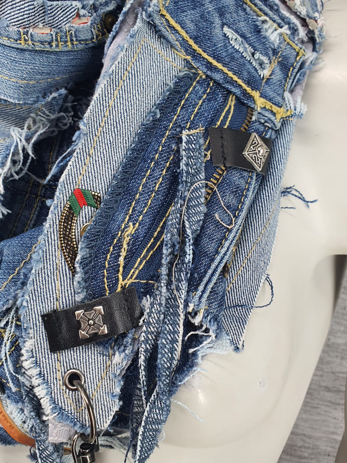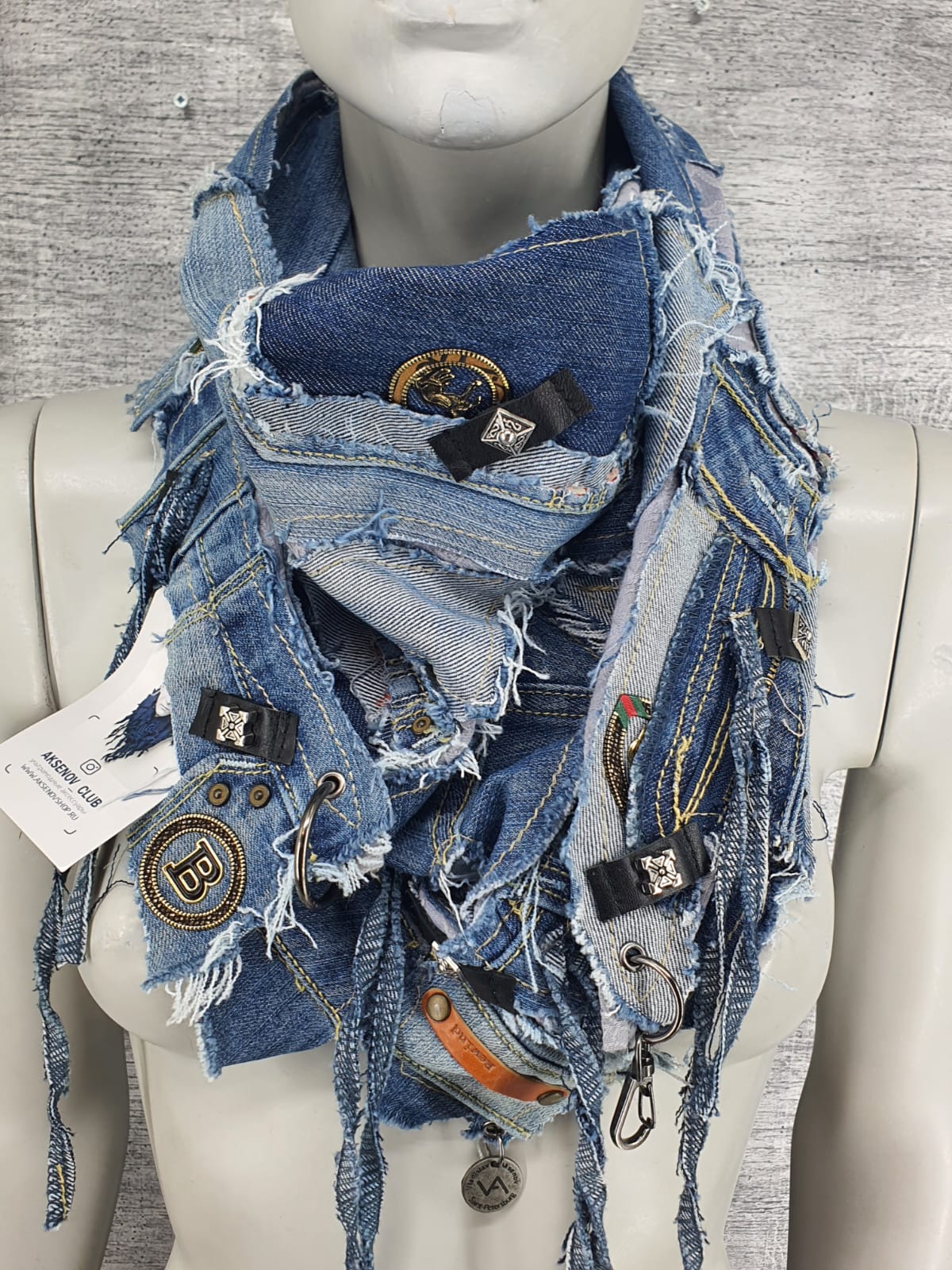Шарф из голубых джинсов на жаккардовой основе, декорирован кожаными нашивками и наклейками. Добавьте свободы и лёгкости !