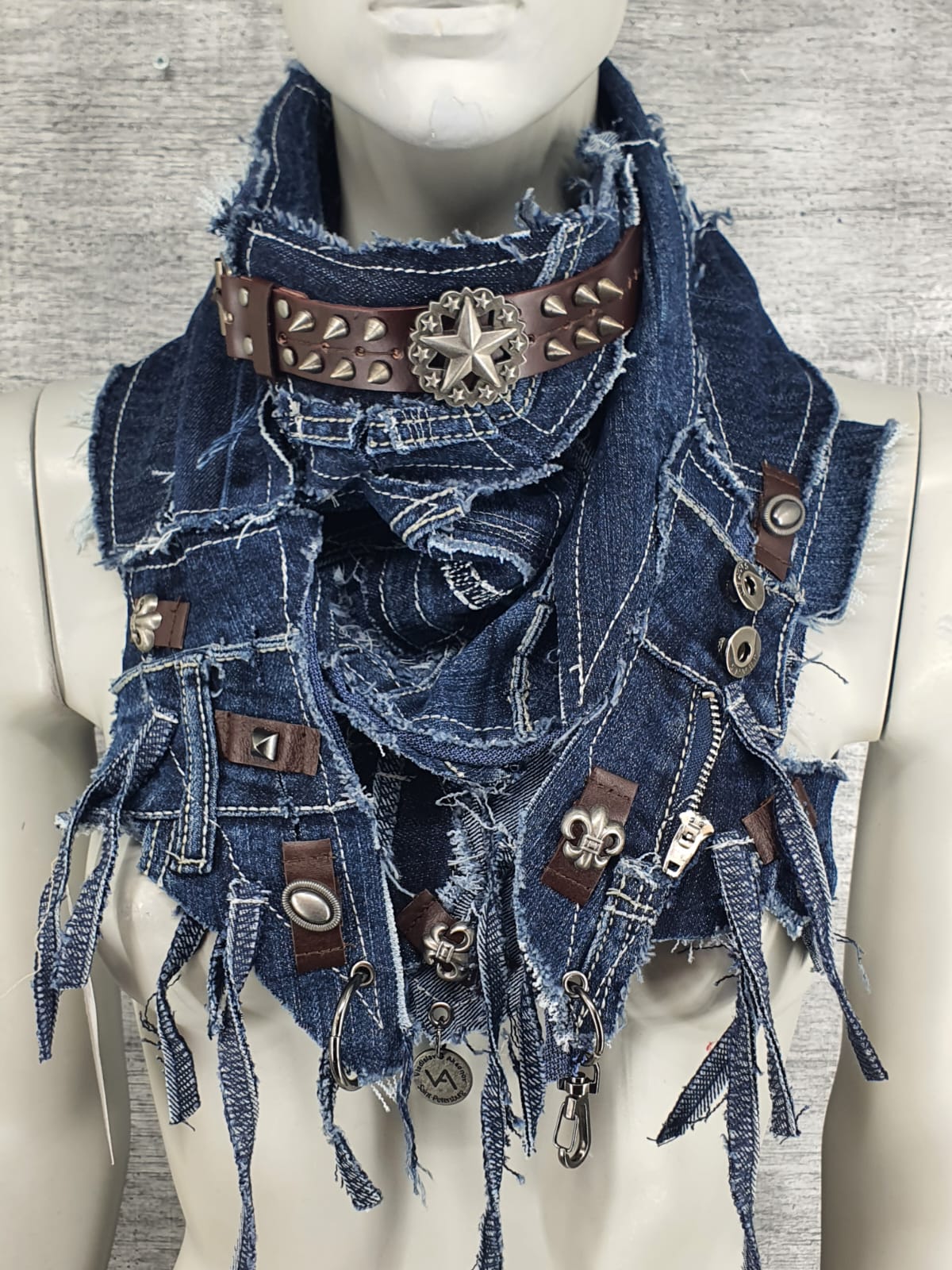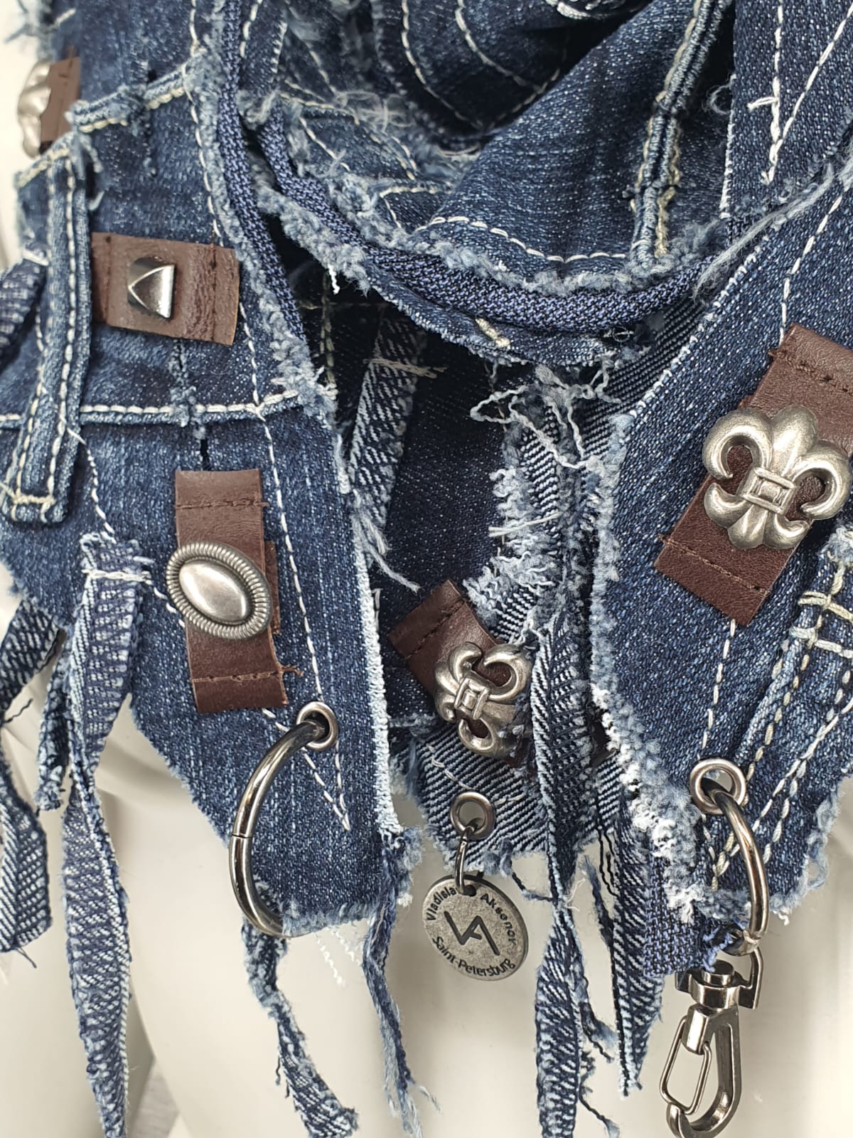 Шарф из синих джинсов на синей основе под лён, декорирован браслетом и кожаными нашивками.