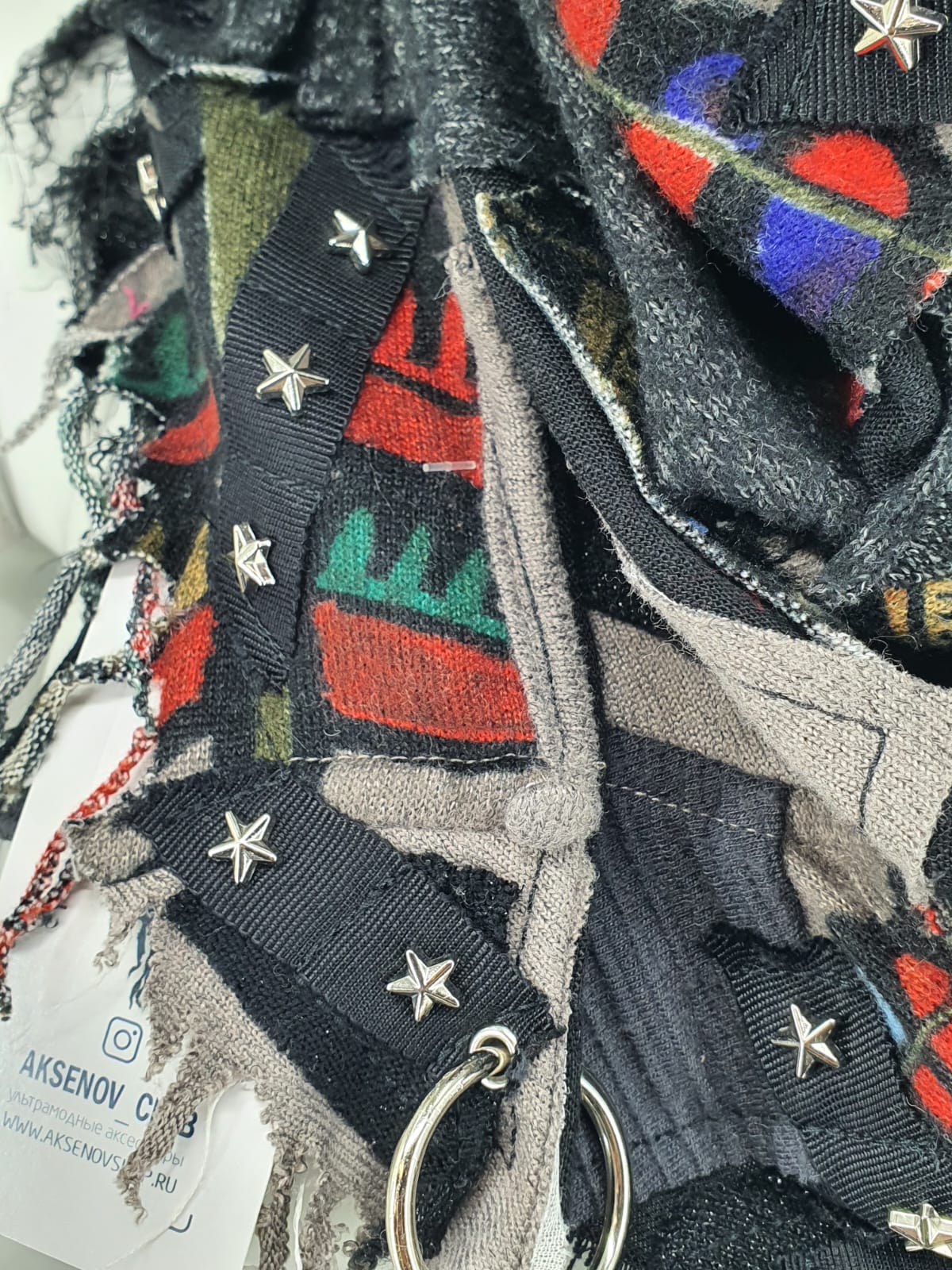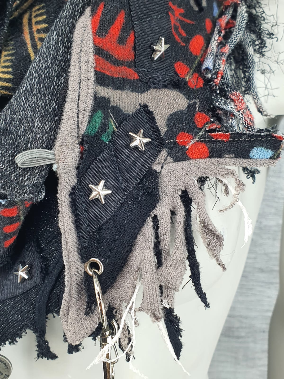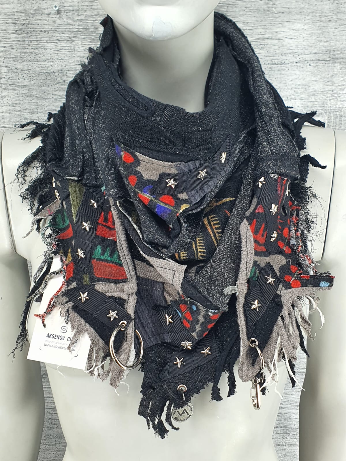 Шарф из различных вещей серо-чёрных цветов, вставками с этно принтом на чёрной хлопковой основе. Декорирован лентой со звёздочками.