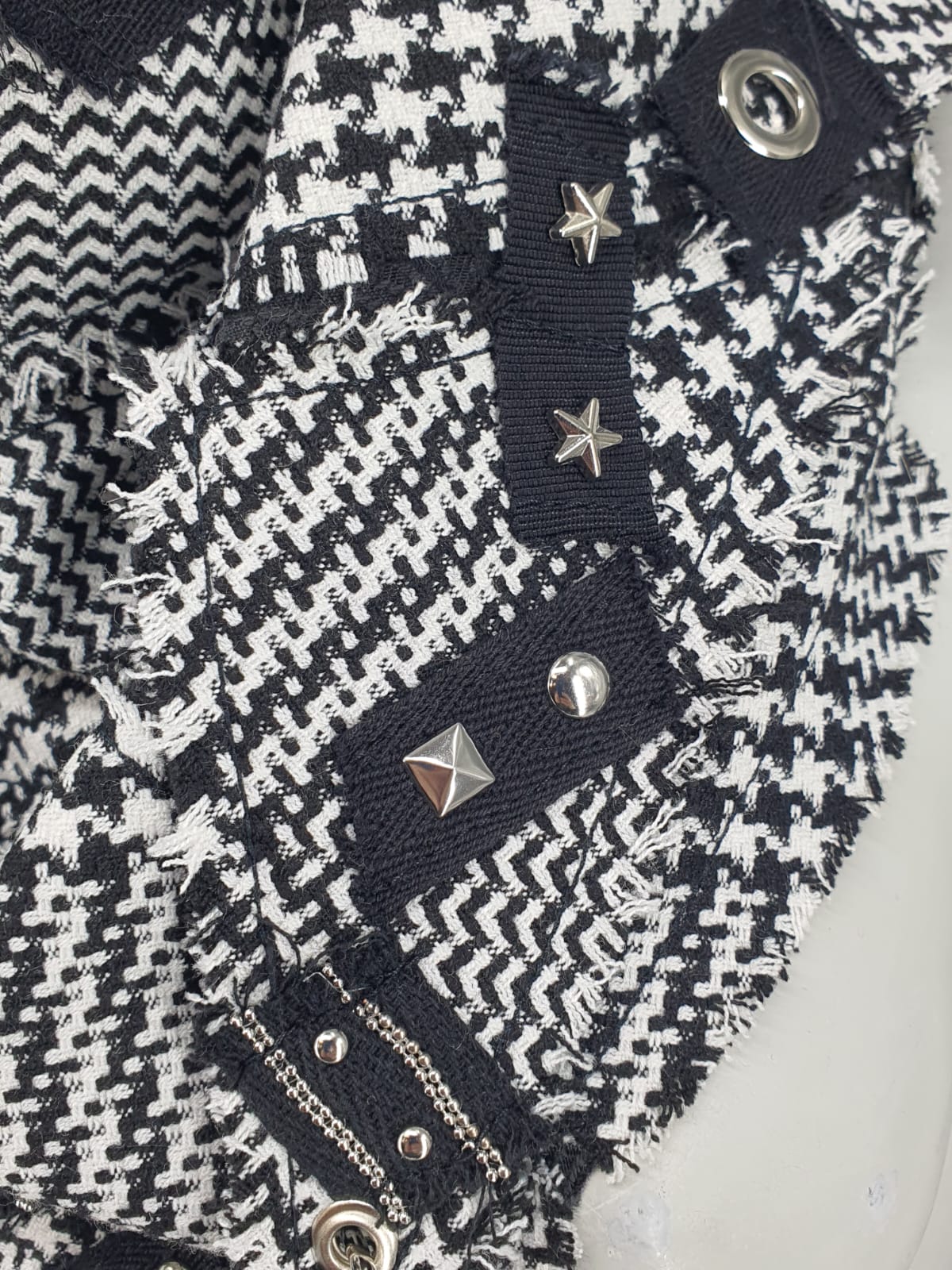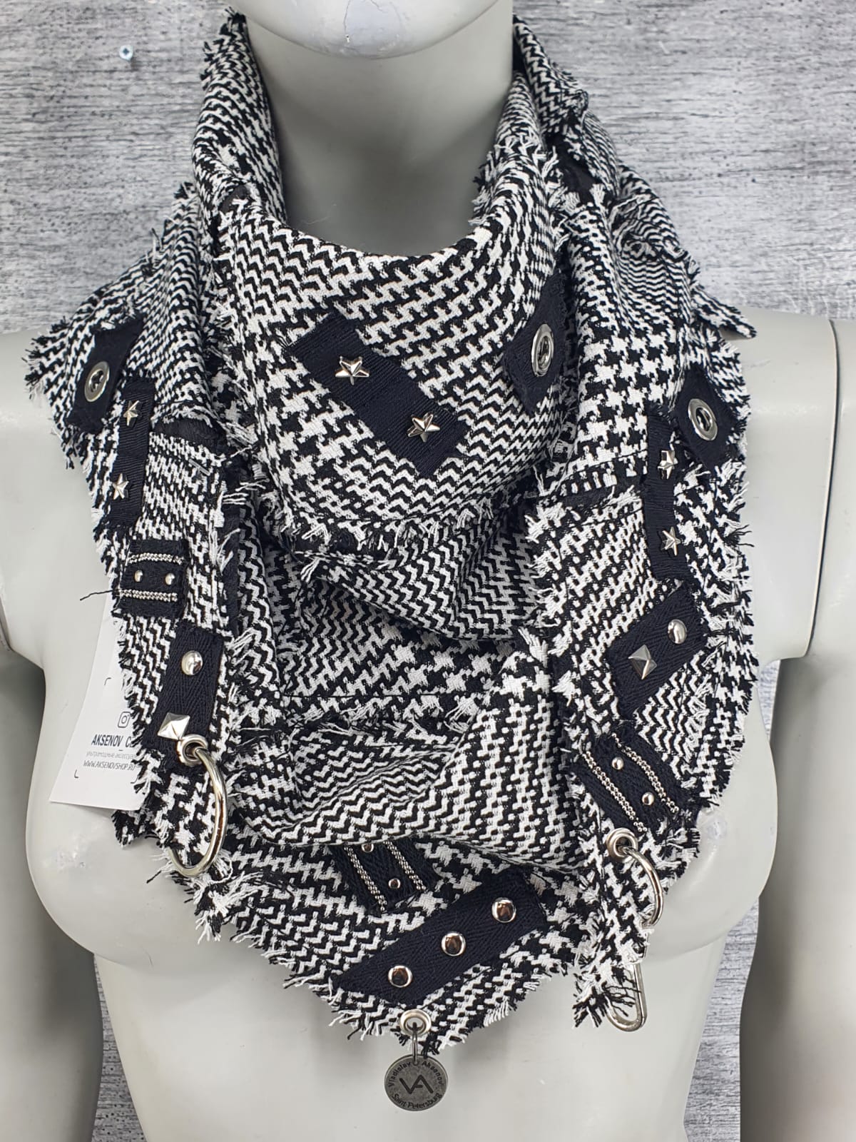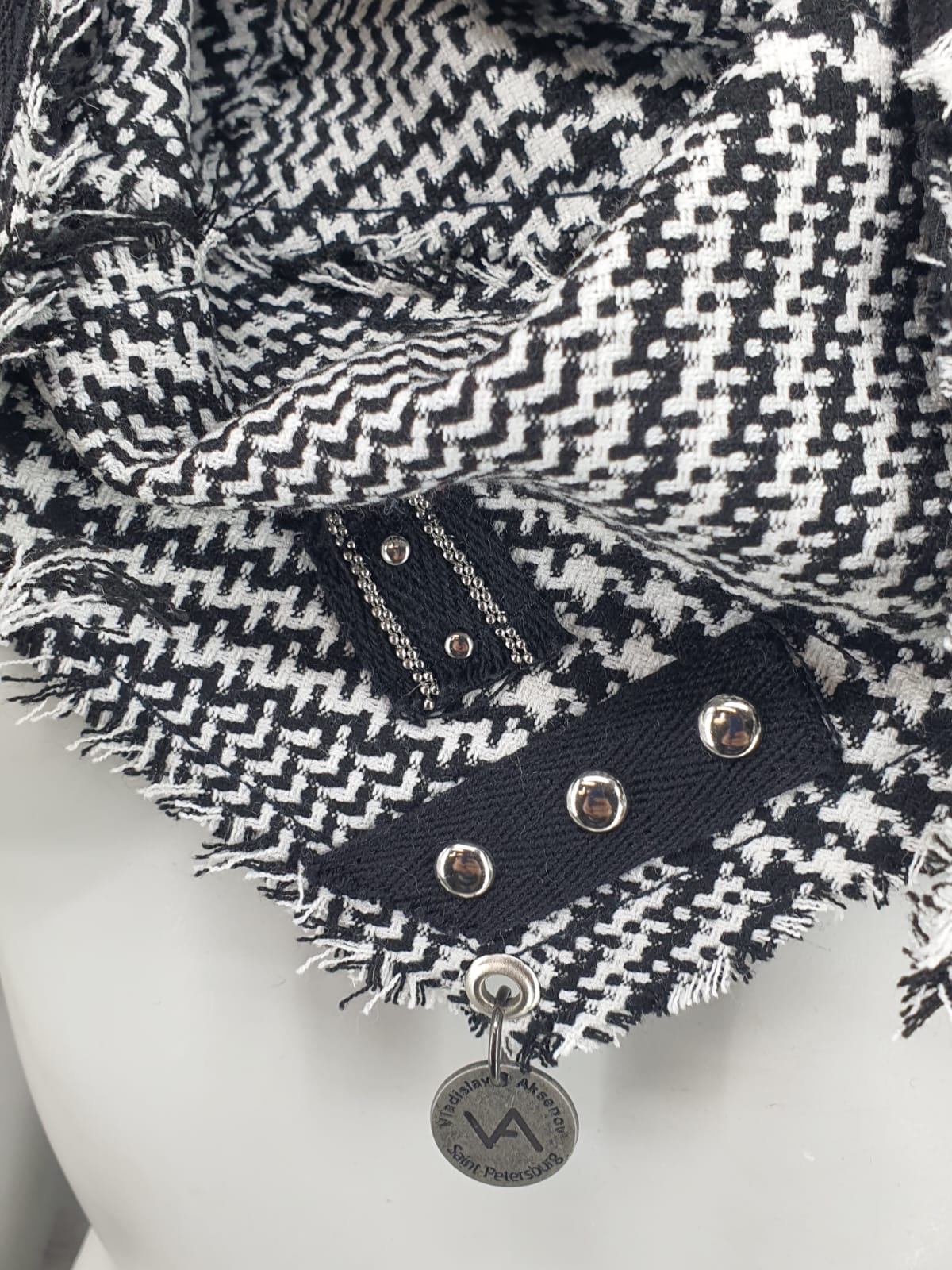 Шарф из чёрно-белой ткани на чёрной жаккардовой основе, декорирован разлтчной лентой с металлическими элементами.