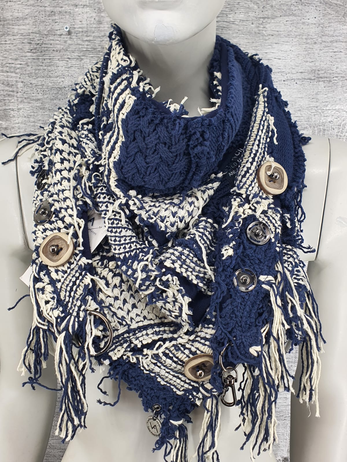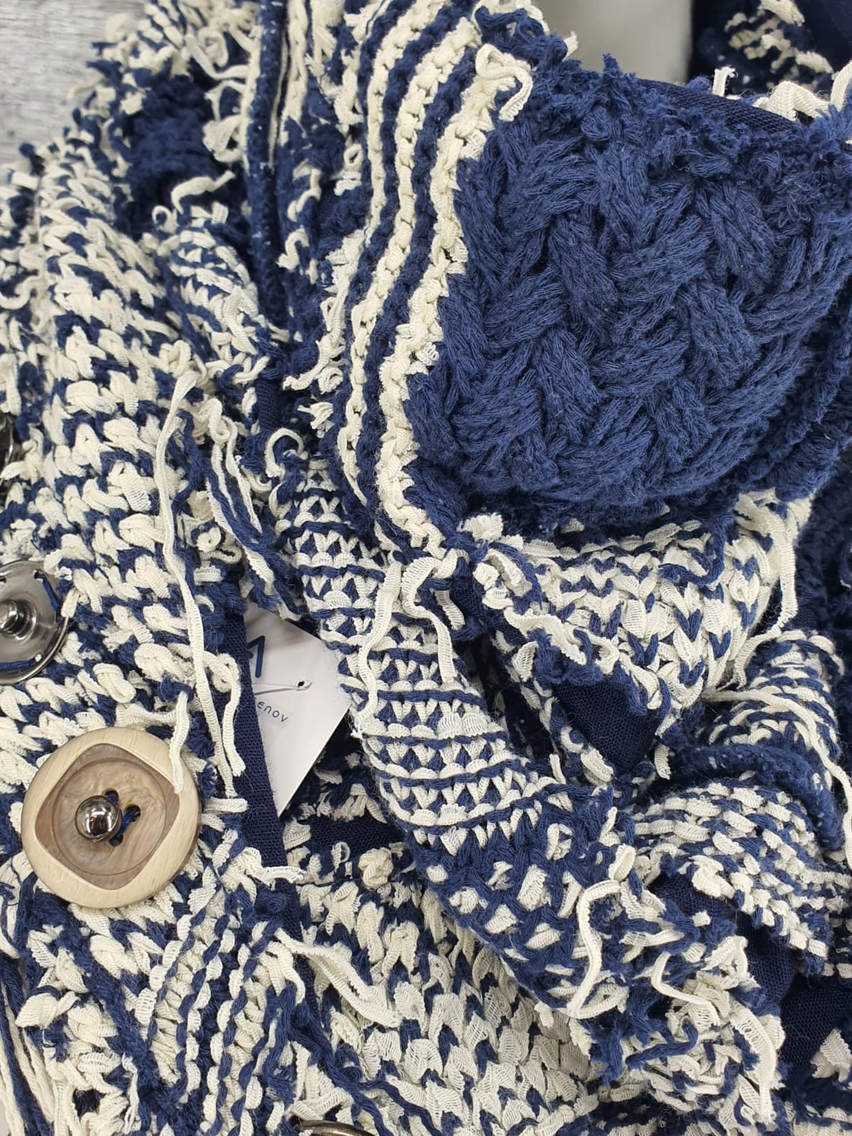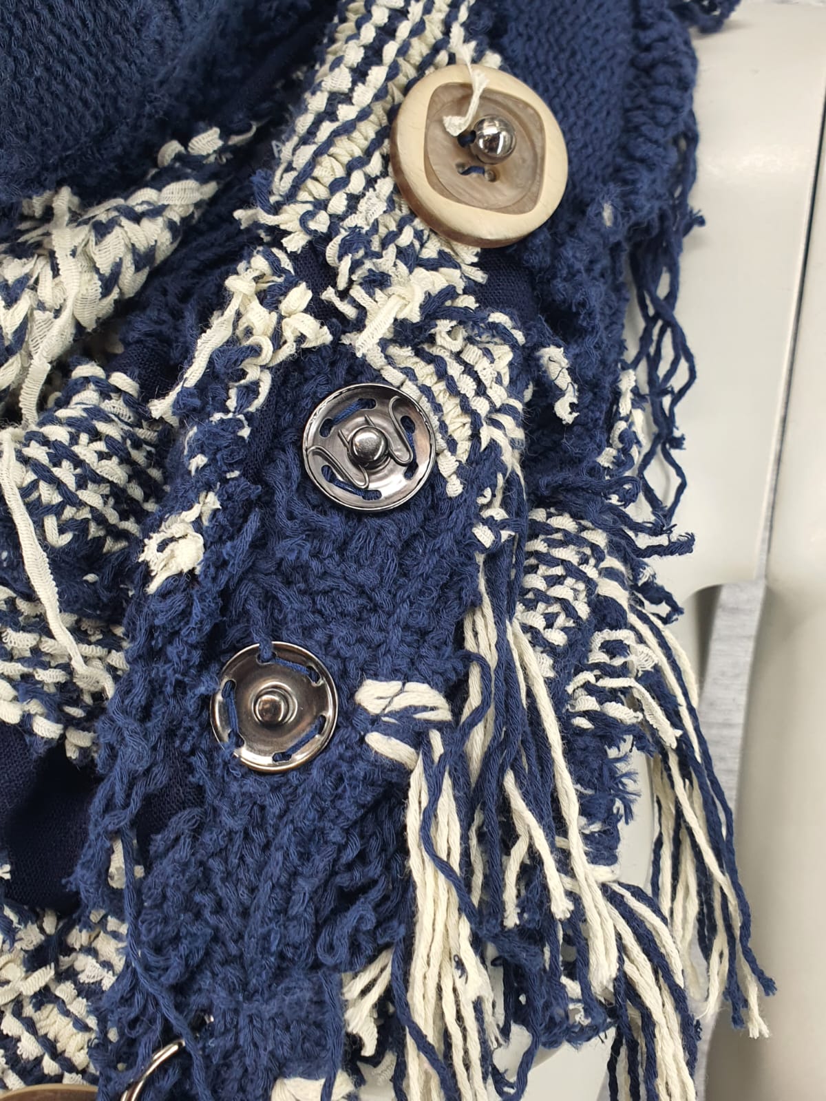 Шарф из джемпера на синей хлопковой основе, декорирован пуговицами и кнопками. Мягкий и уютный шарф будет лучшим подарком..