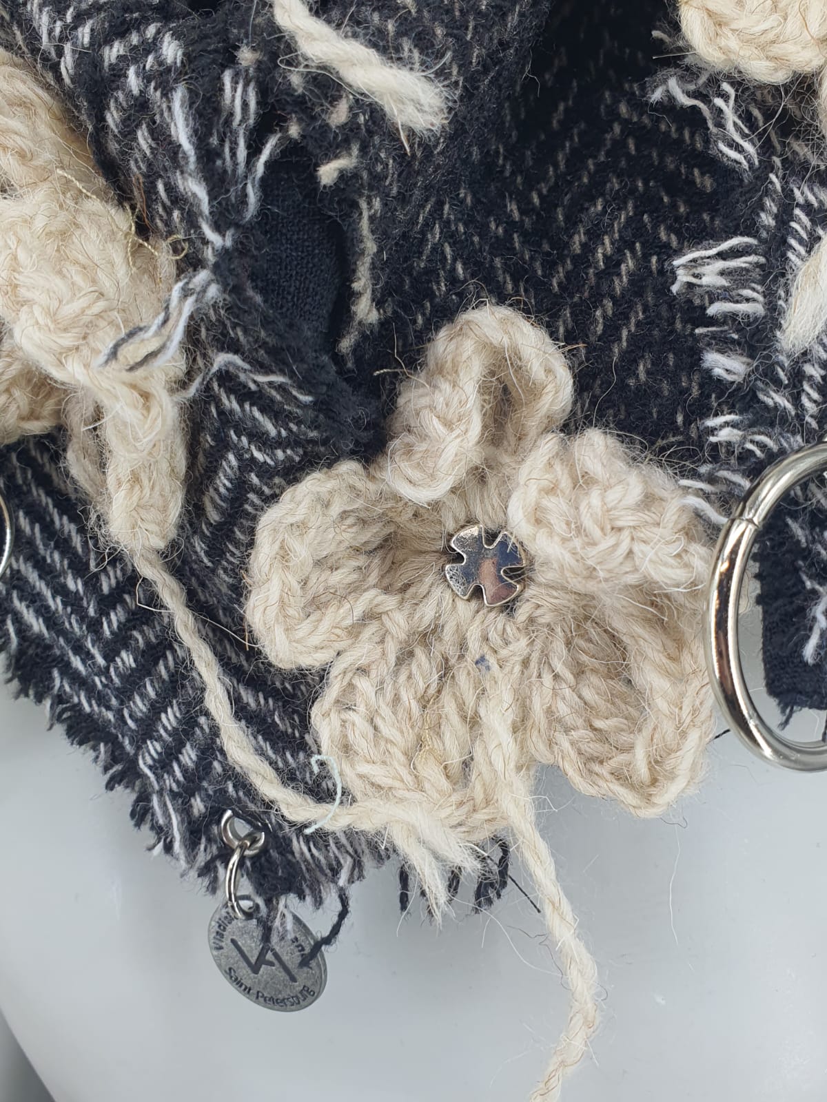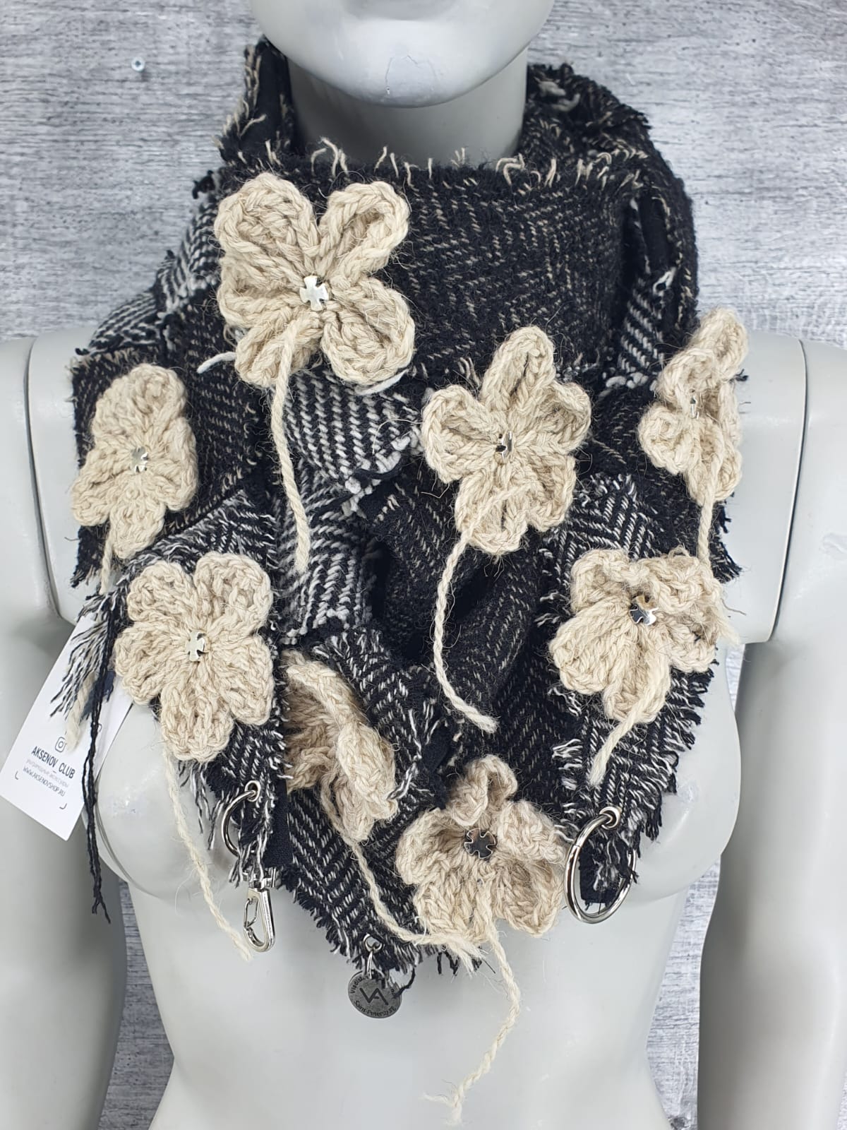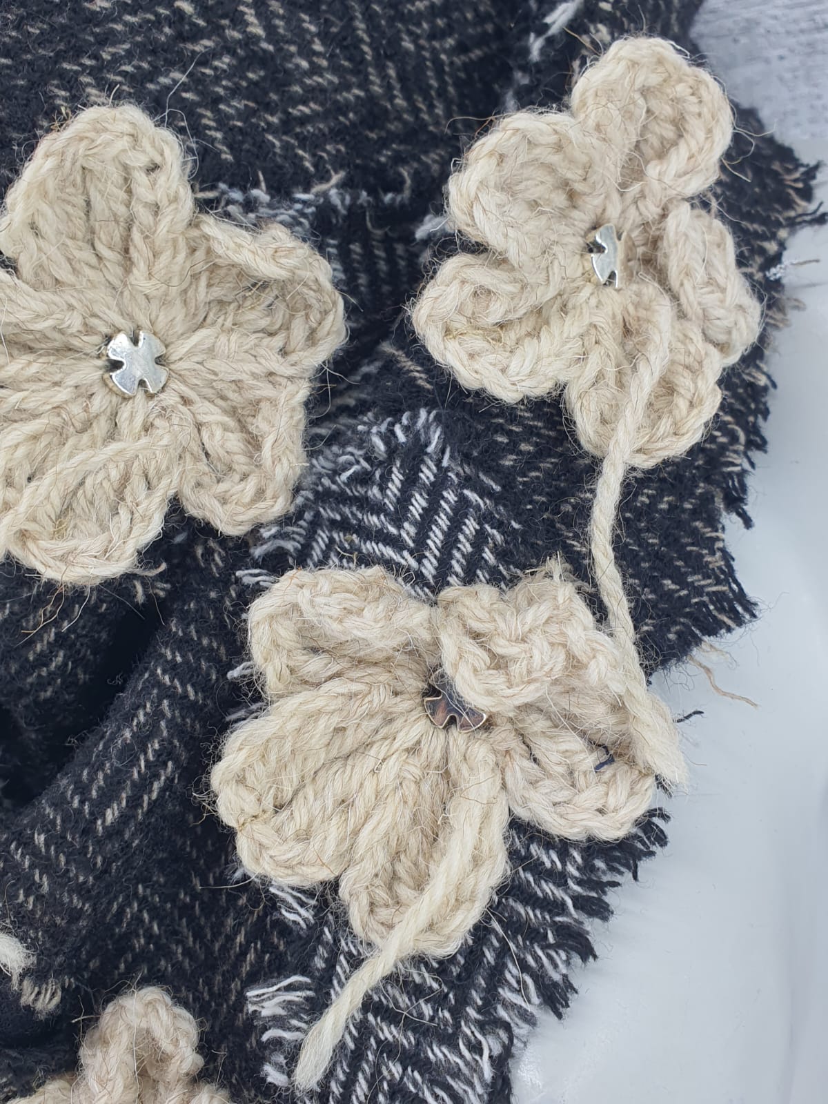 Шарф из шерстяной ткани в ёлочку на чёрной хлопковой основе, декорирован вязаными цветами.