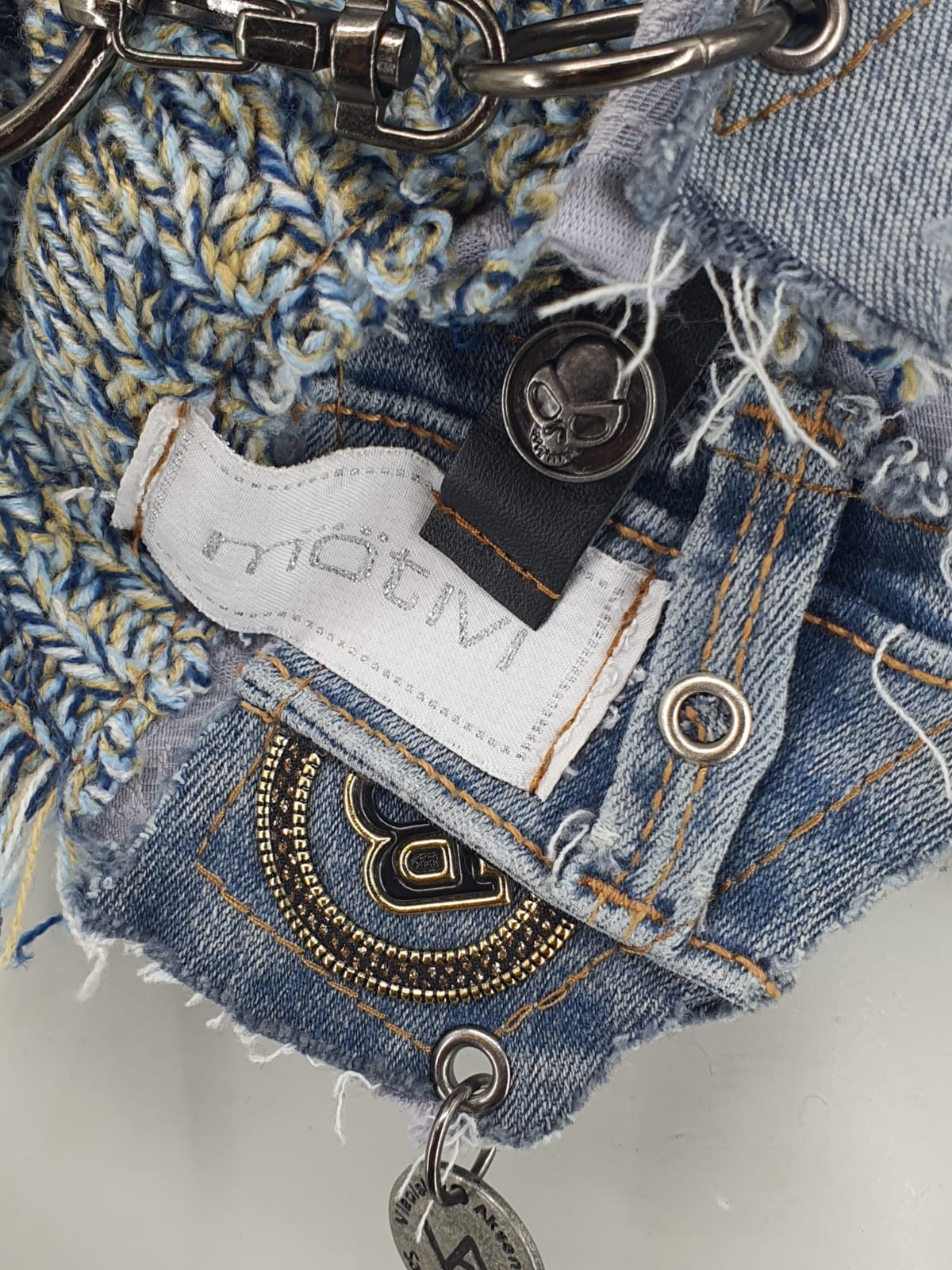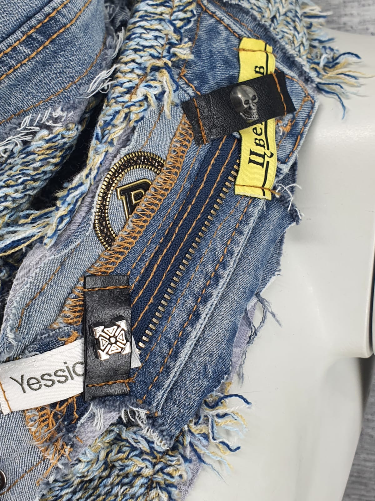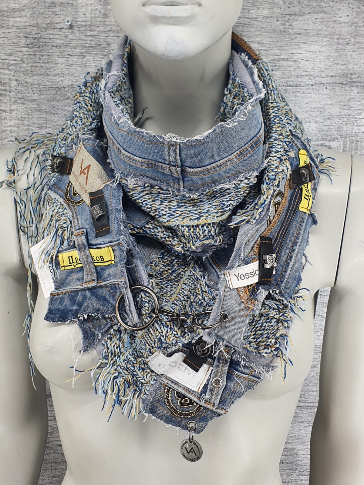 Шарф из джемпера и джинсов на голубой жаккардовой основе, декорирован наклейками и различными нашивками.
