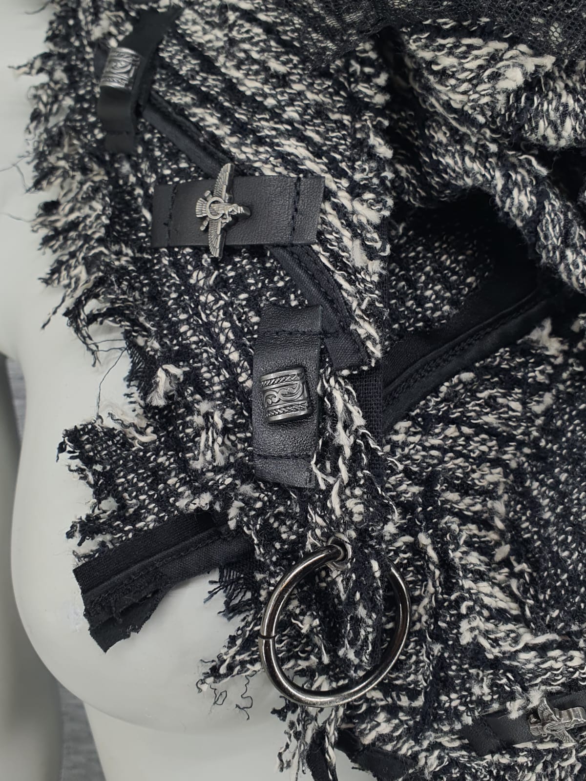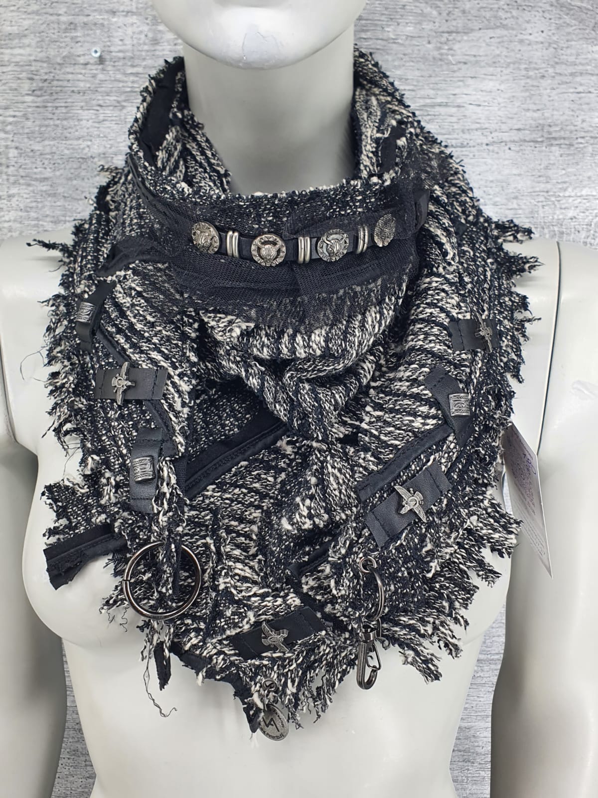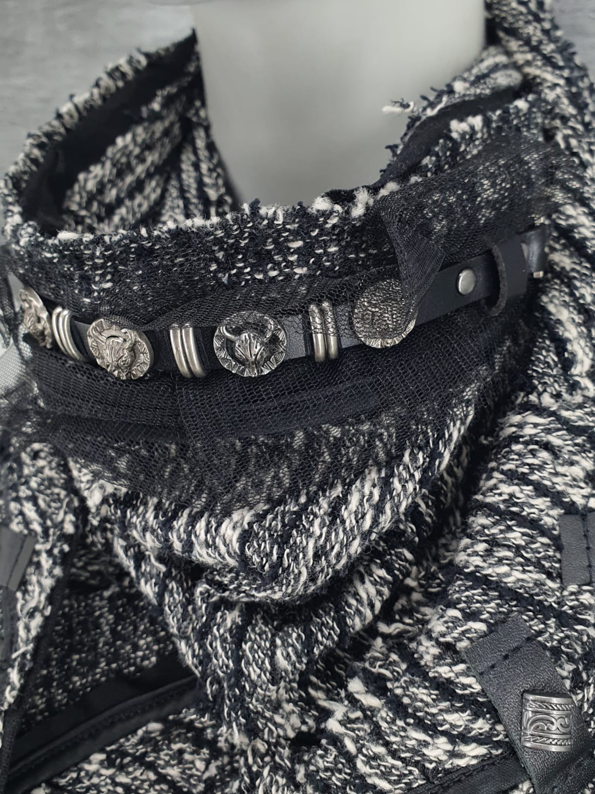 Шарф из серого жакета на чёрной хлопковой основе, декорирован кожаным браслетом с сеткой и нашивками.