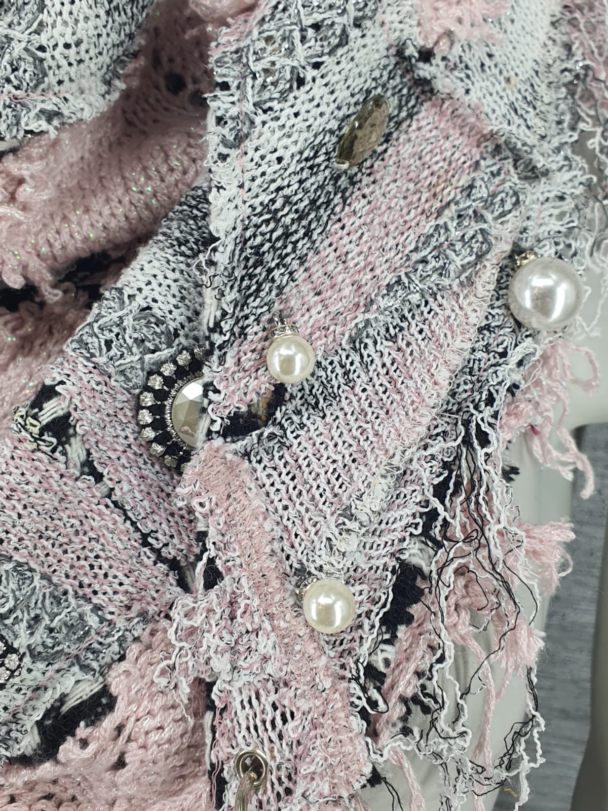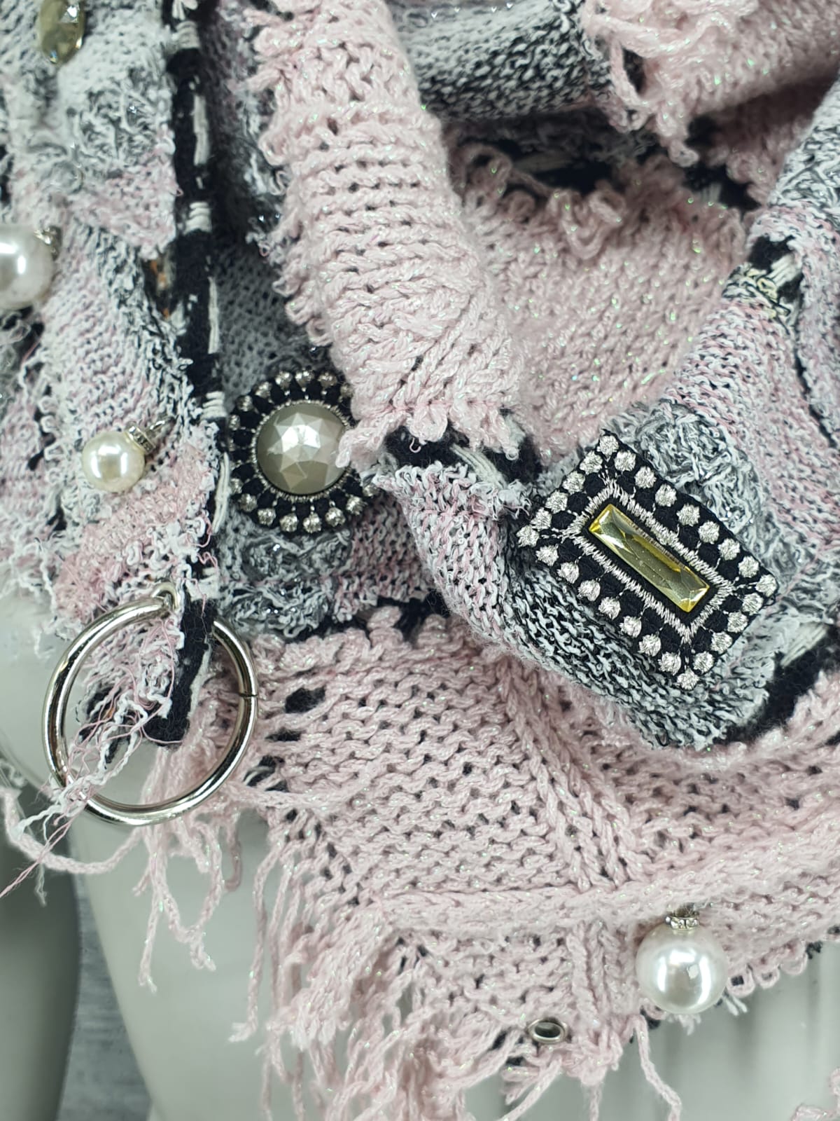 Шарф из розово-серого джемпера с люрексом на чёрно-белой основе из ткани "шанель" Декорирован перламутровыми бусинами. Создайте праздничный образ.