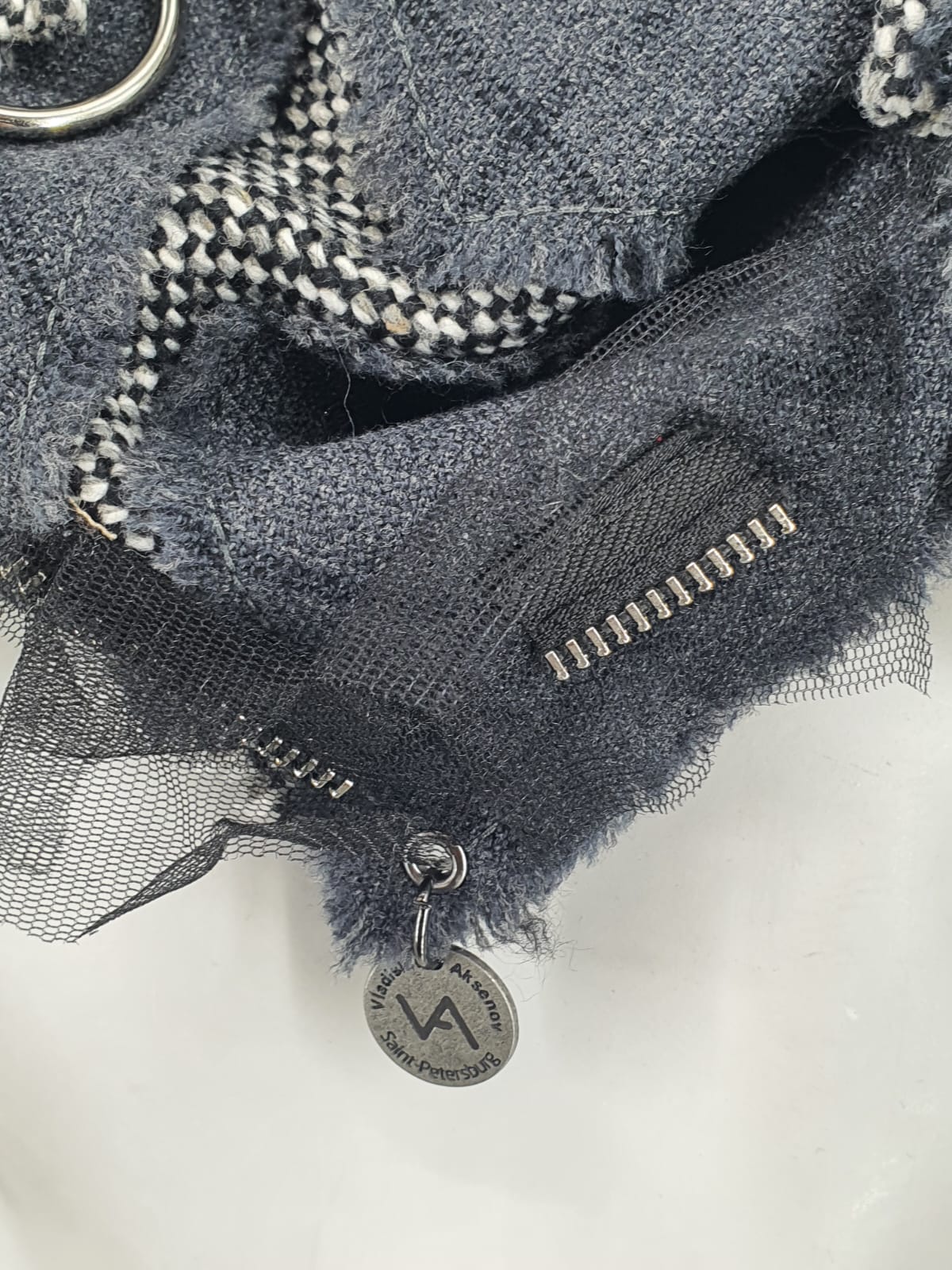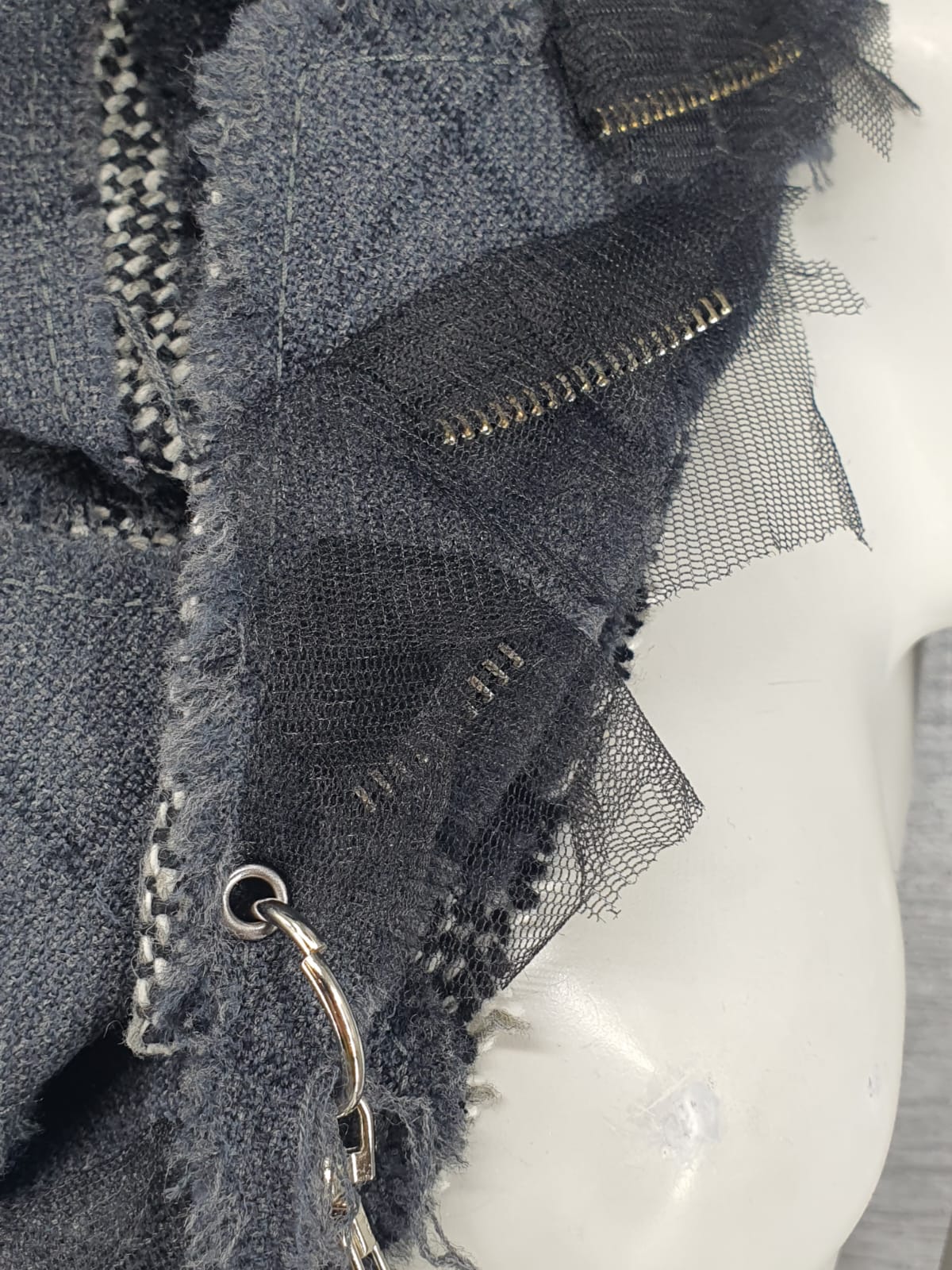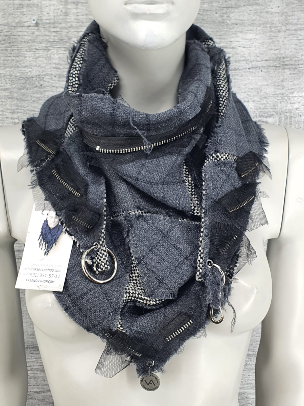 Шарф из серой ткани на твидовой основе, декорирован молниями и сеткой. Строгий, но возможны варианты!