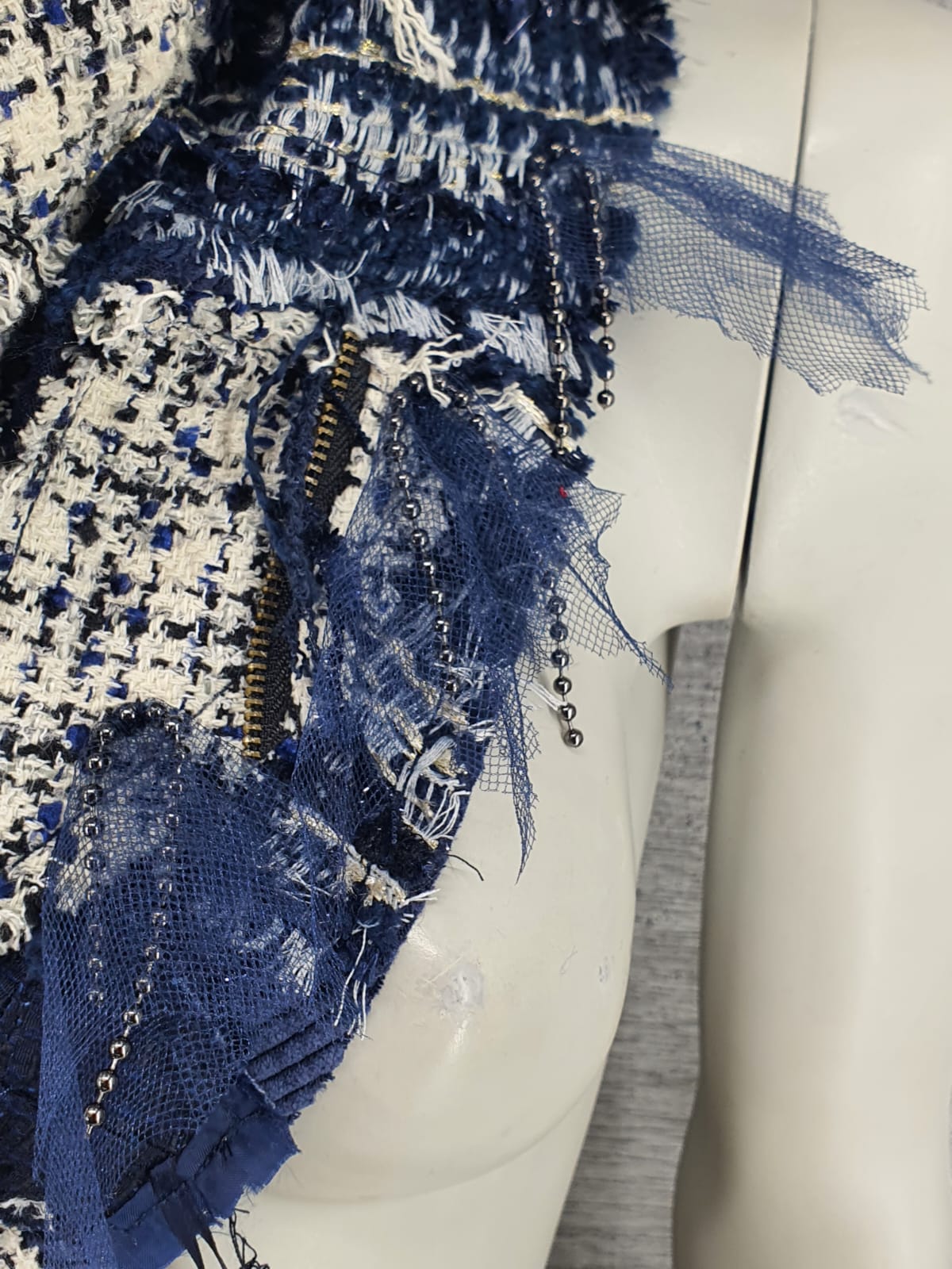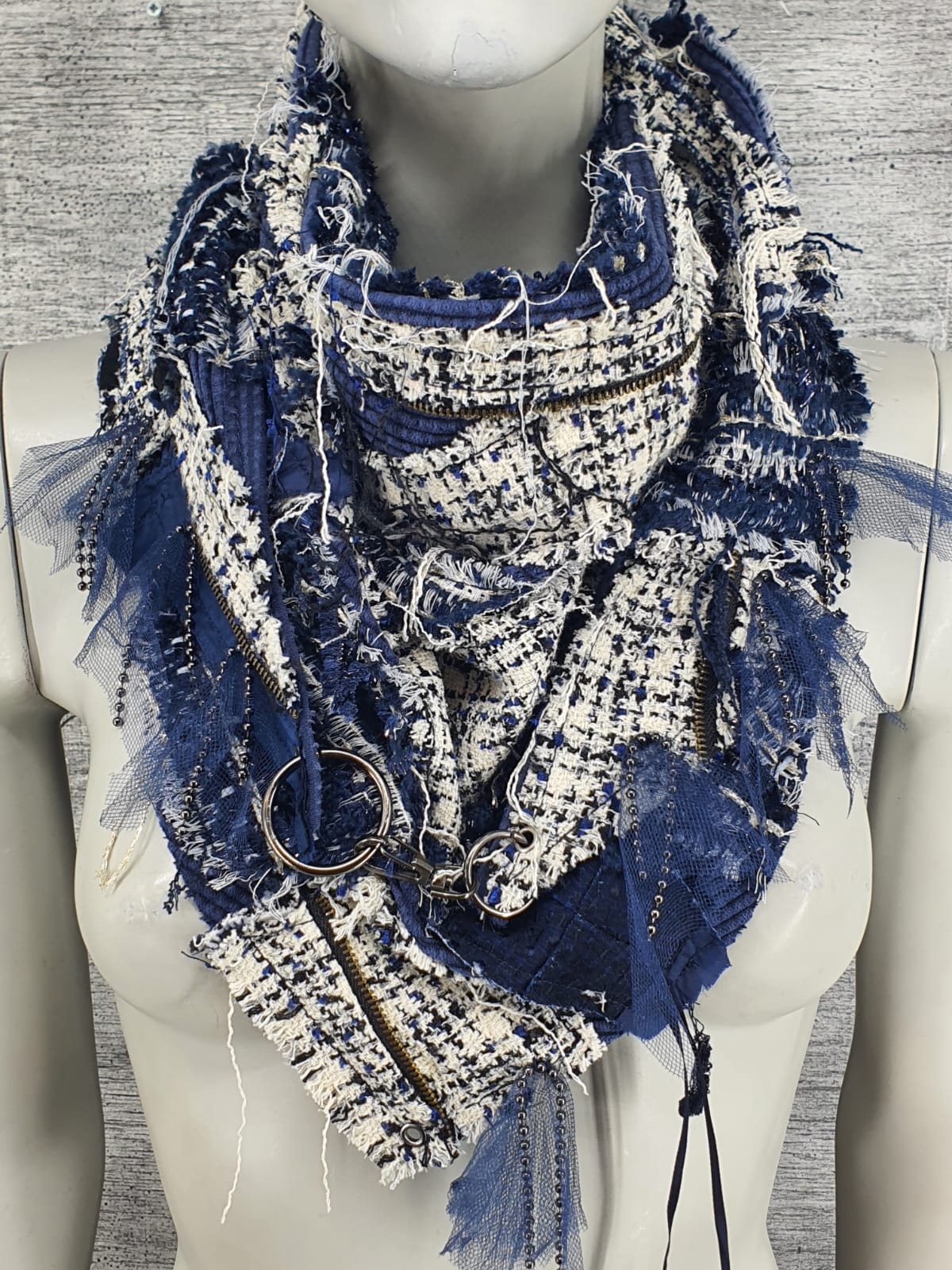 Шарф из жакетов в синих оттенках с добавлением люрекса на синей основе из микровельвета, декорирован цепочкой под сеткой и кнопками. Немного романтики!